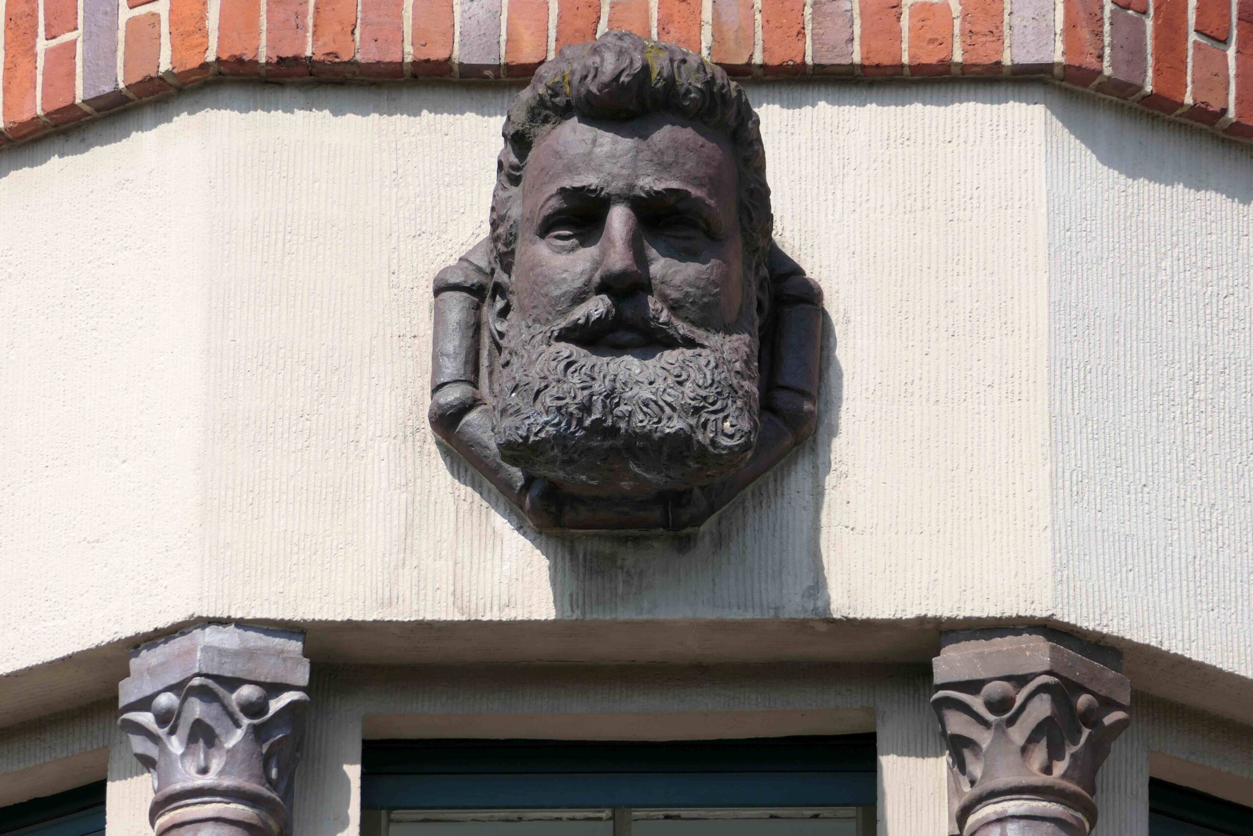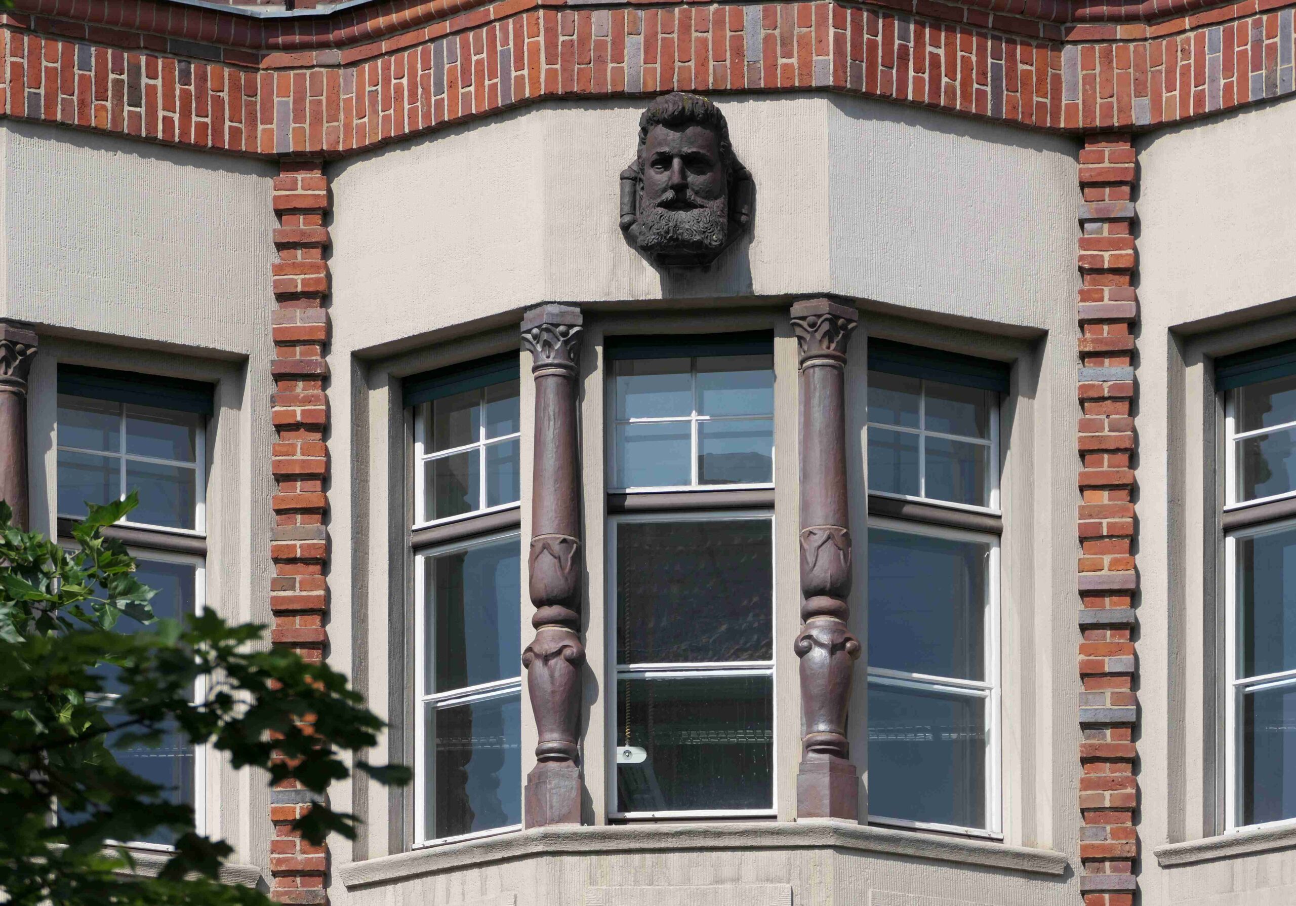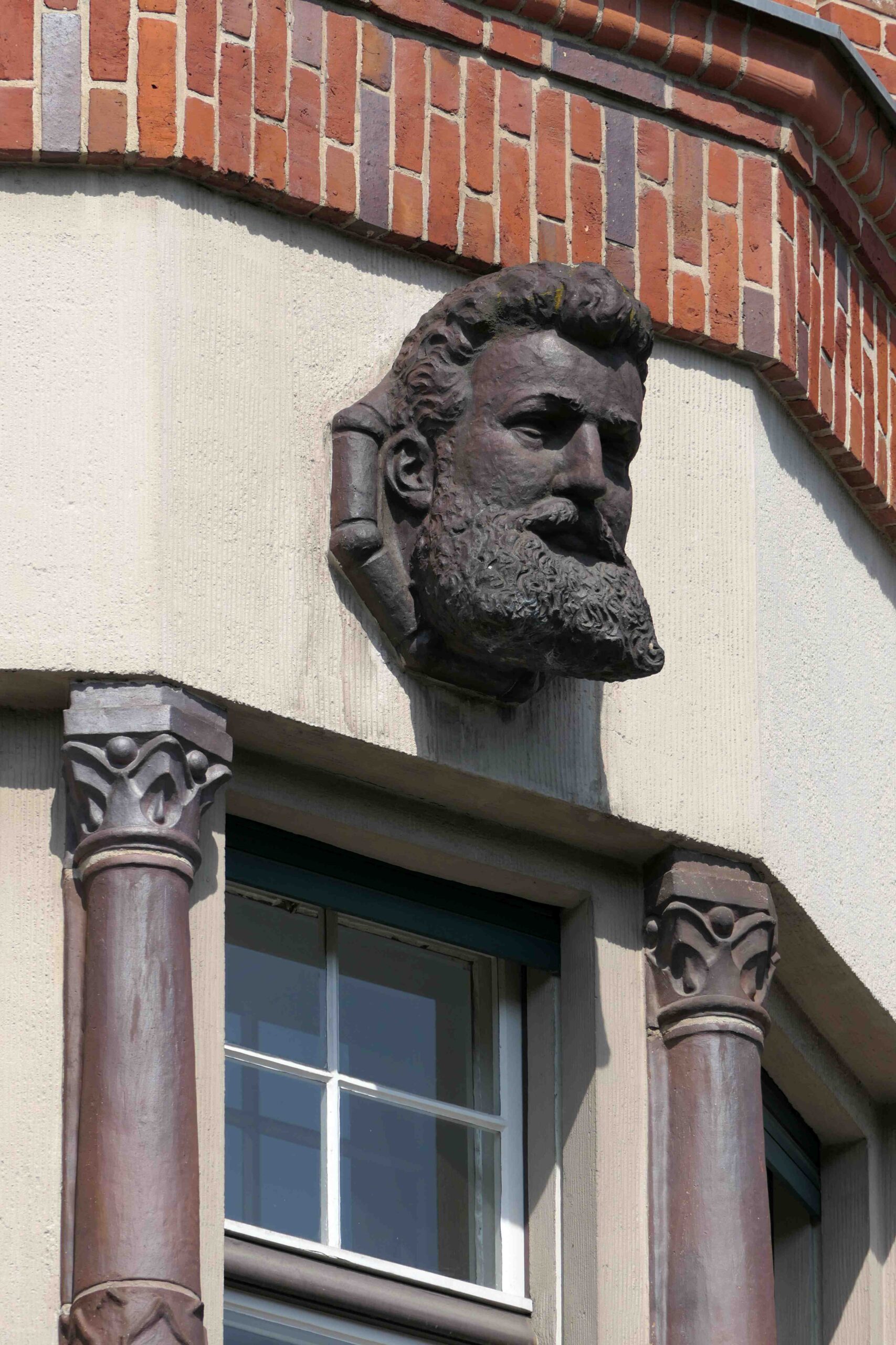 An dem 1934/35 erbauten Gebäudeteil des Bambergwerkes in der Bundesallee 87 ist nur der mittlere der drei Erker mit einer Büste verziert, Diese zeigt wahrscheinlich den Firmengründer Carl Bamberg, wie ein Vergleich des Portraits mit historischen Fotos von Carl Bamberg vermuten lässt (Nicola Vösgen).