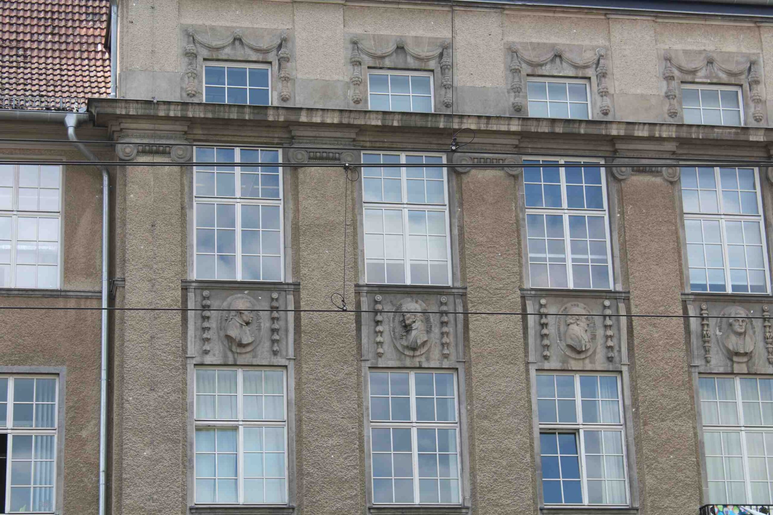 An dem vorgezogenen siebenachsigen Risalit des ehemaligen Real-Gymnasiums Karlshorst sind die Brüstungsfelder unterhalb des oberen Geschosses mit hochovalen Portraitmedaillons geschmückt. Die dargestellten Persönlichkeiten sind durch umlaufende, vertieft angebrachte Inschriften bezeichnet. Es handelt sich um folgende sieben Darstellungen (v.l.n.r.): IMMANVEL KANT, KARL FRIEDRICH GAUSZ, FREIHERR VON VND ZUM STEIN, MARTIN LUTHER, ALEXANDER VON HUMBOLDT, FRIEDRICH v. SCHILLER und WOLFGANG v. GOETHE (Nicola Vösgen).