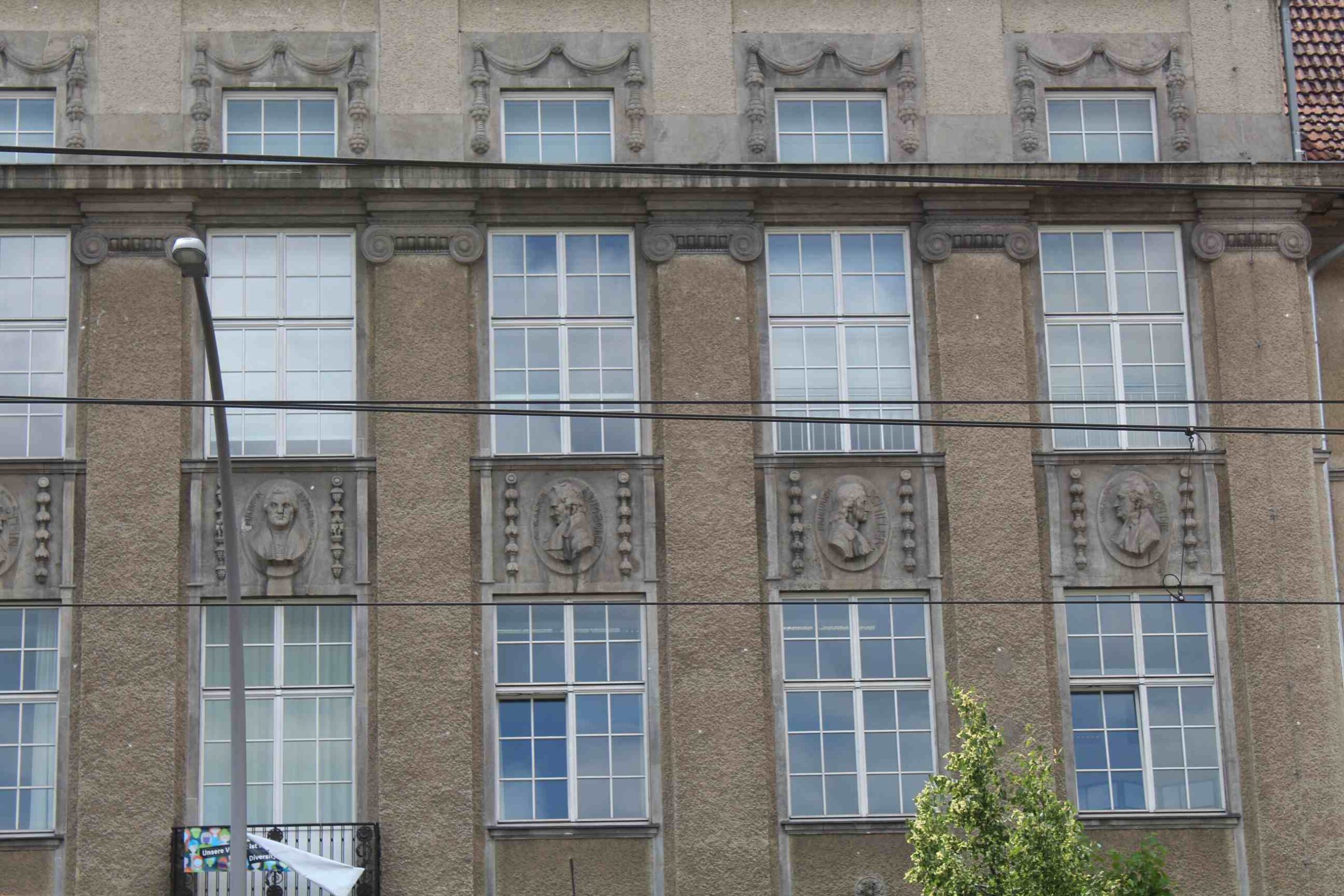 An dem vorgezogenen siebenachsigen Risalit des ehemaligen Real-Gymnasiums Karlshorst sind die Brüstungsfelder unterhalb des oberen Geschosses mit hochovalen Portraitmedaillons geschmückt. Die dargestellten Persönlichkeiten sind durch umlaufende, vertieft angebrachte Inschriften bezeichnet. Es handelt sich um folgende sieben Darstellungen (v.l.n.r.): IMMANVEL KANT, KARL FRIEDRICH GAUSZ, FREIHERR VON VND ZUM STEIN, MARTIN LUTHER, ALEXANDER VON HUMBOLDT, FRIEDRICH v. SCHILLER und WOLFGANG v. GOETHE (Nicola Vösgen).