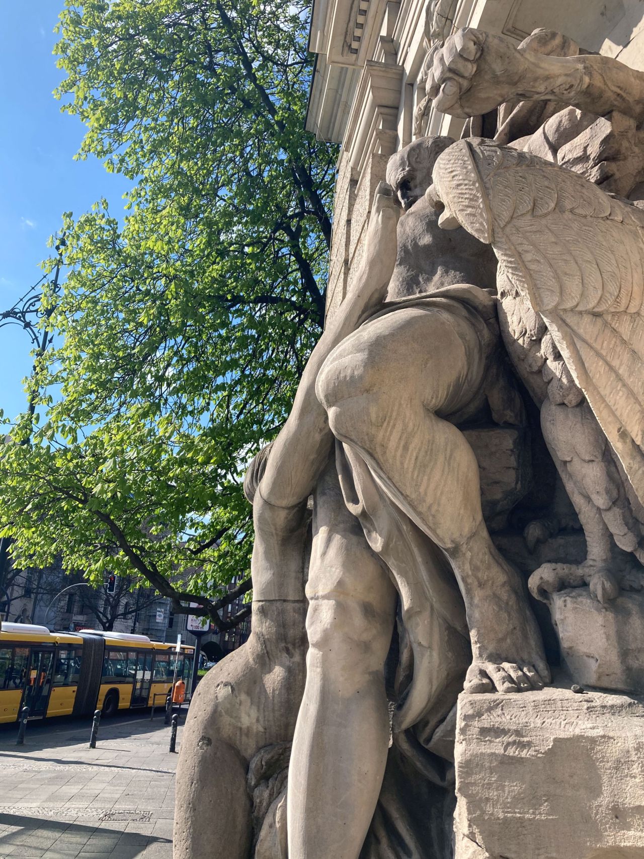 Der Prometheus-Brunnen wurde 1902 von Emil Hundrieser als Bauplastik an der Fassade der Königlich Preußischen Hochschule für bildende Künste fertiggestellt. Das neobarocke Gebäude der Hochschule wurde von den Architekten Kaiser und von Großheim geplant und von 1899 bis 1902 gebaut. Für die Fassade wurden zwei bauplastische Brunnen gefertigt, der Prometheus-Brunnen, als Verweis auf die Technische Hochschule, und der Orpheus-Brunnen, als Verweis auf die Musikhochschule. Emil Hundrieser arbeitete ab 1901 im Auftrag der Akademie der Künste an dem monumentalen Brunnen, in dessen Mittelpunkt der überlebensgroße, aus der griechischen Mythologie stammende, Titan Prometheus steht. Laut dem von Hesiod erzählten Mythos brachte Prometheus den Menschen das Feuer, obwohl Zeus dies verboten hatte. Zur Strafe für seinen Ungehorsam wurde er an einen Felsen des Kaukasus geschmiedet und täglich von einem Adler angegriffen, der sich an Prometheus´ Leber gütlich tat. Dieses Leiden hielt Hundrieser in der Bauplastik fest: Prometheus an Gestein gefesselt, mit angespannten Muskeln und stoischem Blick erwartet er die nächste Attacke des, ihn belauernden, Adlers. Beweint wird er von zwei Okeaniden, Töchter des Okeanos, Schöpfer der Flüsse und des Meeres. Nach Bombeneinschlägen während des 2. Weltkrieges in das Gebäude der Hochschule, war der Brunnen nur noch fragmentarisch erhalten und wurde 1987 restauriert. Mehrere Teile der Bauplastik wurden ergänzt: der Kopf der rechten Okeanide, ihr rechter Arm und Fuß, Prometheus´ rechter Unterschenkel, linkes Bein und linker Unterarm, sowie Teile der Stoffdraperie und Schnabel und Teile der Flügel des Adlers. Der Pavillon mit dem Pendant, dem Orpheus-Brunnen von Ernst Herter, wurde nach dem Krieg abgerissen. Die stark beschädigte Skulpturengruppe, bestehend aus Orpheus, einem Reh und einem Löwen, wurde in den Berliner Stadtteil Wedding in einen Park umgesetzt und ist dort dem Verfall ausgesetzt (Rebecca Daniel).