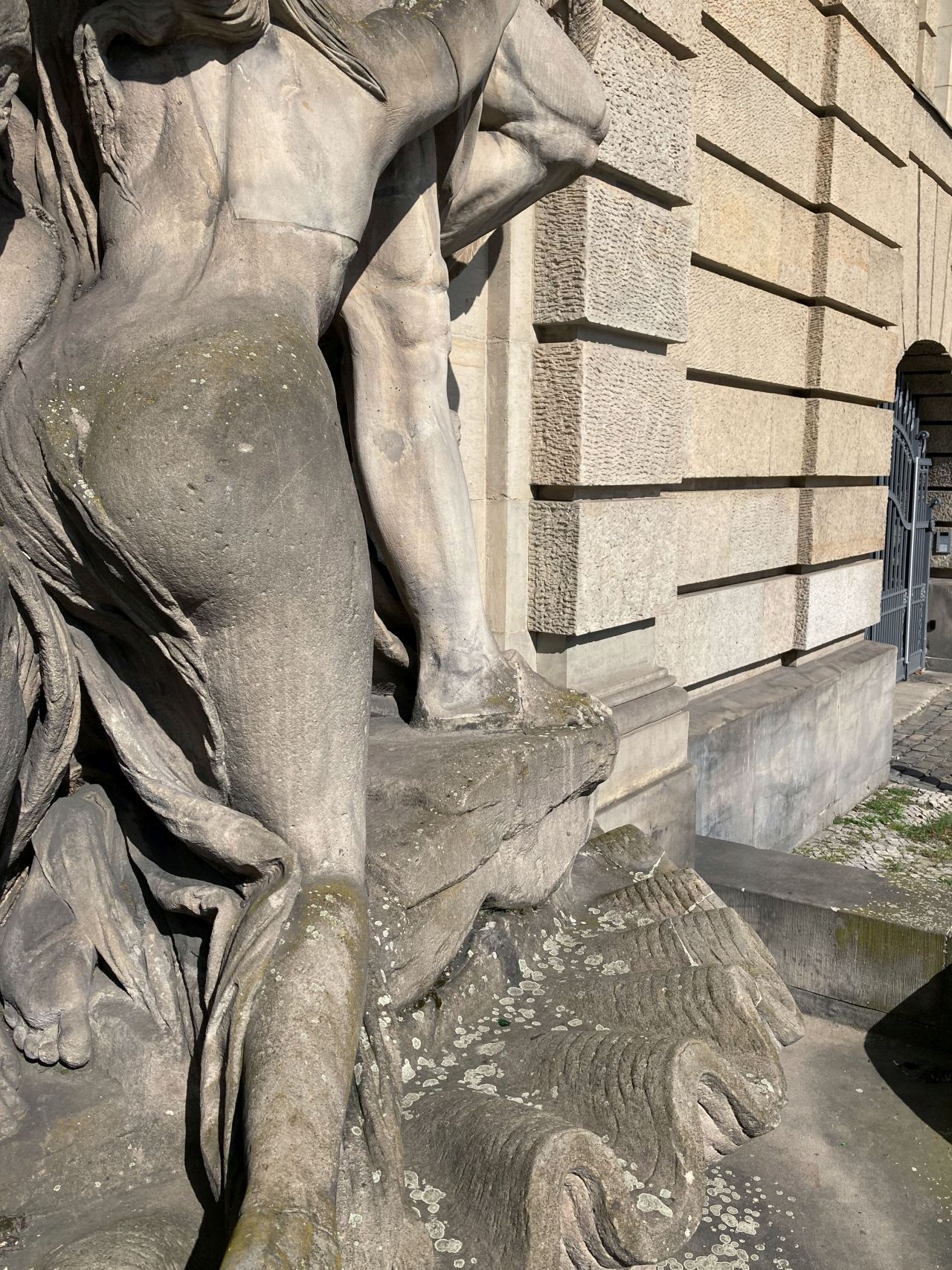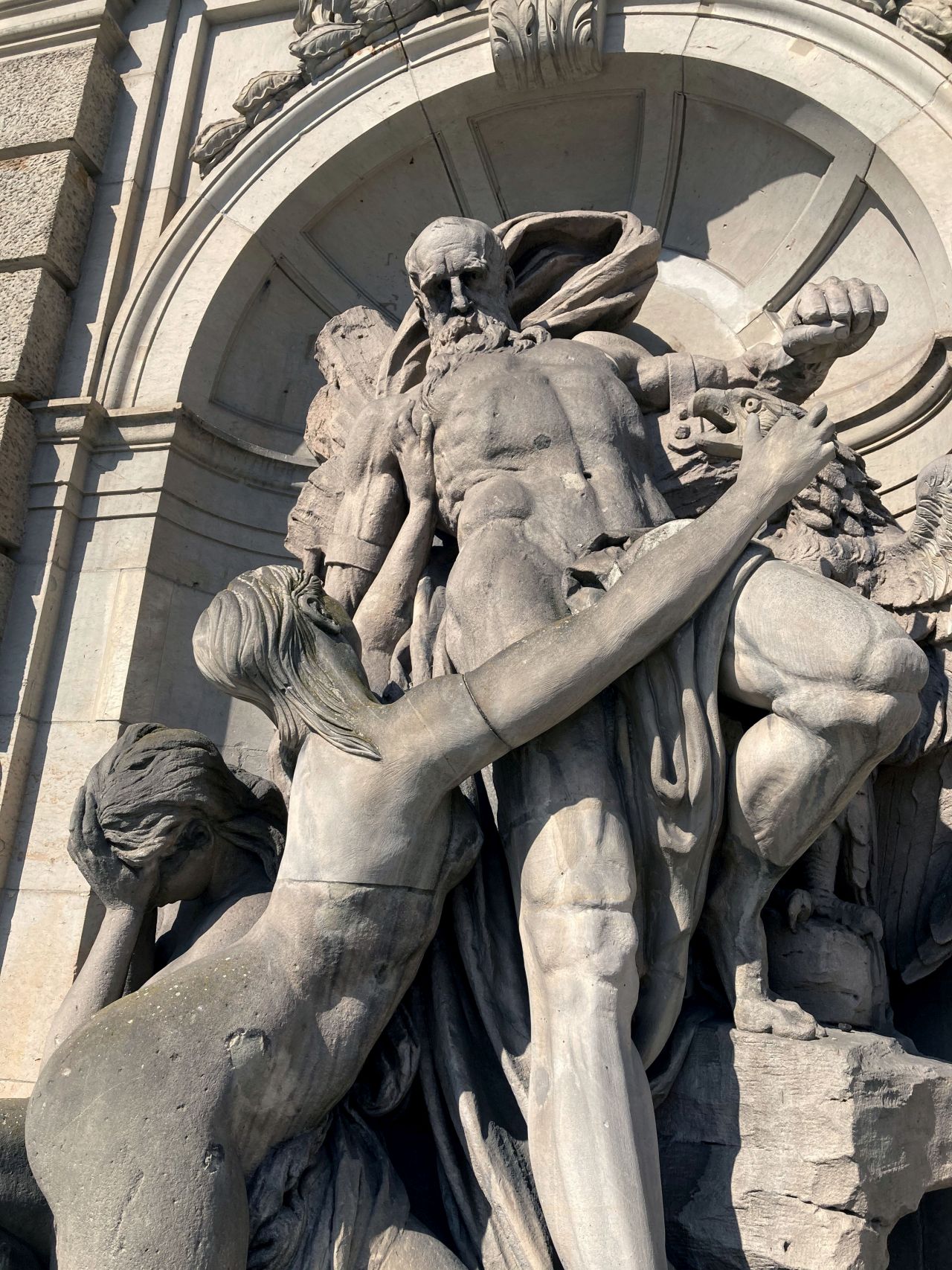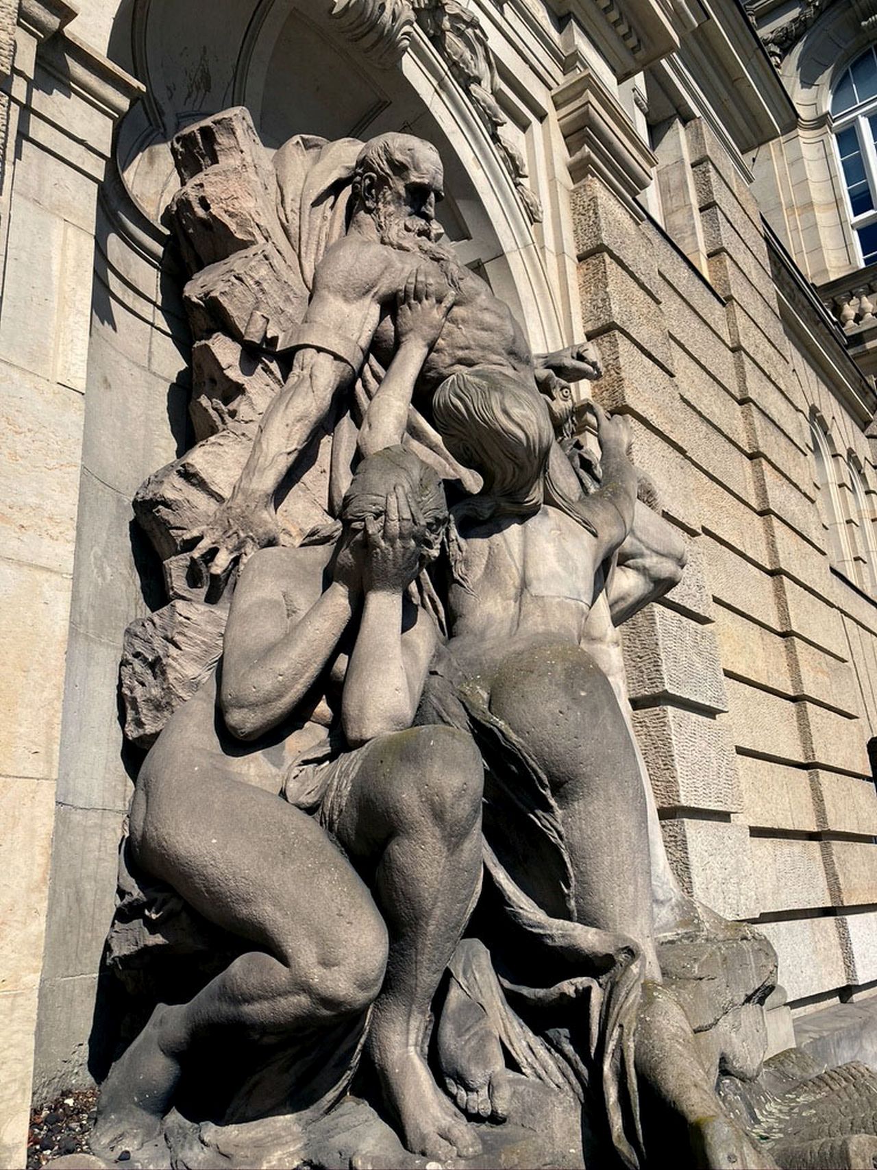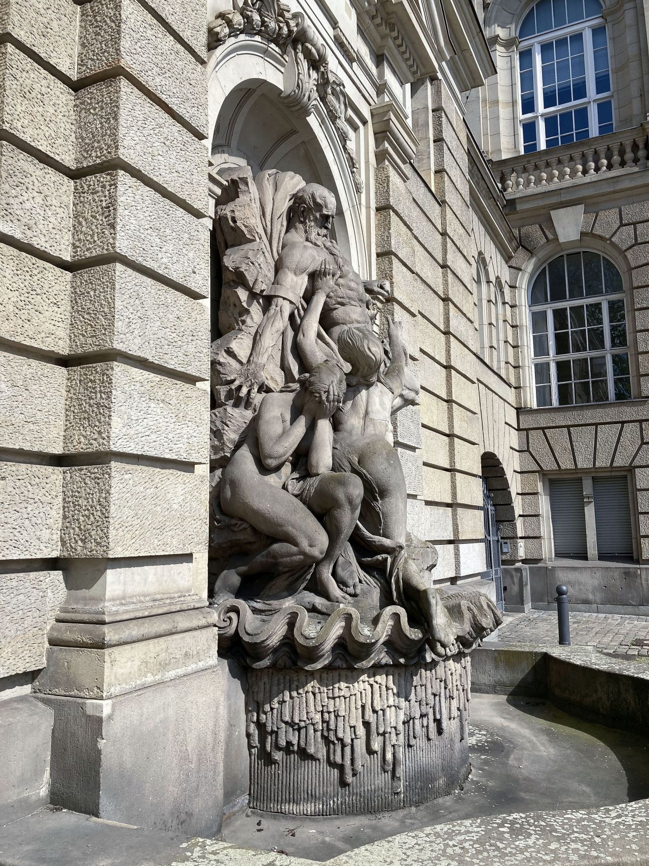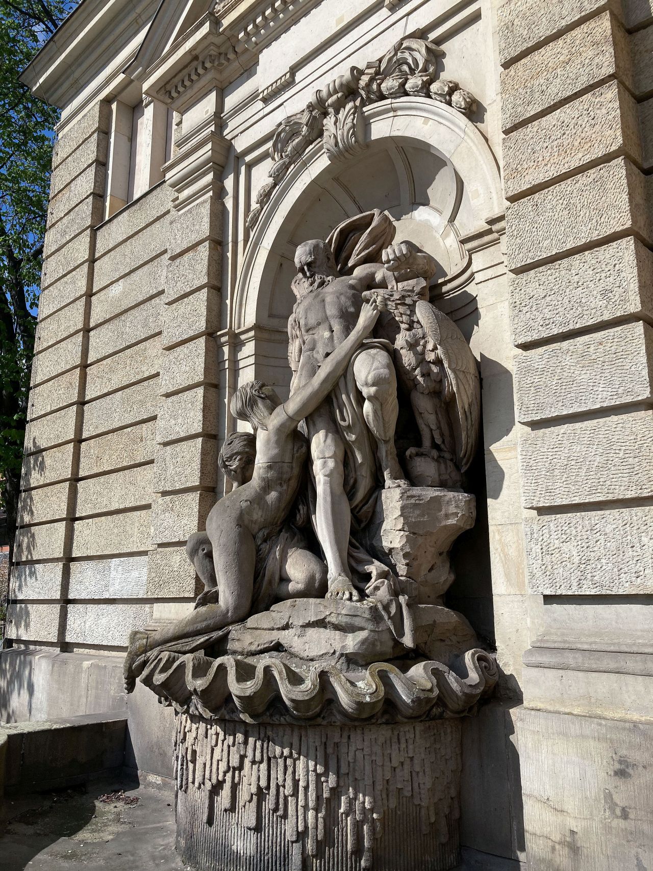 Der an den Felsen des Kaukasus geschmiedete Prometheus steht im Zentrum der Bauplastik. Er versucht sich mit angespanntem Körper aus seinen Fesseln zu lösen. Zu seiner Linken belauert ihn ein Adler mit geöffneten Schwingen, bereit sich auf ihn zu stürzen. Zu seiner Rechten betrauern ihn zwei üppig modellierte Okeaniden. Während sich eine, mit vor den gesenkten Kopf geschlagenen Händen, von Prometheus abgewandt hat, beugt sich die andere zu ihm und streckt den rechten Arm über seine Brust in die Richtung des Vogels. Ein gerundetes Brunnenbecken umschließt die in einer Rundbogennische in der Fassade eingepasste Monumentalbauplastik (Rebecca Daniel).