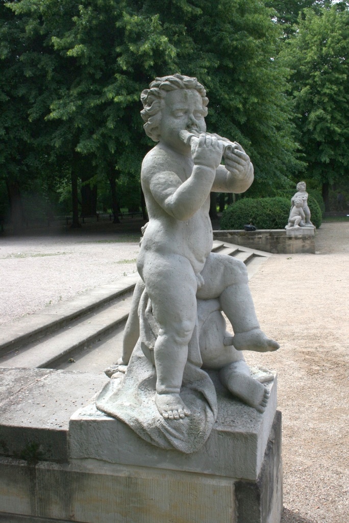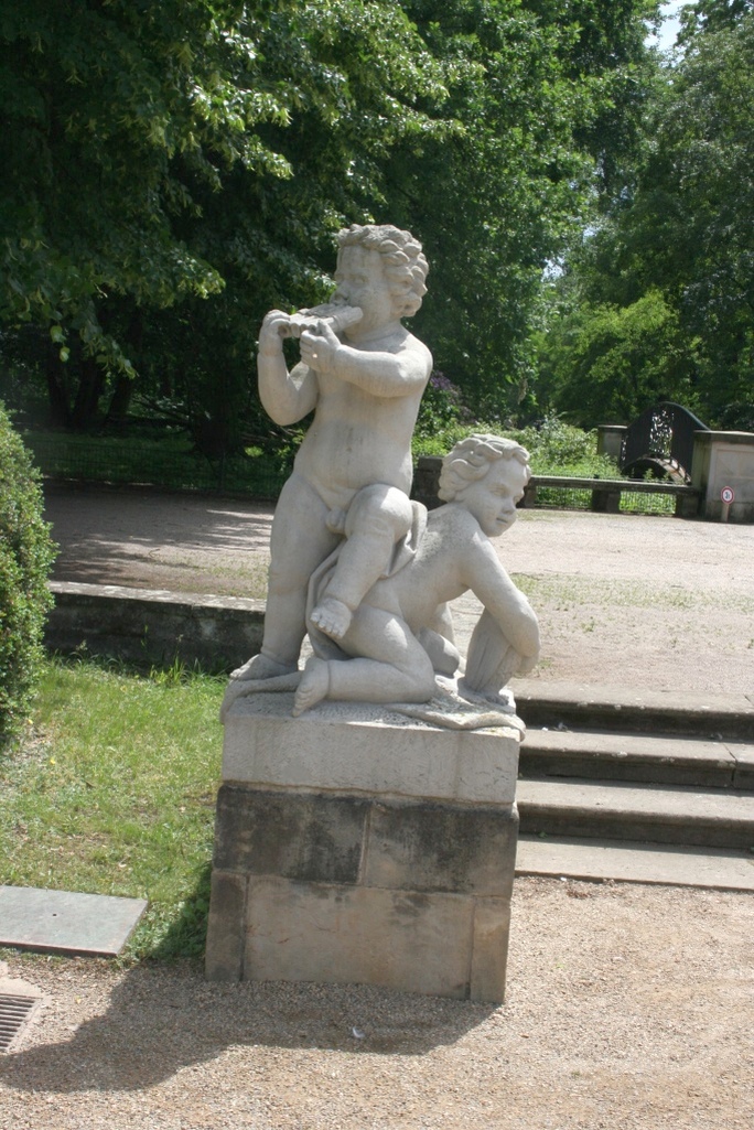 "Am Ausgang des Südparterres auf den Wangen der Treppe sind zwei Puttengruppen aus Sandstein, wiederum aus Gerhard Benschs Bildhauer-Kollektiv stammend, postiert. Die Nackedeis von barocken Körperformen - auf das Schloß abgestimmt - halten Symbole der Kunst (Theater, Musik) und Wissenschaft (Eule!) in ihren Händen, um darauf hinzuweisen, daß der Tierpark sich als Kulturzentrum neben Wissenschaft auch für die schönen Künste versteht. Lustigerweise hält das eine Knäblein seine Panflöte in doppelter Hinsicht falsch an die Lippen. Die beiden Gruppen wurden 1956 aufgestellt" (Heinrich Dathe, 1980, S. 12-13). "Anschließend seien noch Kunstwerke vorgestellt, für die bislang selbst z. T. mit Hilfe von Presserecherchen keine Autorenschaft zu ermitteln war. So finden wir an der Pelikan-Anlage zwei Sandstein-Puttengruppen, die nach der Restaurierung in Berliner Werkstätten unter Leitung von Gerhard Bensch (...) im Jahre 1956 aufgestellt wurden. Eine Gruppe symbolisiert (...) Musik und Wissenschaft" (E. Matthies, 2009, S. 70). Die Texte lassen verschiedene Entstehungsszenarien zu. Vermutlich handelt es sich bei beiden Gruppen um Nachschöpfungen nach barocken Vorbildern beziehungsweise nach im barockisierenden Sinne teilergänzten barocken Vorbildern (Jörg Kuhn).