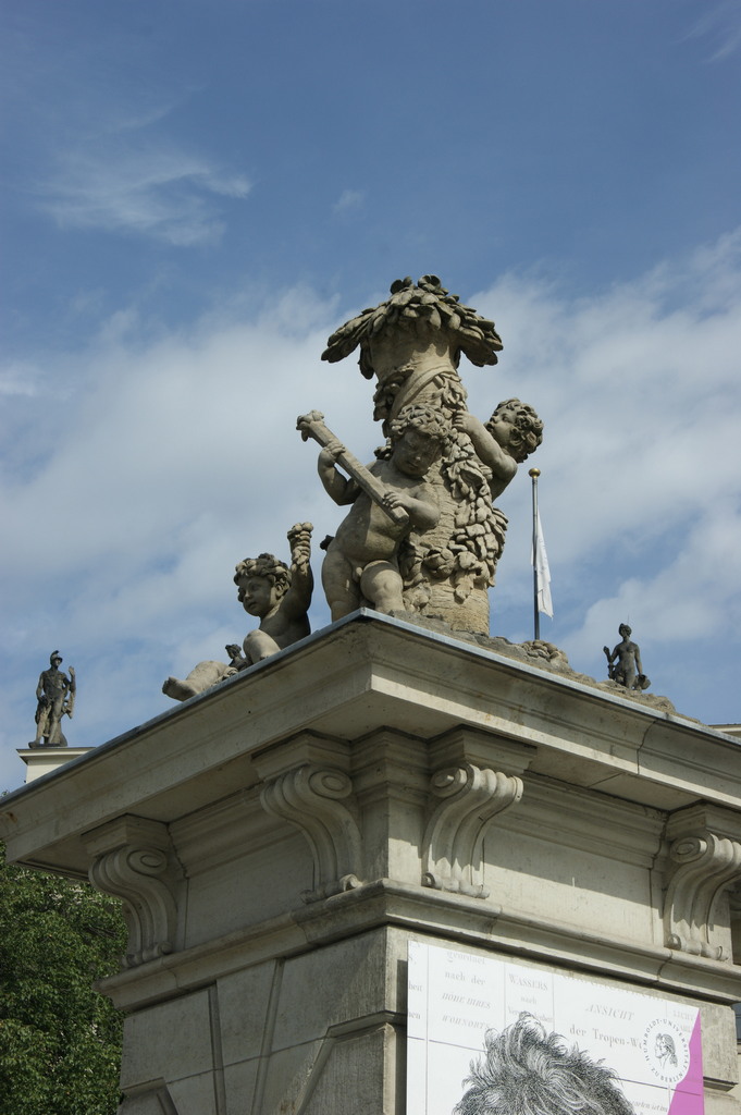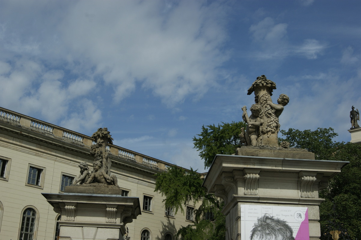 Auf den Wachhäuschen des Hauptportals im Ehrenhofgitter des ehemaligen Palais des Prinzen Heinrich (seit 1810 Teil der Berliner Universität (HU Berlin) Unter den Linden haben sich barocke Puttengruppen erhalten.