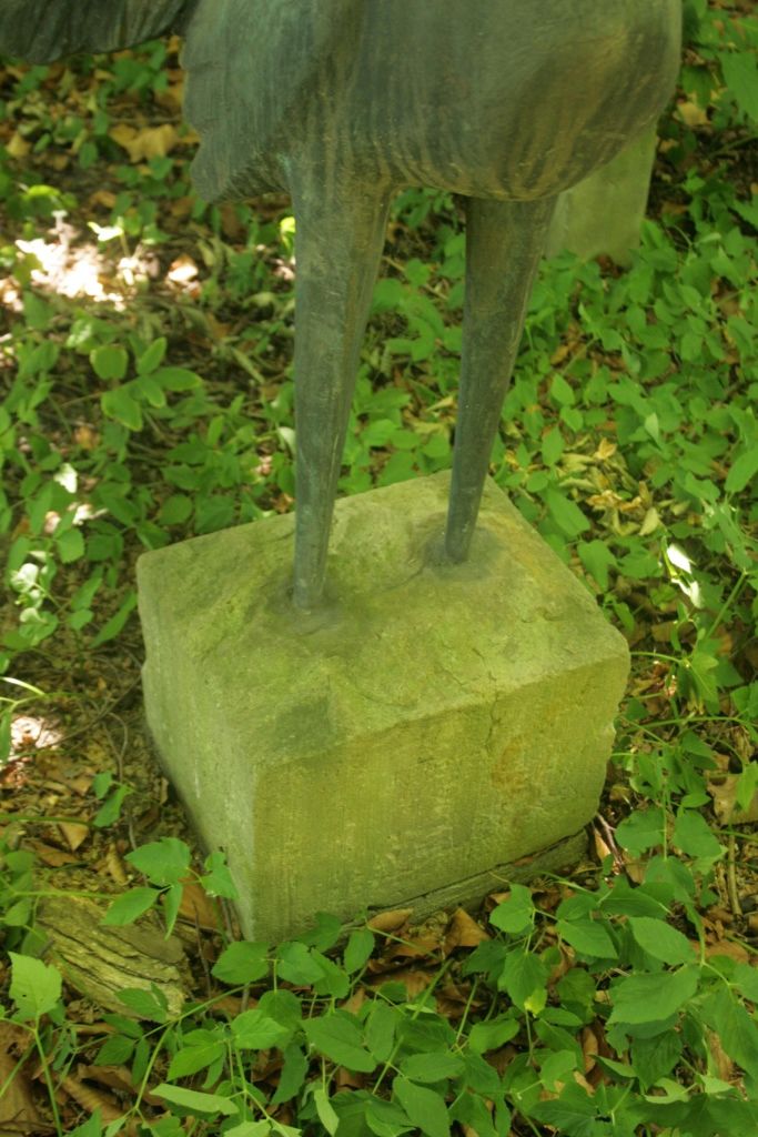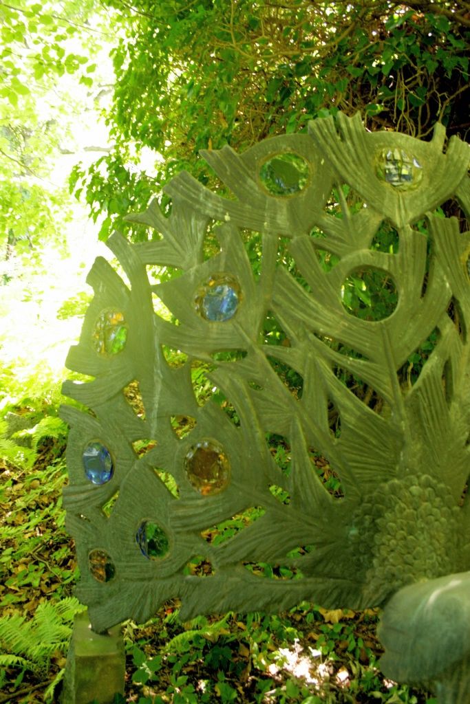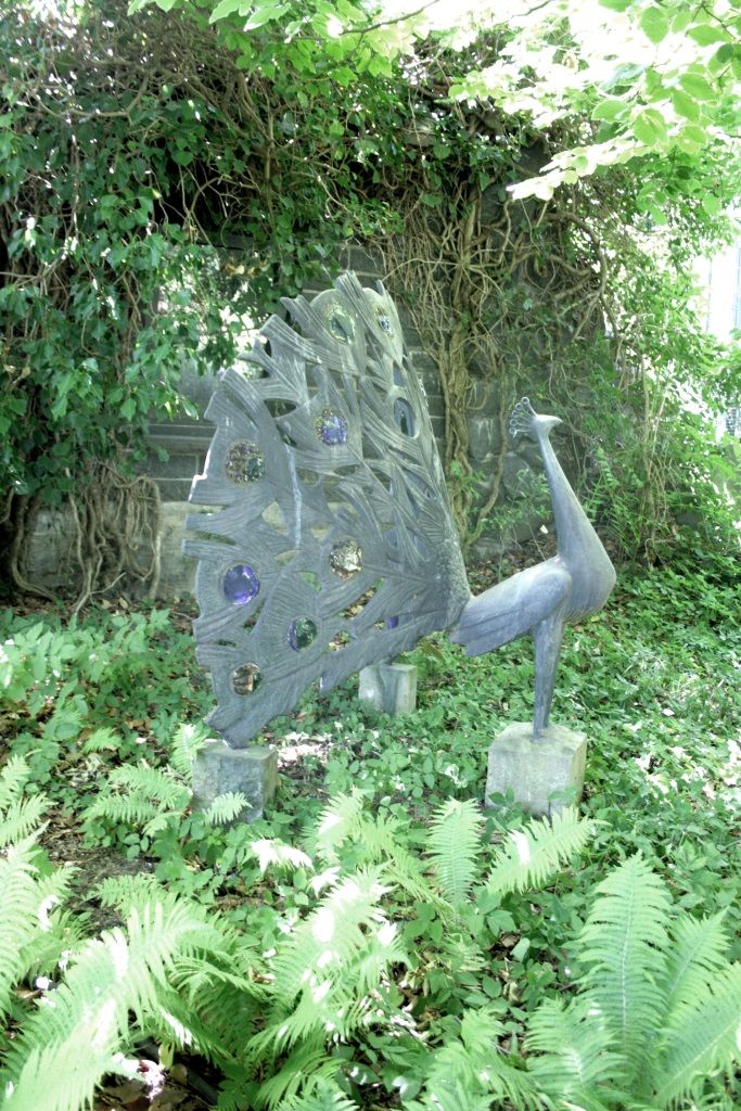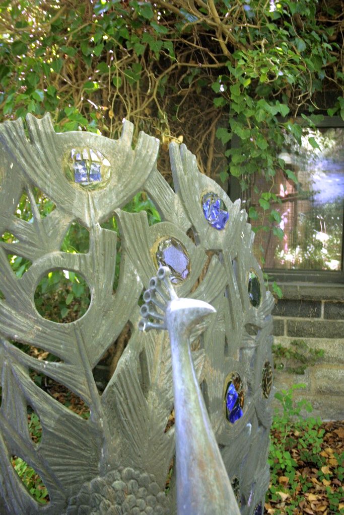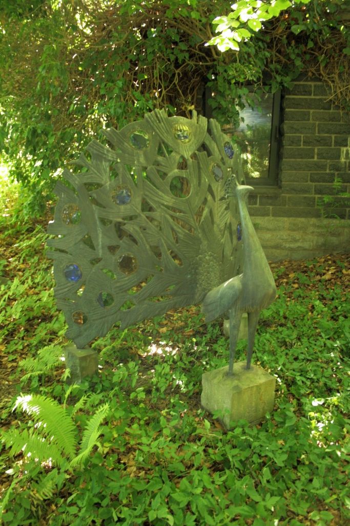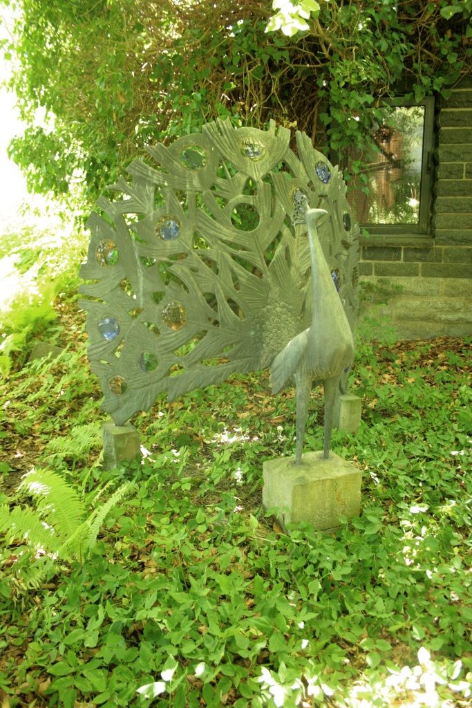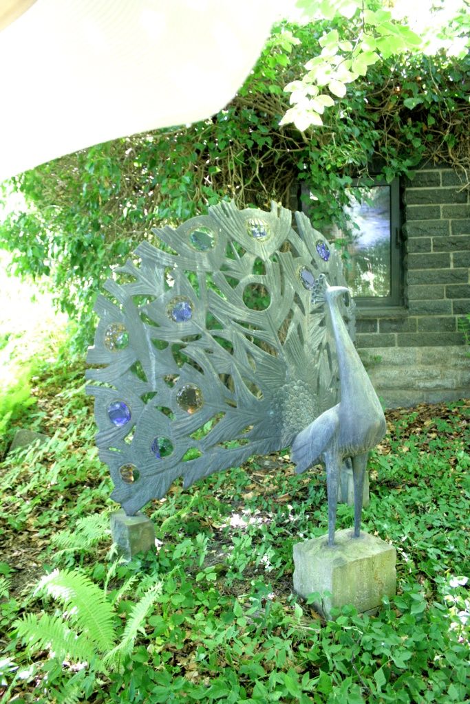 Die einen radschlagenden Pfau in natürlicher Lebensgröße darstellende Bronzefigur zeigt Einlagen aus farbigem Glas. Der stark stilisierte und abstrahierte Vogel steht auf statisch gedachten Beinen. Die Krallen scheinen im steinernen Sockelblock verschwunden zu sein. Die „Pfauenaugen“ der untersten Feldern ruhen auf beiden Seiten auf separaten Sockeln, da das Gewicht der Bronze die Plastik sonst statisch gefährden könnte und ein Bruch der vergleichsweise zierlichen Vogelbeine zu befürchten wäre (Jörg Kuhn).