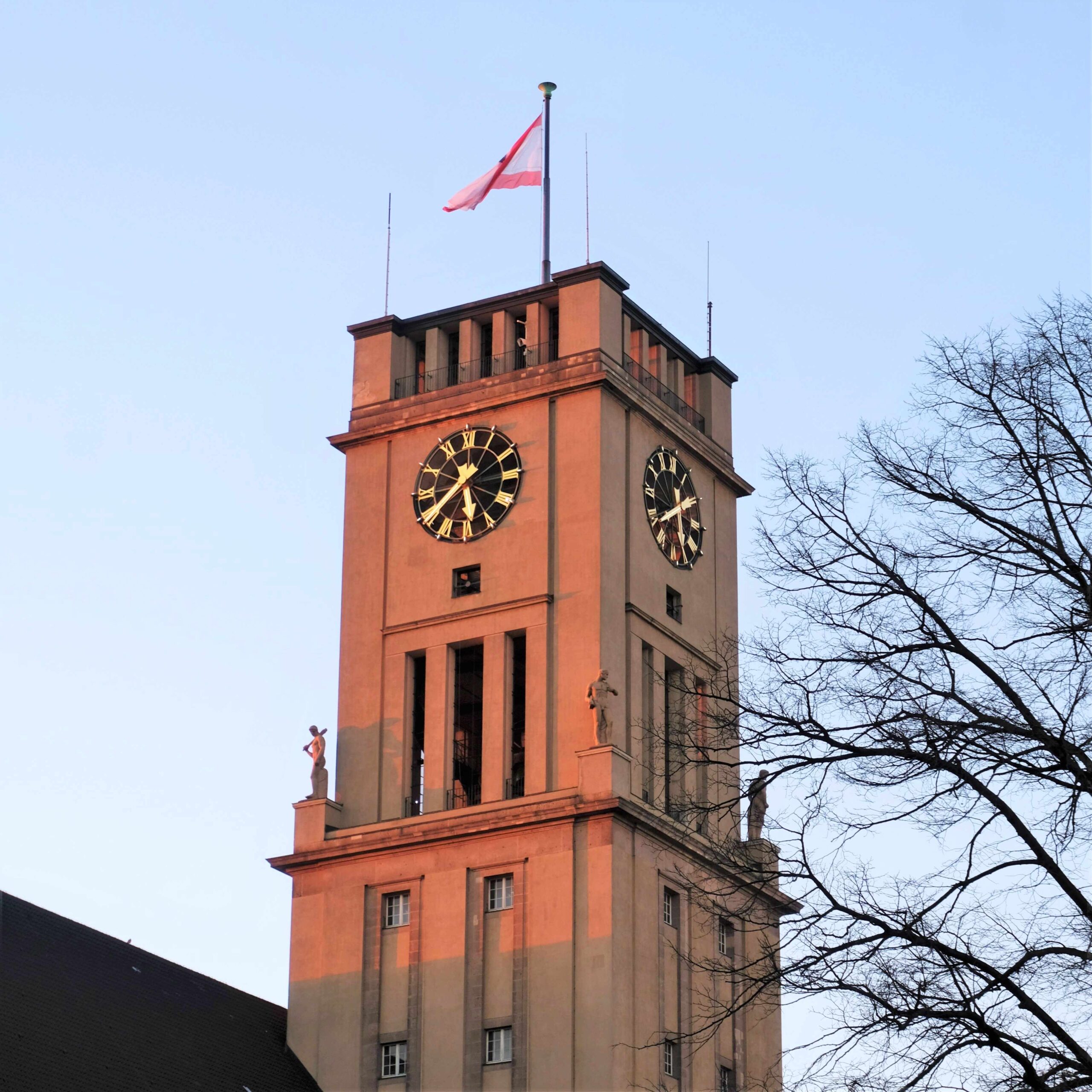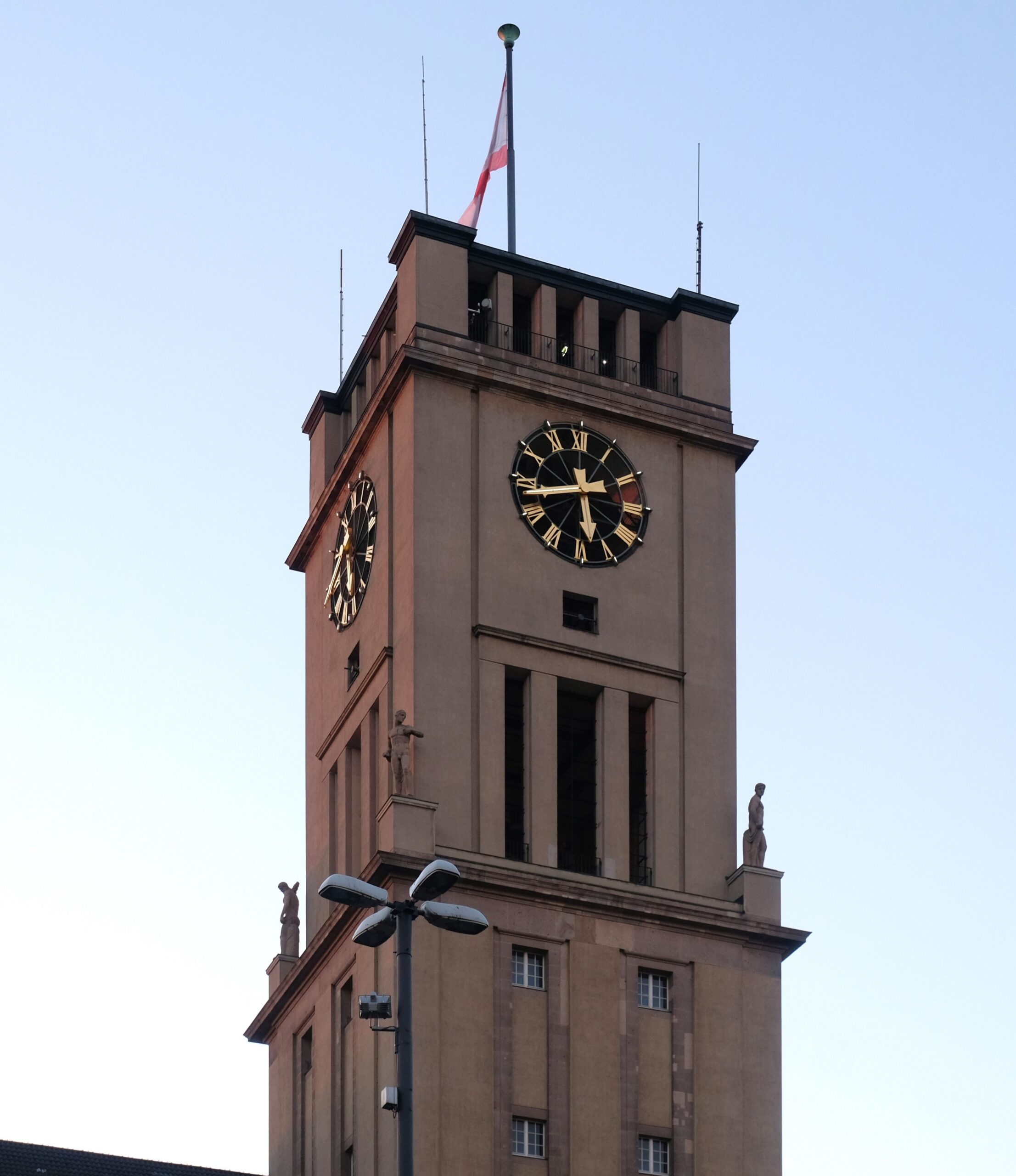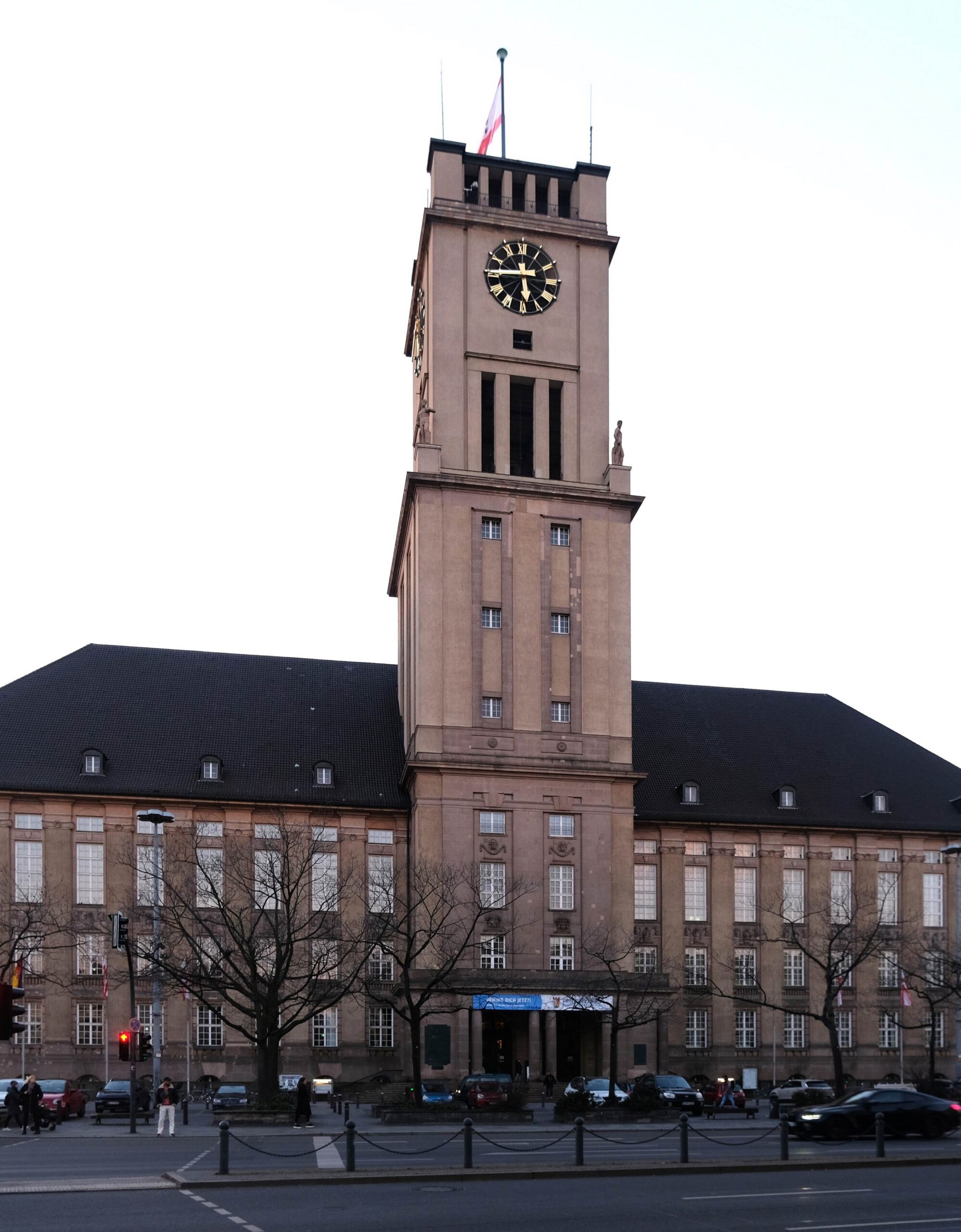 Das Rathaus ist in den Jahren 1911 bis 14 nach Entwürfen des Architekturbüros Jürgensen & Bachmann erbaut worden. Am 26. Mai 1911 erfolgte die Grundsteinlegung am damaligen Rudolph-Wilde-Platz (seit 1963 John-F.-Kennedy-Platz). Anfang 1913 konnten die ersten Abteilungen in das Gebäude einziehen. Die offizielle Einweihung des neuen Rathauses, die für den Herbst 1914 geplant war, ist aufgrund des Ausbruchs des Ersten Weltkriegs entfallen. Das Gebäude wurde im Zweiten Weltkrieg schwer beschädigt und ab 1948 zum Teil vereinfacht wieder aufgebaut. Das Rathaus erlangte vor allem zwischen 1949 und 1993 als Regierungssitz West-Berlins große Bekanntheit. Seit der Rückkehr der Berliner Landesregierung in das Rote Rathaus in Berlin-Mitte im Jahr 1993 wird das Schöneberger Rathaus wieder ausschließlich von der Bezirksverwaltung genutzt. Von der bauplastischen Ausstattung des Außenbaus sind einige Reliefs am Uhrenturm sowie die sechs überlebensgroßen Statuen, die oberhalb des Portalvorbaus standen, verloren (Nicola Vösgen).