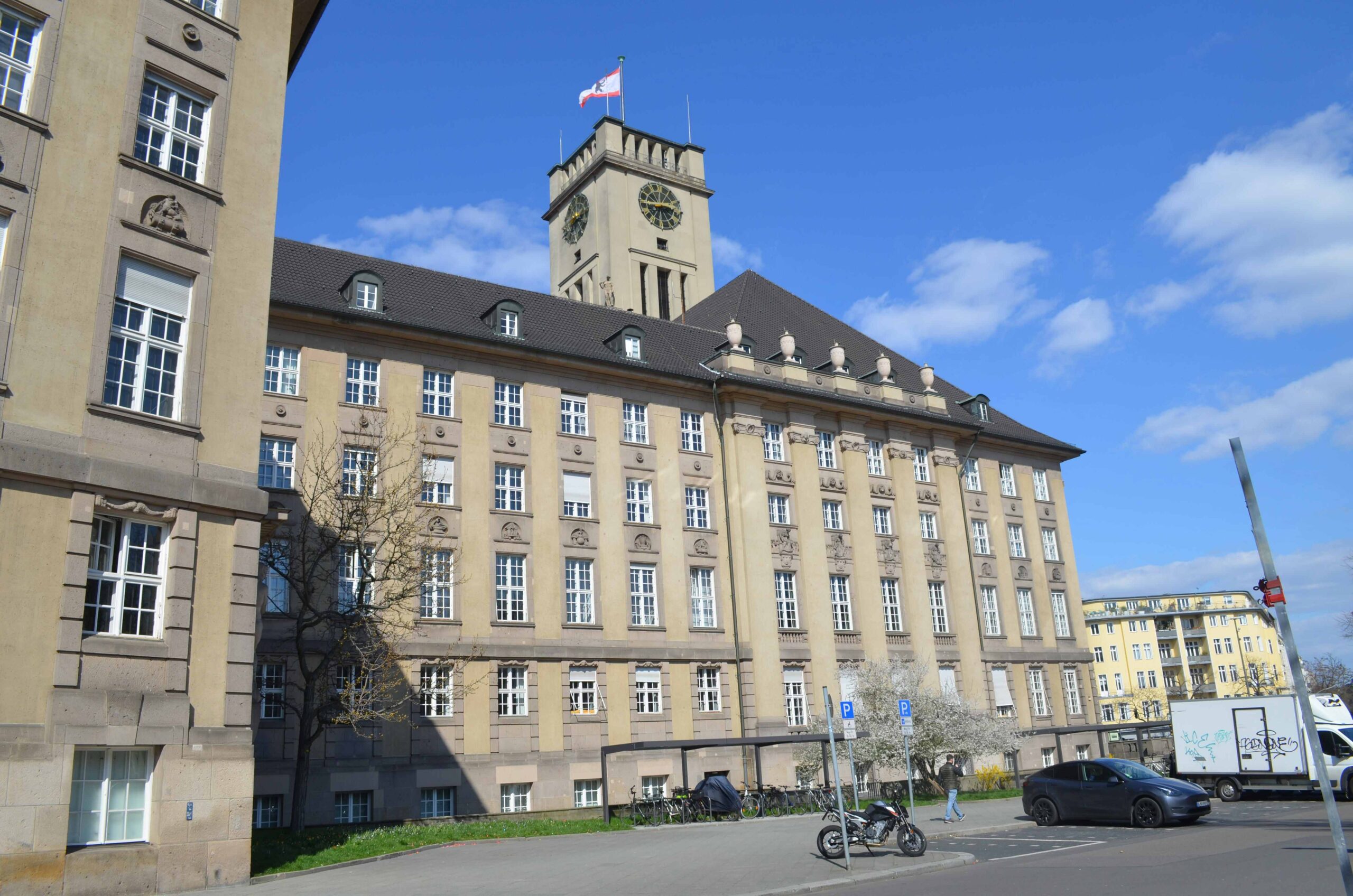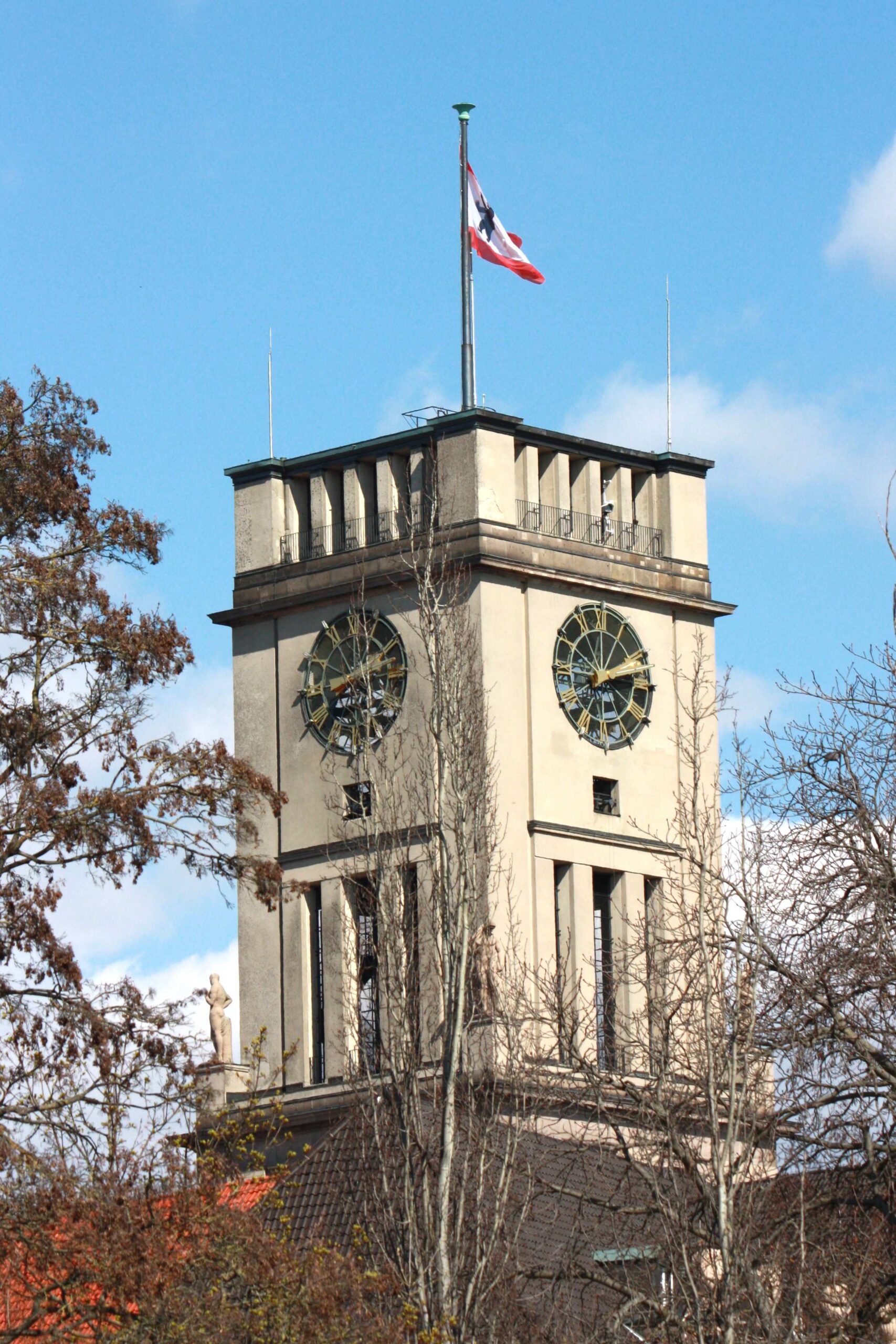 Die viergeschossige Platzfront wird von dem leicht vor die Fassade tretenden, 70 Meter hohen Uhrenturm dominiert, die verputzten Fassaden sind mit einer hohen Sockelzone aus Sandstein und ionischen Kolossalpilastern gestaltet (Nicola Vösgen).