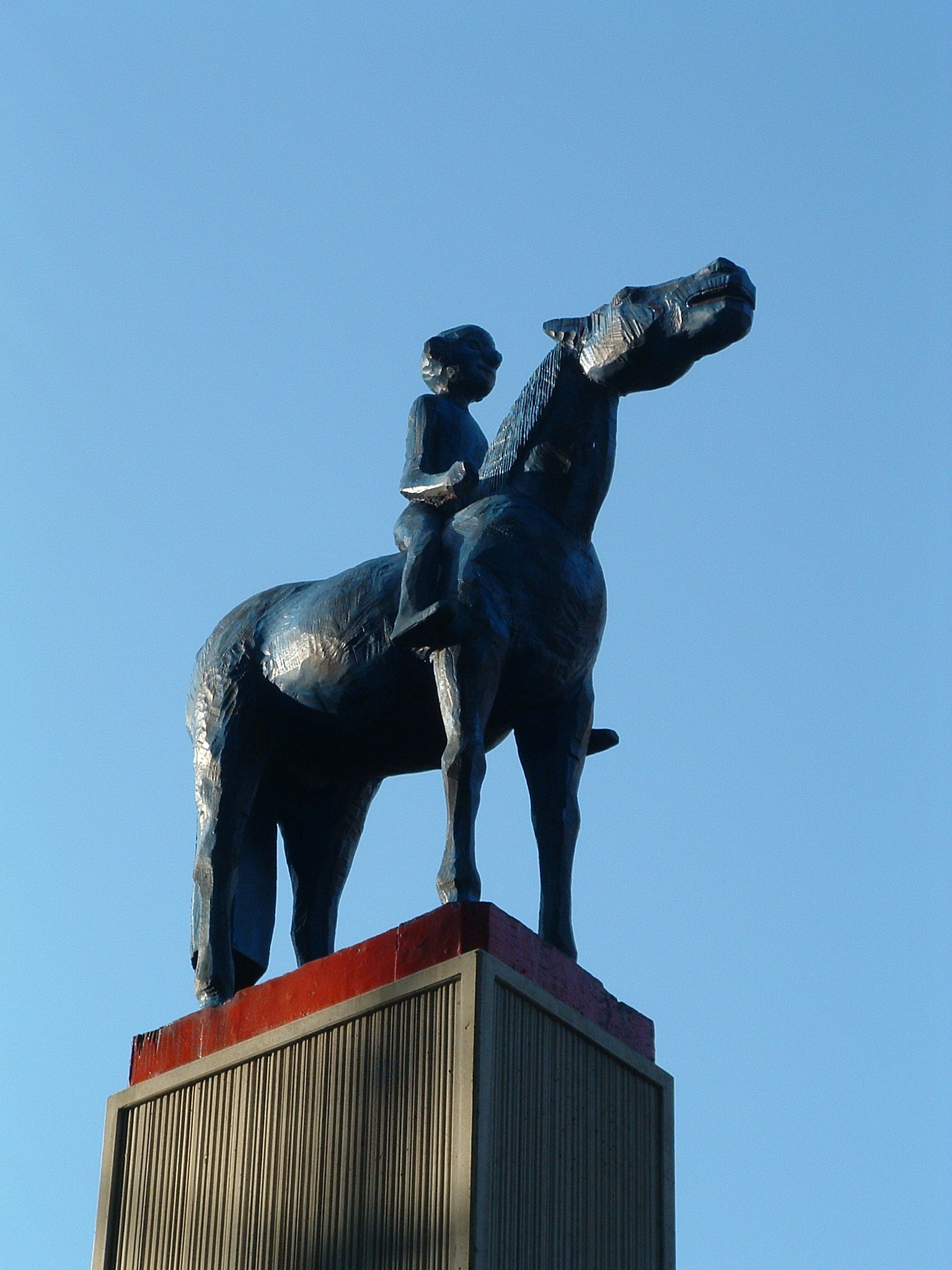 Auf schlankem, hohem Pfeilersockel steht die stilisiert formulierte Plastik eines Reiters auf einem Pferd. Die Figur ist blau gefasst, die rechteckige Plinthe rot. Die Pfeilerflächen sind reliefartig gestaltet.