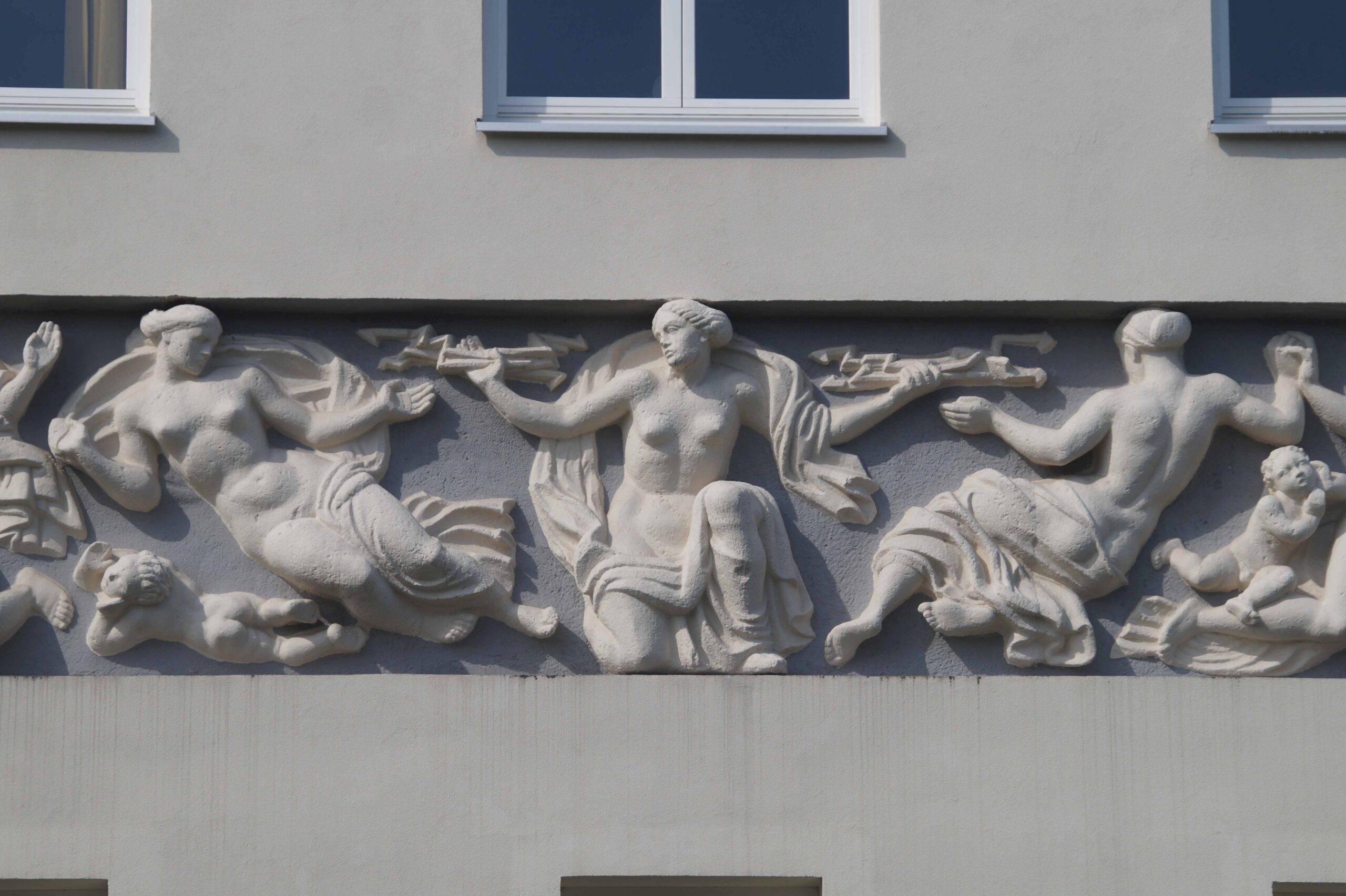 Auf der Münchener Kunstausstellung im Maximilianeum stellte Josef Wackerle 1940 das „Relief f. Stein am Telefunkenhaus Berlin (Gips)“ aus. In der zeitgenössischen Zeitschrift „Kunst im Deutschen Reich“ wurde das „stattliche[] plastische[] Werk, […] das in seiner ganzen Anlage nach schon zu den wesentlichsten Schöpfungen der zeitgenössischen Münchener Kunst gehört“ ausführlich gewürdigt: „In der im Mittelpunkt knienden weiblichen Gestalt verkörpert sich gleichsam die Quelle der zündenden Funken, die nach zwei Seiten hin ausstrahlen. Sie schweben weiter in weiblichen Akten und Putten, die bei aller betonten Körperlichkeit die gewichtslose Leichtigkeit des Fliegens im freien Raum vollendet darstellen. Ein Werk, in dem die bedeutungsvolle Schwere der süddeutschen Renaissance und die graziöse Leichtigkeit des bayerischen Barocks verhalten nachklingen." (Nicola Vösgen).