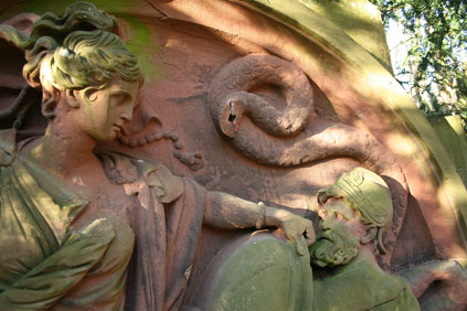 Auf dem Friedhofsgelände befinden sich zwei Bildreliefs der ehemaligen Wiener Brücke: Eines in der Nähe des Einganges Sandhauser Straße, beim Hauptweg, das andere bei einer kleinen Platzanlage. Die zwei Tondos sind große kreisförmige Bildhauerarbeiten. Die detailreichen Hochreliefs behandeln Motive aus dem Gigantenfries des Pergamon-Altars, die Szenen des dramatischen Kampfes der griechischen Götter mit den Giganten zeigen. Zur Aufstellung der in drei Teilen zerlegten Reliefs sind sie in ausgreifenden Steinquadern eingelassen. Sie zeigen jeweils ein Kampfpaar des Frieses als Kopie mit ergänzenden Nachbildungen der im Original fehlenden Teile.