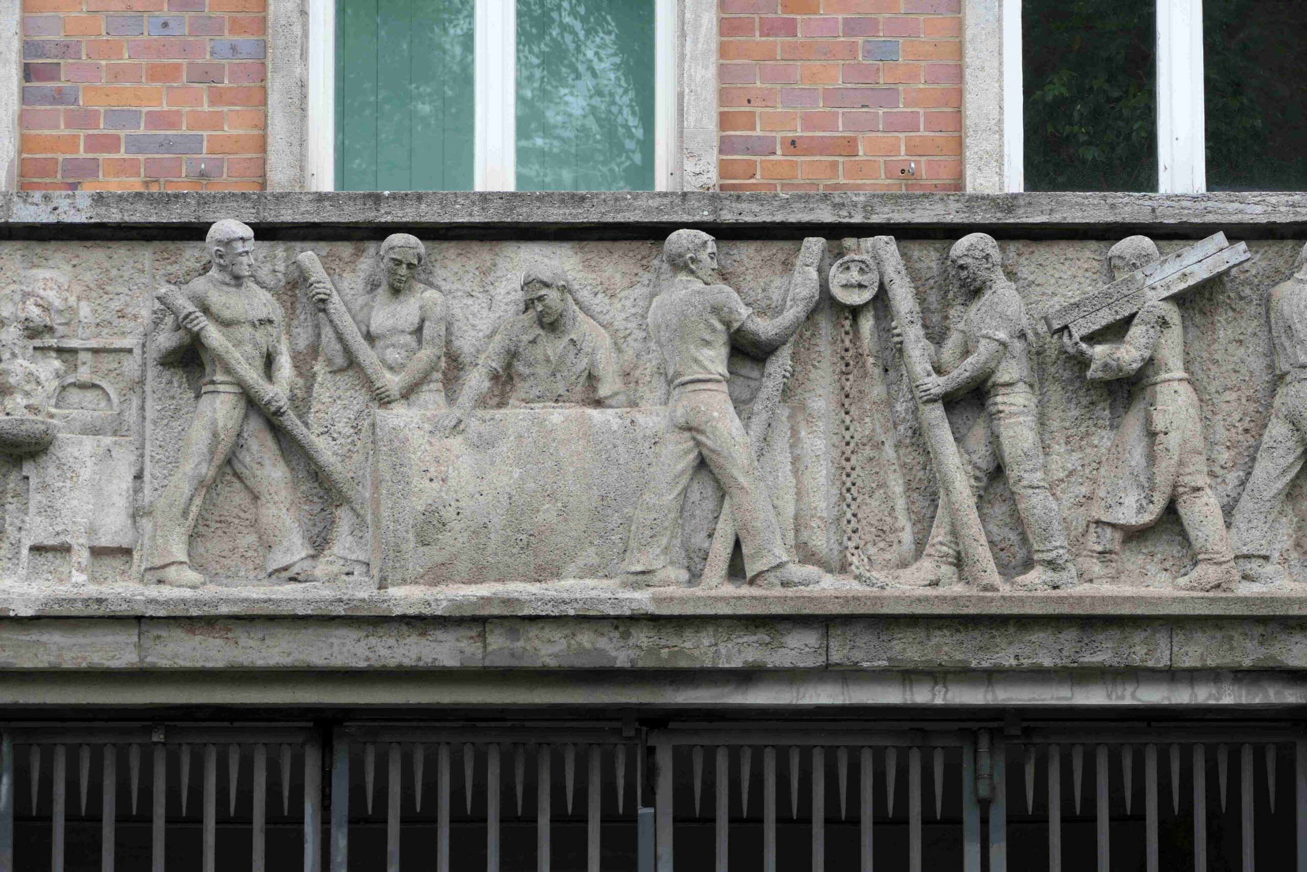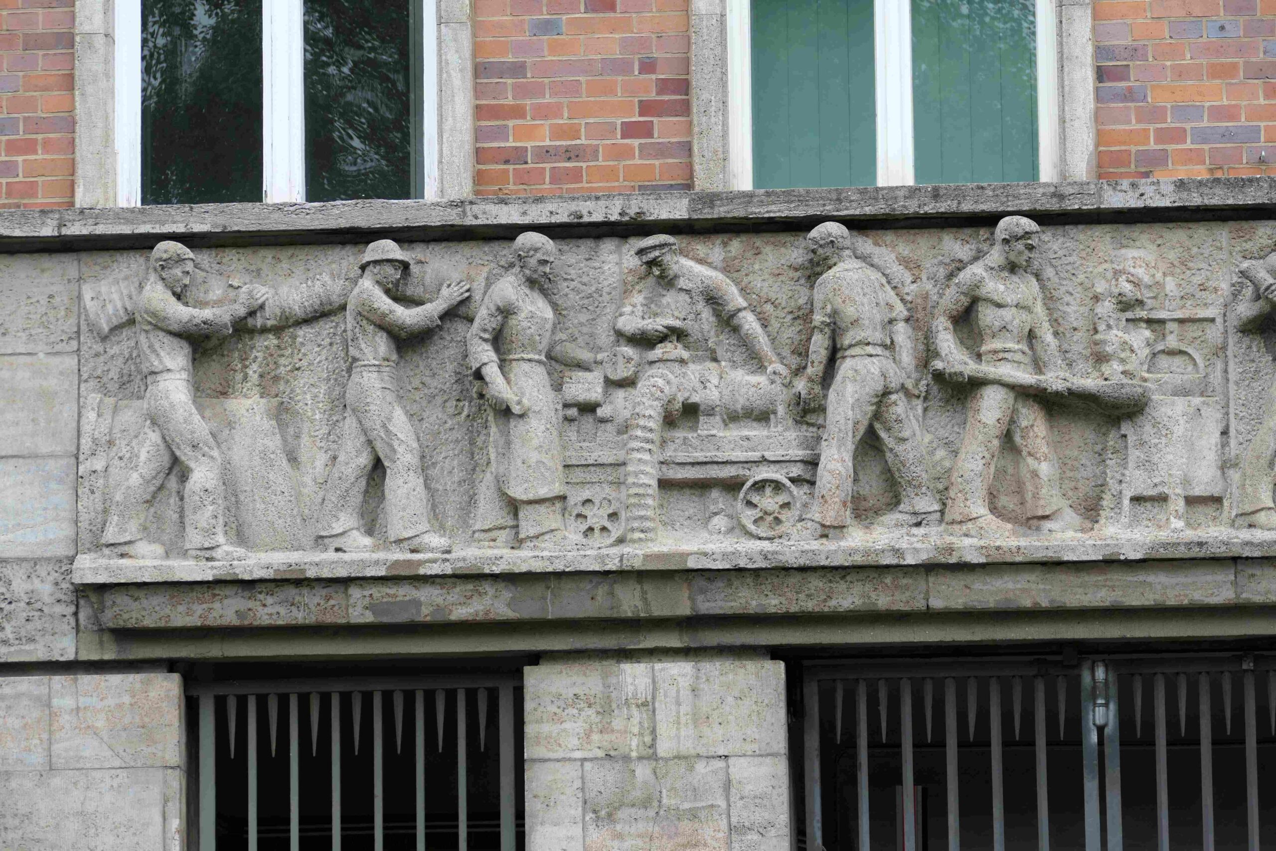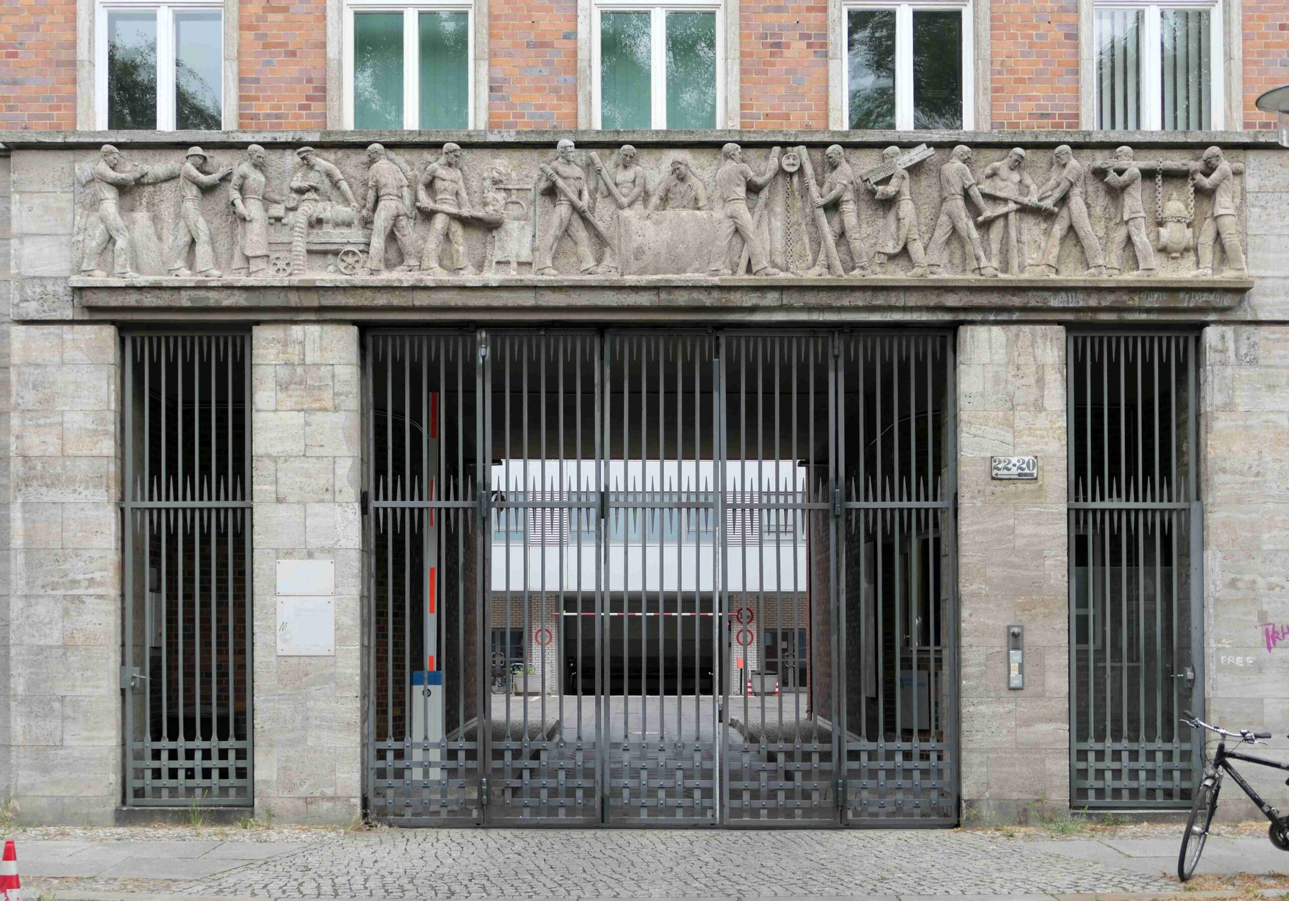Über die gesamte Breite der Durchfahrt des Verwaltungsgebäudes der Berliner Wasserbetriebe erstreckt sich ein großes querrechteckiges Relief. Es zeigt verschiedene Szenen, in denen Mitarbeiter der Städtischen Wasserwerke Leitungen verlegen und Wasserrohre ausbessern (Nicola Vösgen).