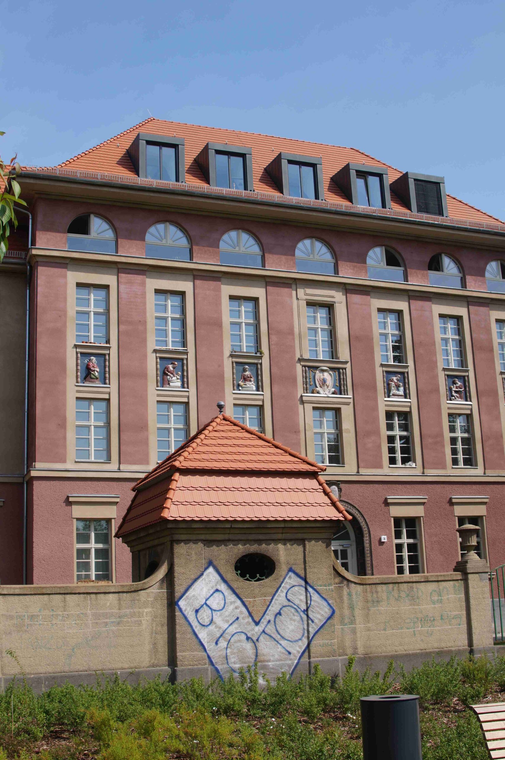 Das ehemalige Entbindungshaus der ehemaligen Brandenburgischen Hebammen-Lehranstalt und Frauenklinik mit drei Geschossen und einem ausgebauten Dachgeschoss erstreckt sich über 33 Achsen. Zwei Eckrisalite und ein breiter Mittelrisalit gliedern die langgestreckte Fassade. Der Mittelrisalit, in dem sich das über eine kleine Freitreppe zugängliche Hauptportal befand, ist mit sieben farbig glasierten Keramikreliefs verziert. Die sechs äußeren Reliefs sind identisch mit denen am Verwaltungsgebäude. Das mittlere Relief zeigt den brandenburgischen Adler. Oberhalb des Portals befindet sich eine Gedenktafel mit der Inschrift „S(eine) M(ajestät) Wilhelm II., Deutscher Kaiser König v(on) Preußen, zur Feier des 25. Jahres seiner Regierung 1913 (Nicola Vösgen).