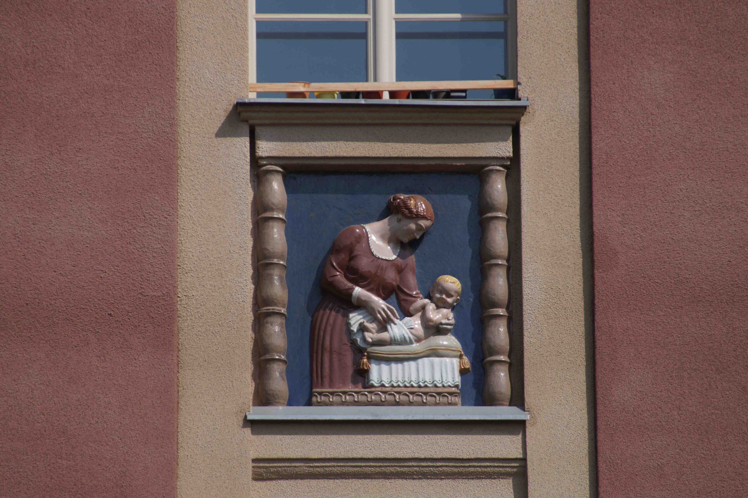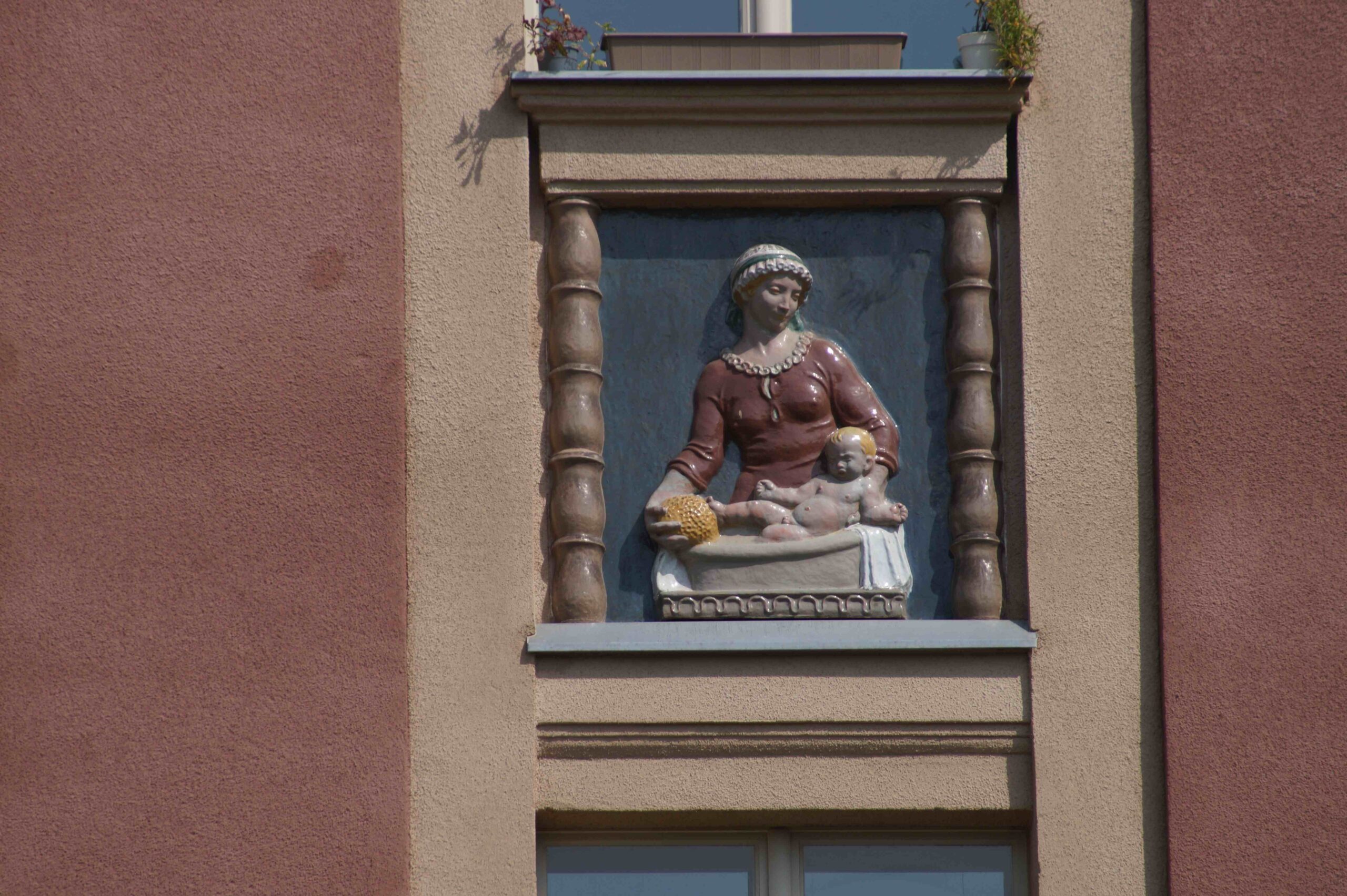 Die Modelle für Relieftafeln schufen die Bildhauer Roch & Feuerhahn um 1917. Die Ausführung erfolgte in der Richard Blumenfeld Veltener Ofenfabrik AG in Velten (Nicola Vösgen).