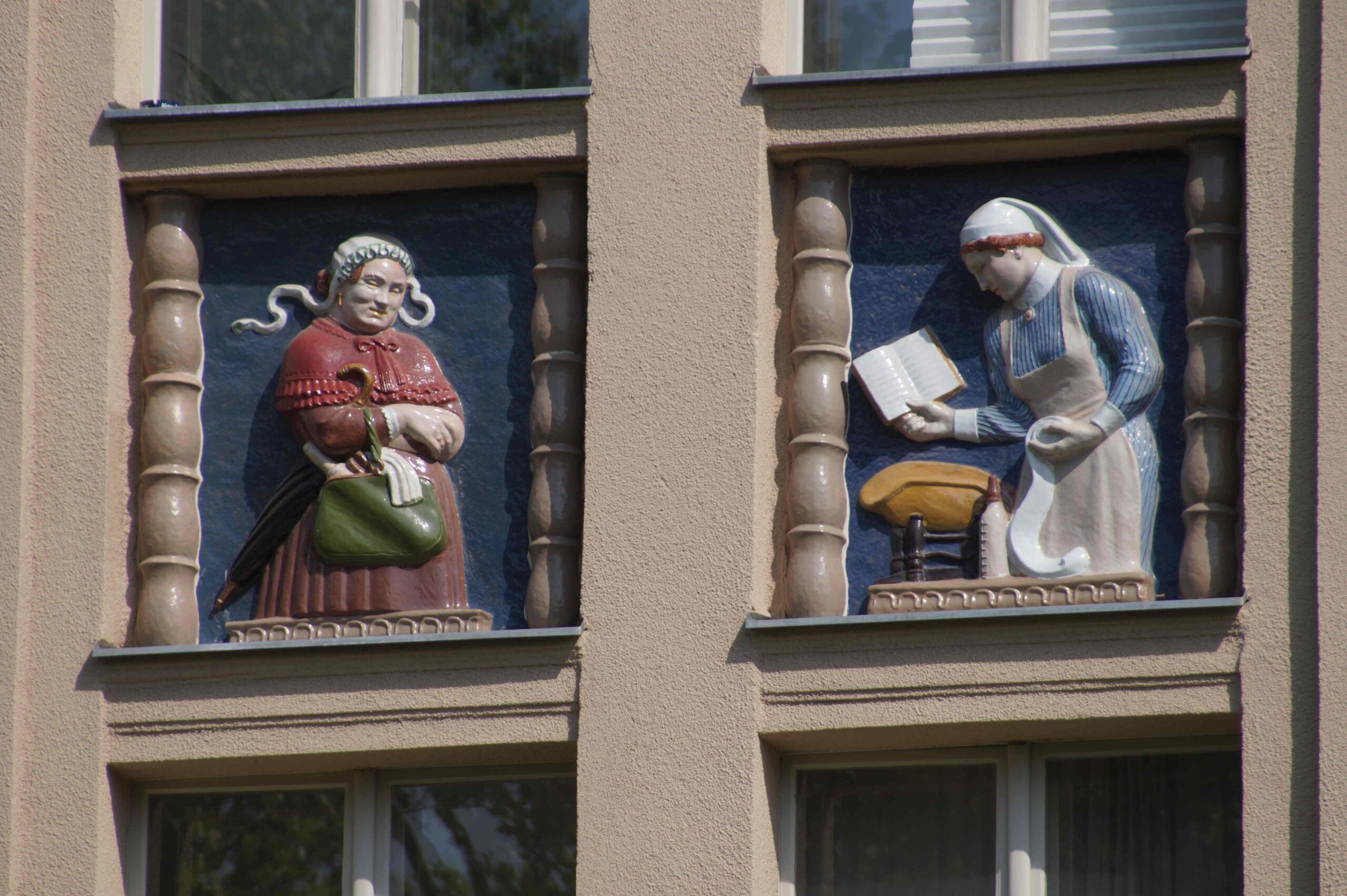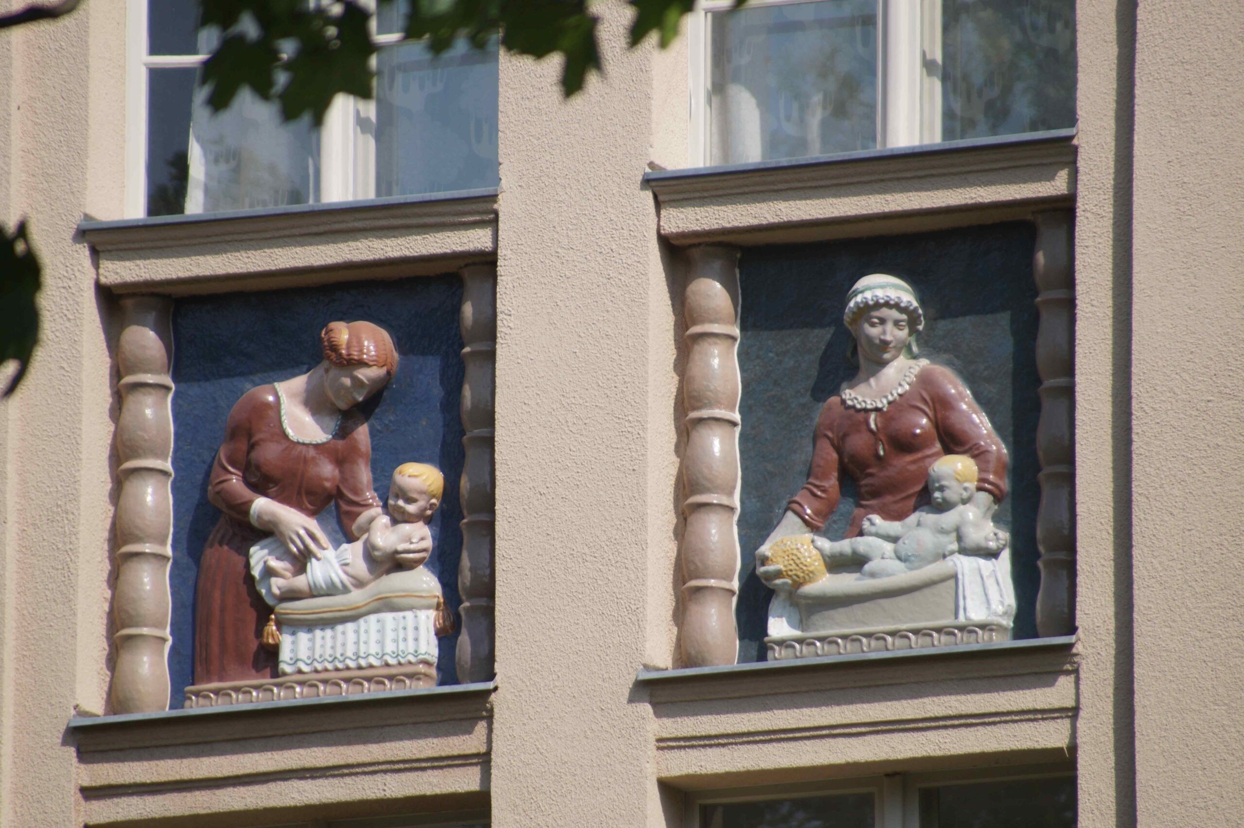 An dem viergeschossigen Teil des Verwaltungsgebäudes der ehemaligen Brandenburgischen Hebammen-Lehranstalt und Frauenklinik sind die Brüstungsfelder zwischen dem ersten und zweiten Geschoss mit farbig glasierten Keramikplatten verziert. An den nach Osten und Süden gerichteten Fassaden sind jeweils sechs unterschiedliche Tafeln angebracht, die verschiedene Tätigkeiten einer Hebamme darstellen. An den beiden Seiten befinden sich sechs identische Reliefs, die jedoch in unterschiedlicher Reihenfolge angebracht wurden (Nicola Vösgen).