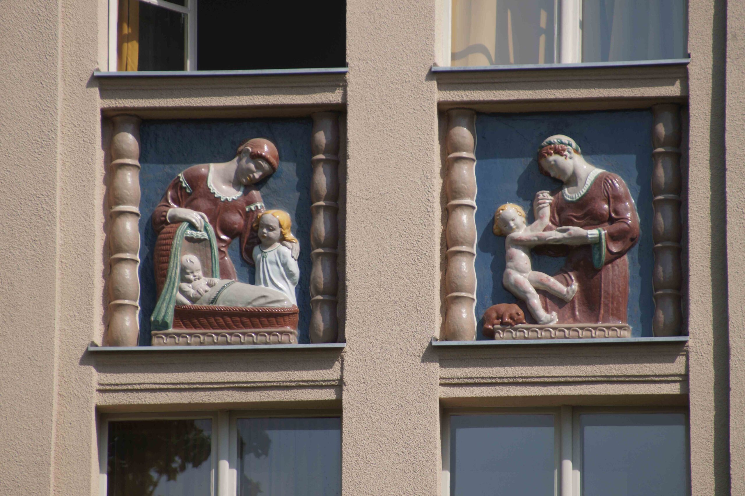 An dem viergeschossigen Teil des Verwaltungsgebäudes der ehemaligen Brandenburgischen Hebammen-Lehranstalt und Frauenklinik sind die Brüstungsfelder zwischen dem ersten und zweiten Geschoss mit farbig glasierten Keramikplatten verziert. An den nach Osten und Süden gerichteten Fassaden sind jeweils sechs unterschiedliche Tafeln angebracht, die verschiedene Tätigkeiten einer Hebamme darstellen. An den beiden Seiten befinden sich sechs identische Reliefs, die jedoch in unterschiedlicher Reihenfolge angebracht wurden (Nicola Vösgen).