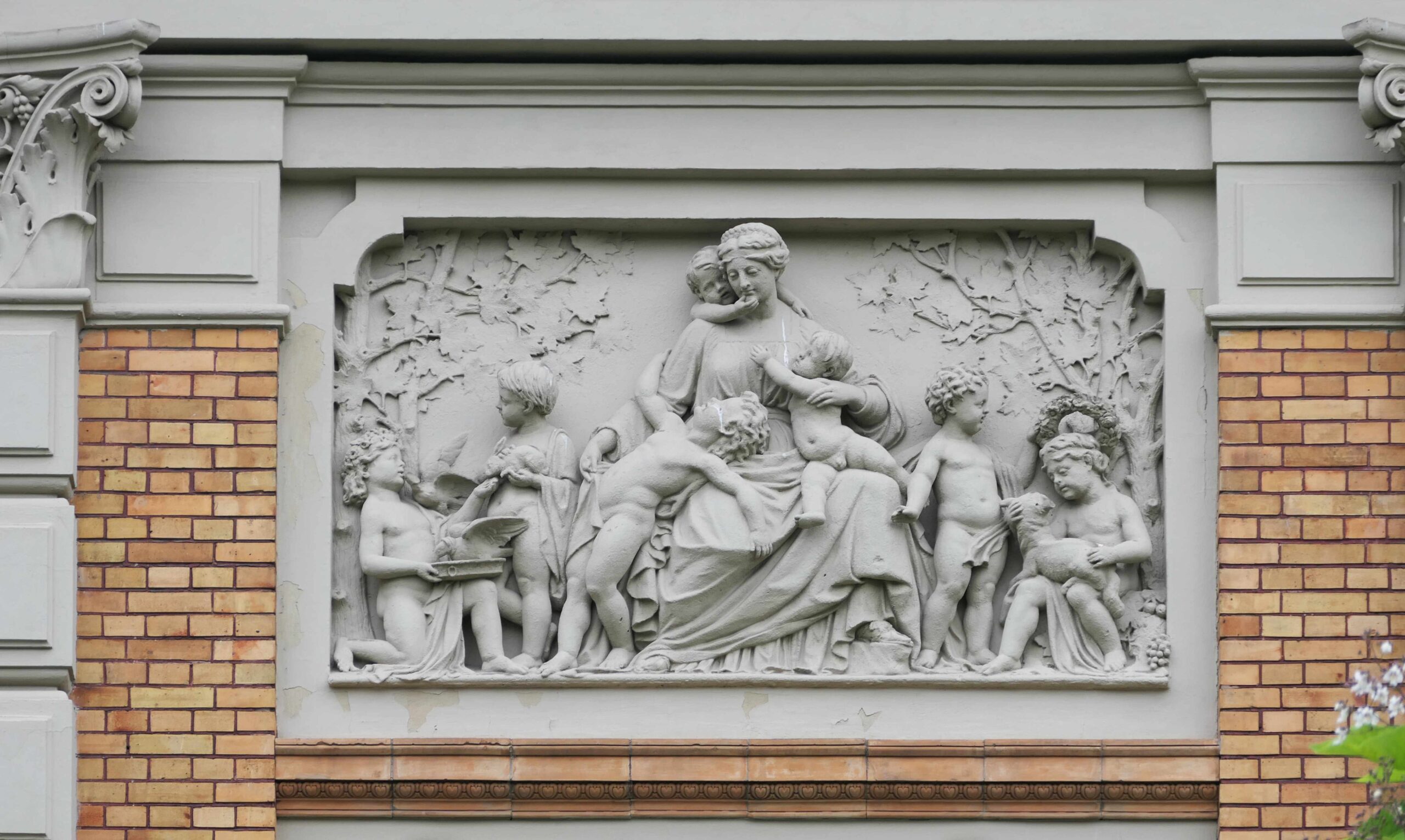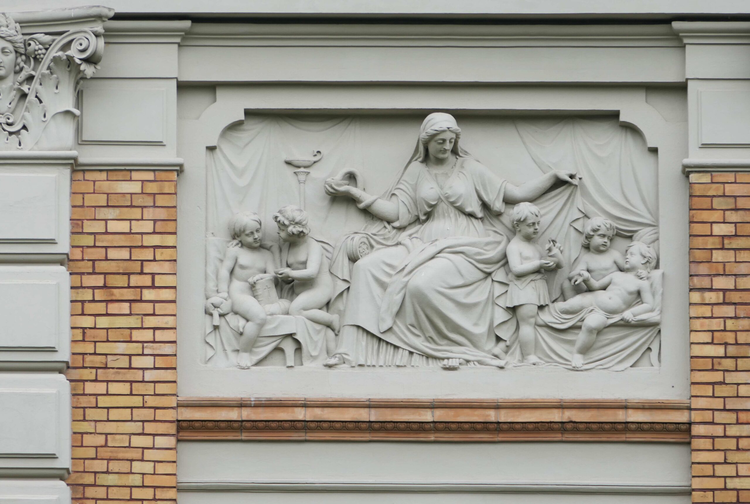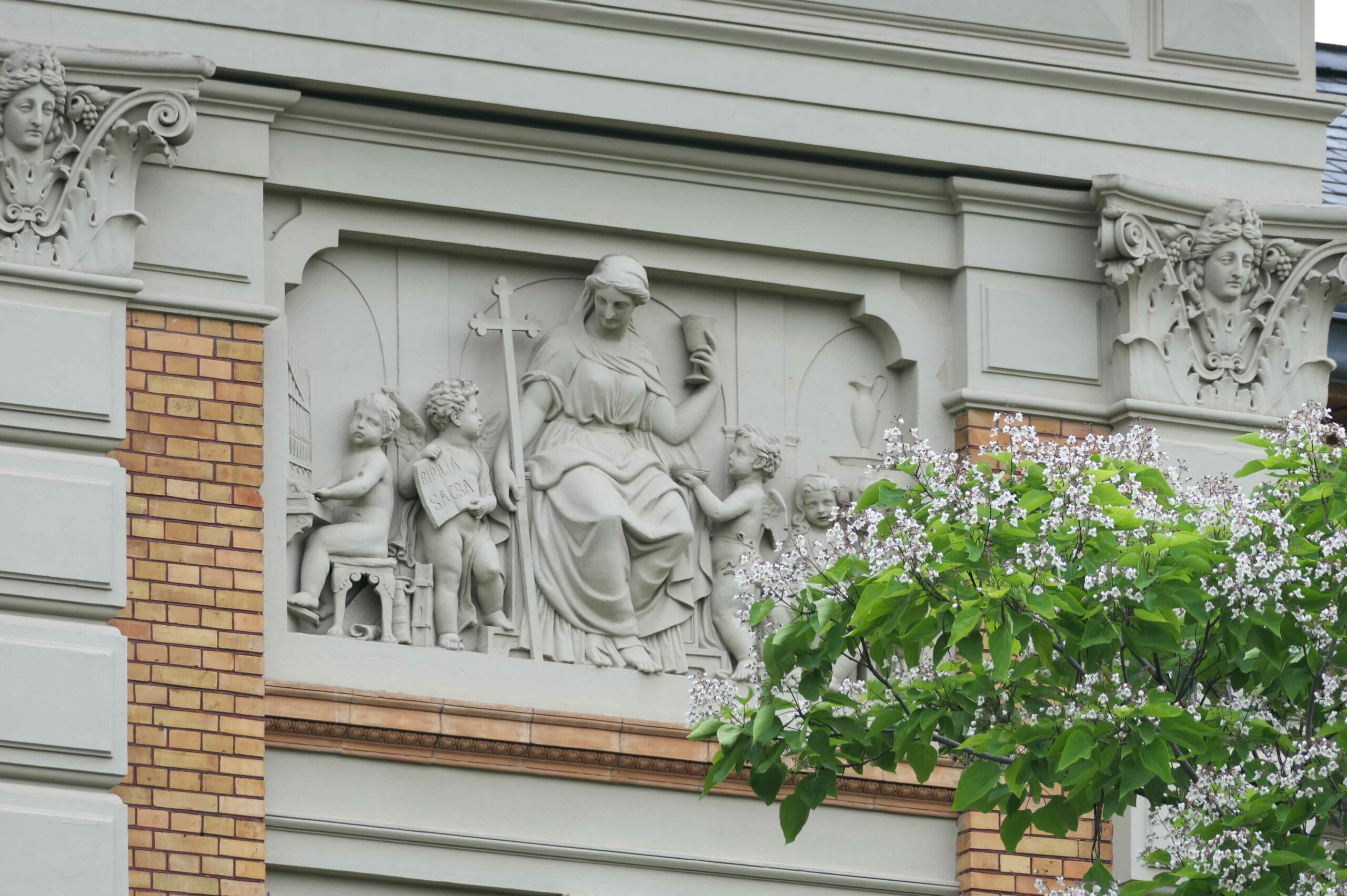 Der Bildhauer Eduard Lürssen schuf die Reliefs, die in allegorischen Darstellungen die Barmherzigkeit (linkes Relief), Caritas (Mitte) und Frömmigkeit (rechtes Relief) zeigen.