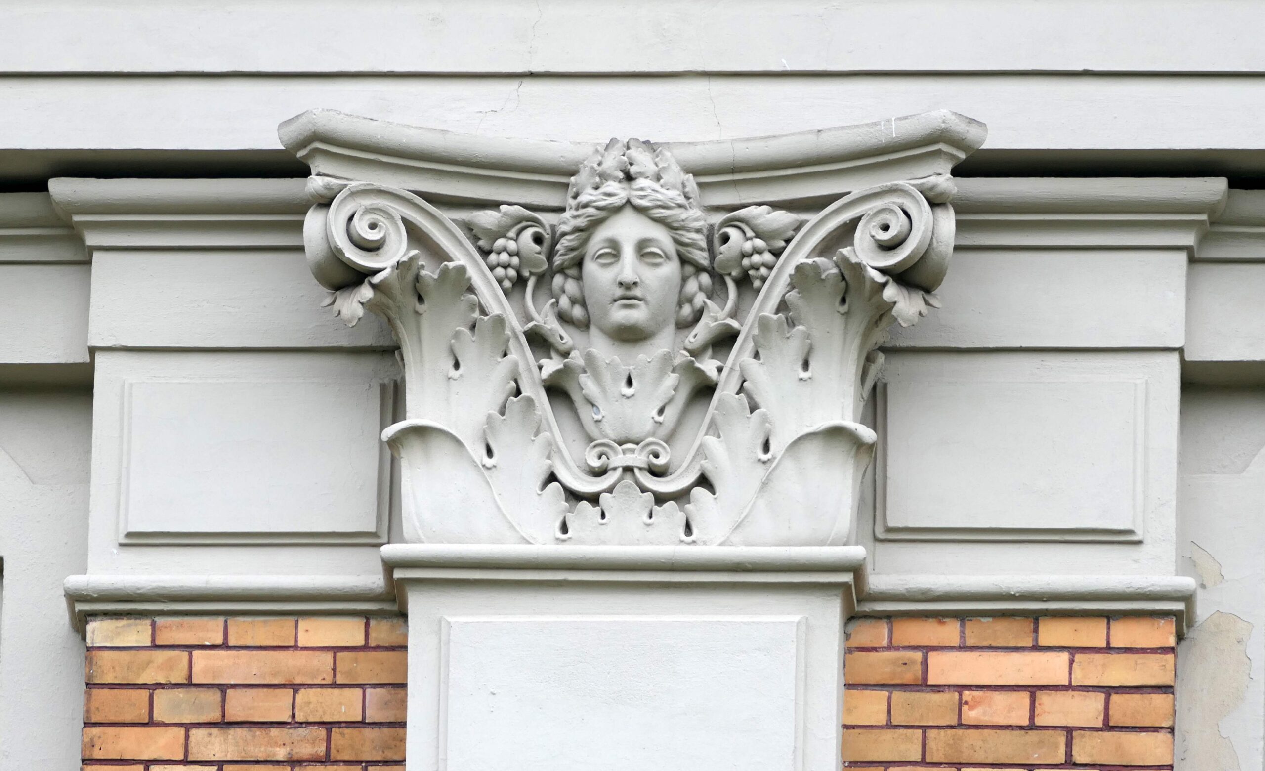 Im ersten Obergeschoss der St. Gertraudt-Stiftung befand sich hinter dem vorspringenden Mittelrisalit die über zwei Geschosse reichende Kapelle. Über deren Rundbogenfenstern schmücken drei große querrechteckige Reliefs mit allegorischen Szenen die Fassade (Nicola Vösgen).