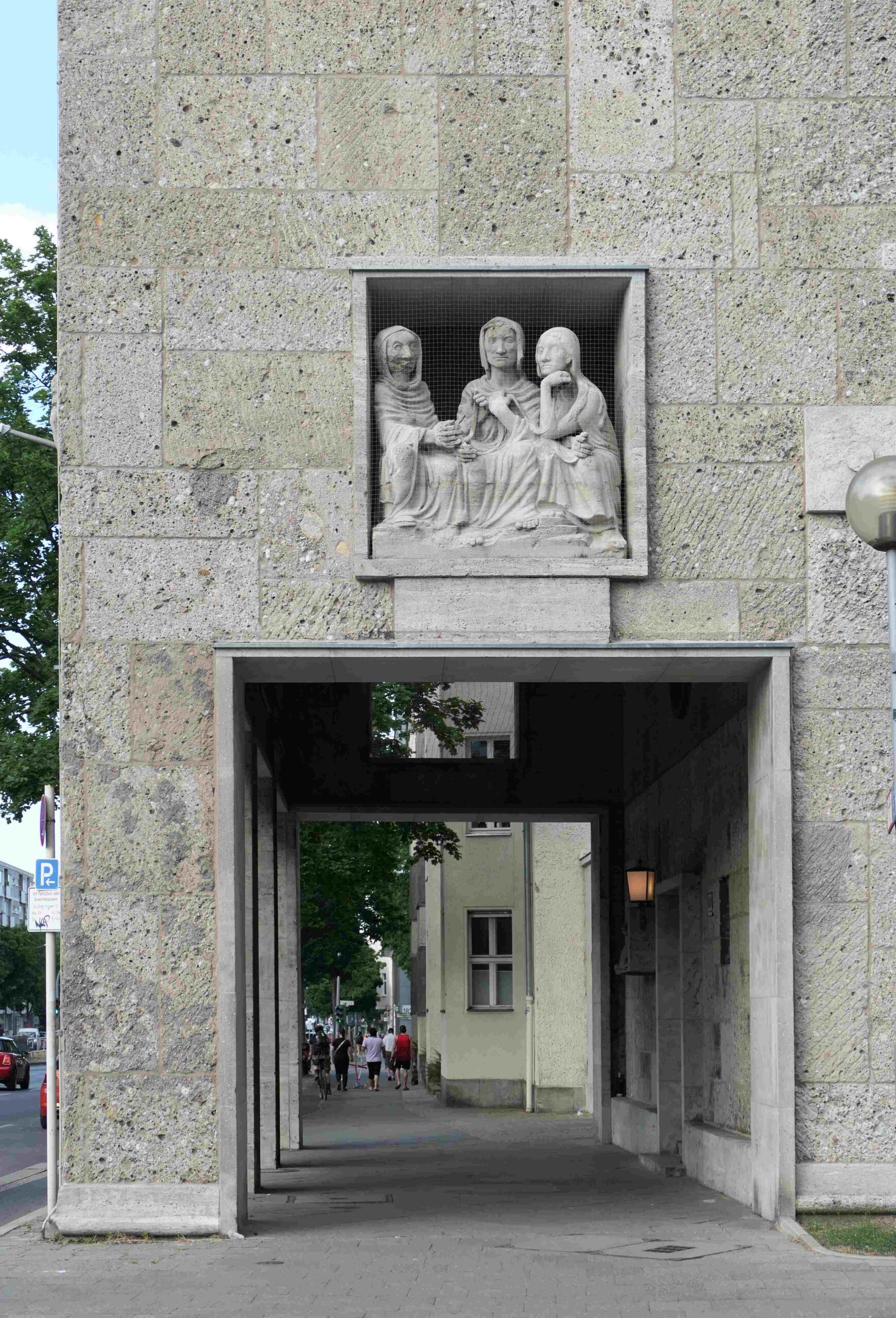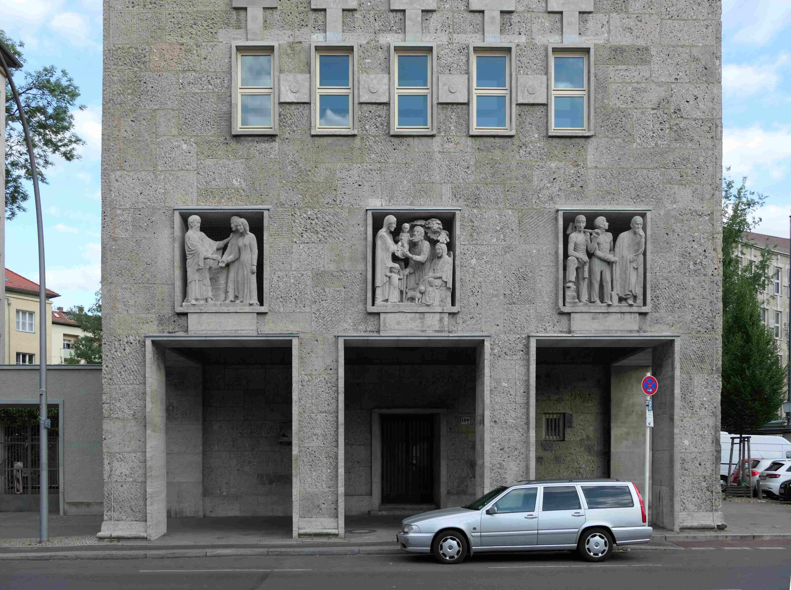 Der Übergang des ehem. Verwaltungsgebäudes der Nordstern-Versicherung über den Hohenzollerndamm war ursprünglich an allen drei freistehenden Seiten mit insgesamt fünf Reliefs verziert, von denen vier erhalten sind.