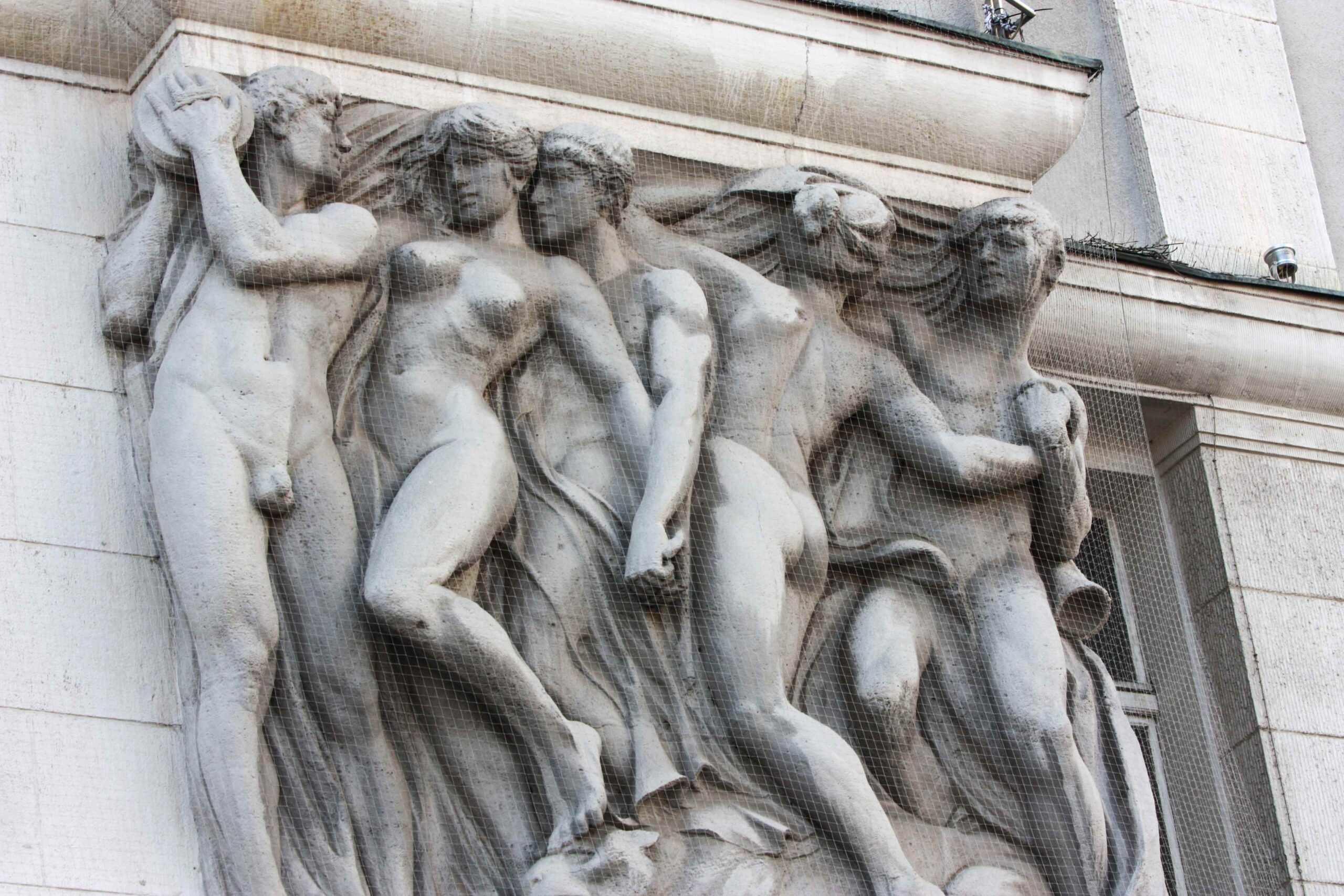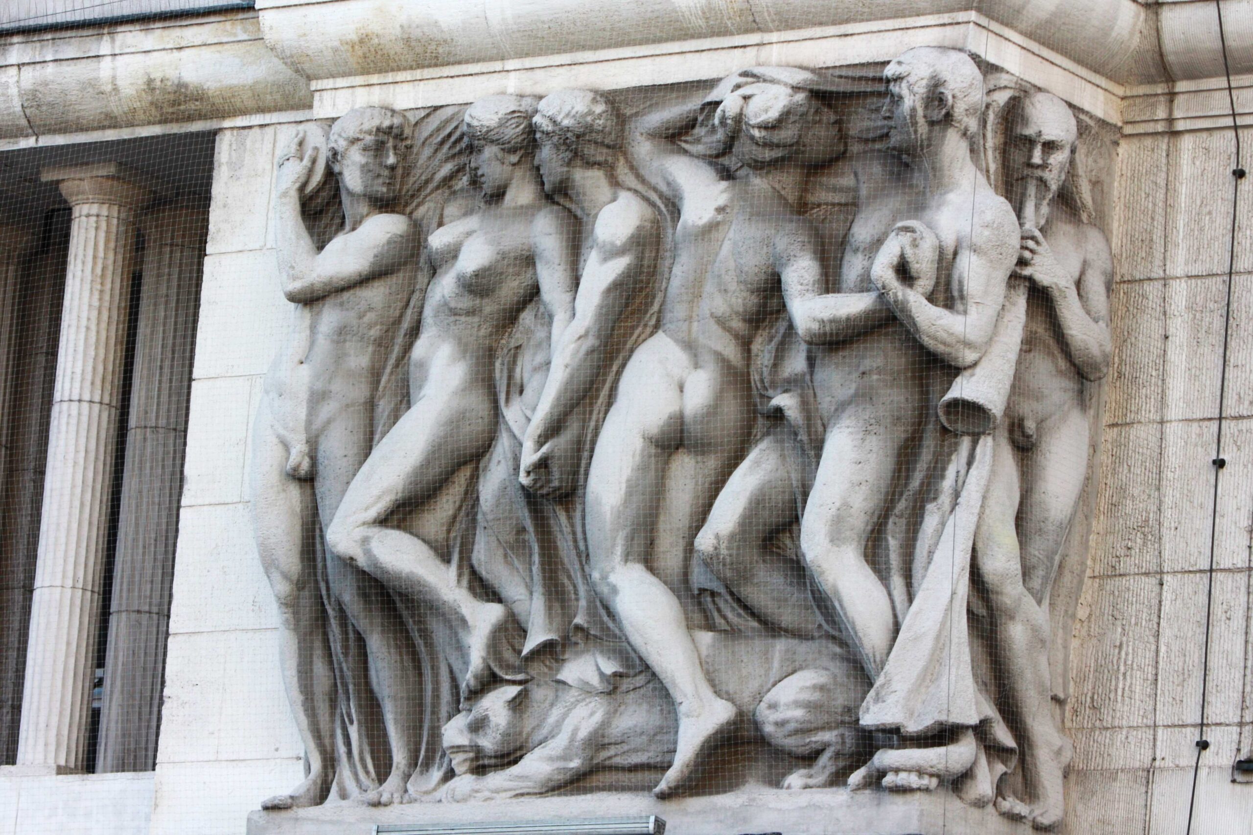 An den Pilastern des ehemaligen Neuen Schauspielhauses seitlich des Haupteingangs sowie in Verlängerung der dorischen Säulen, die den Haupteingang unterteilen, befinden sich zwei große und zwei kleinere Reliefs mit den Darstellungen ca. lebensgroßer Figuren. Die beiden linken Reliefs zeigen trauernde und wehklagende Menschen, auf den rechten Reliefs sind musizierende und tanzende Personen zu sehen.