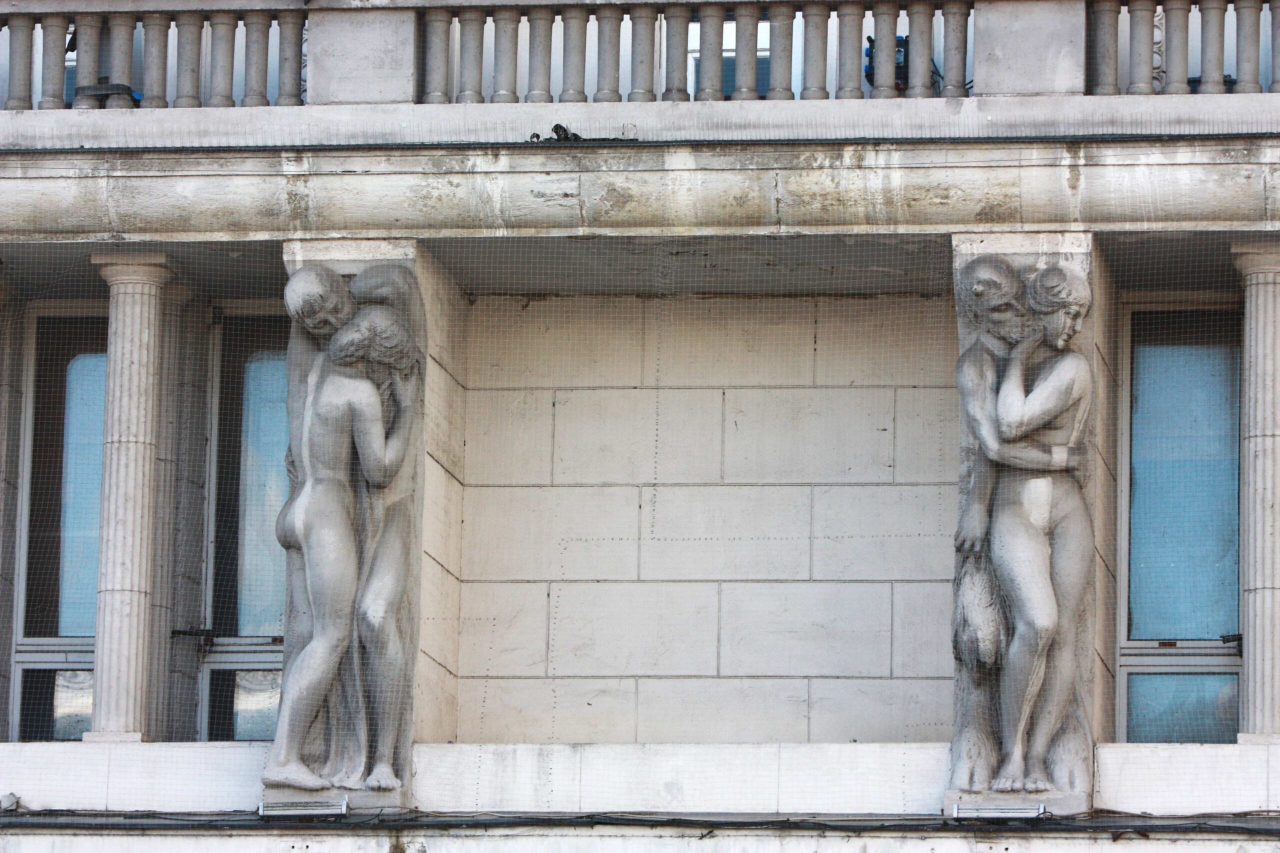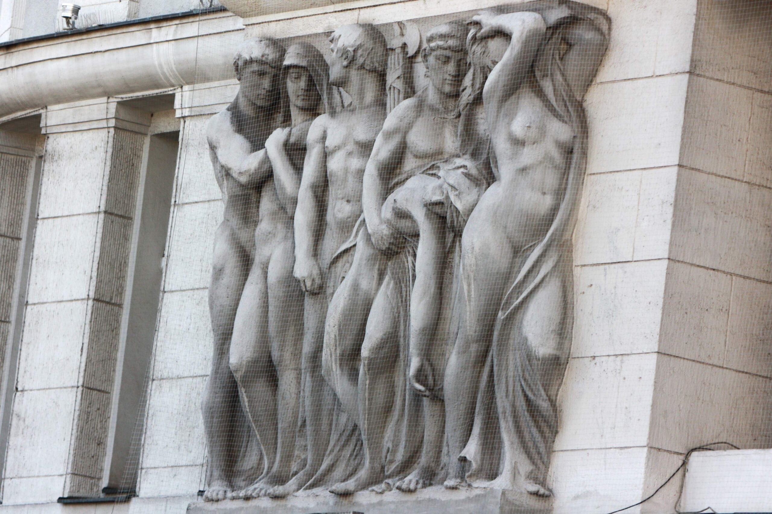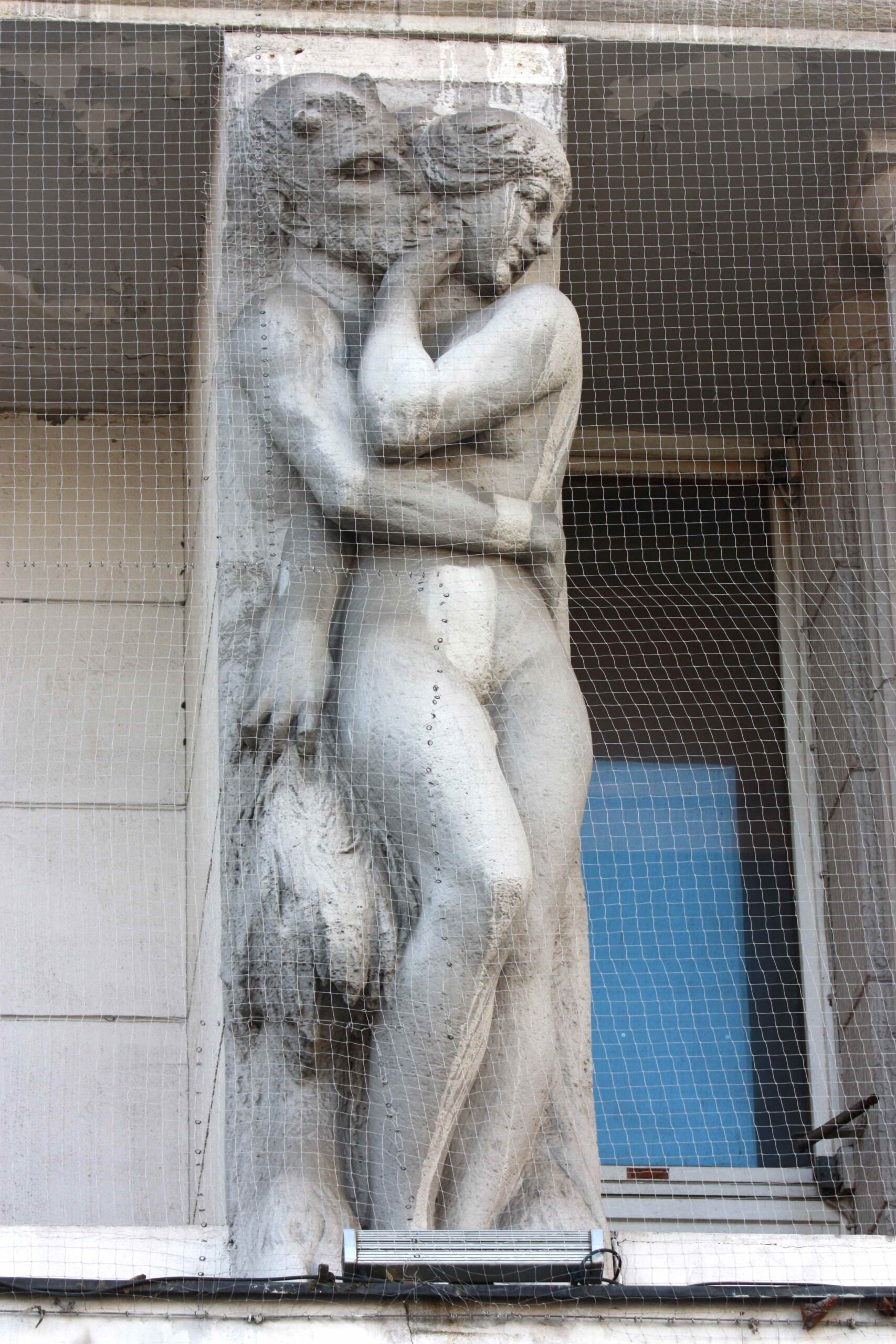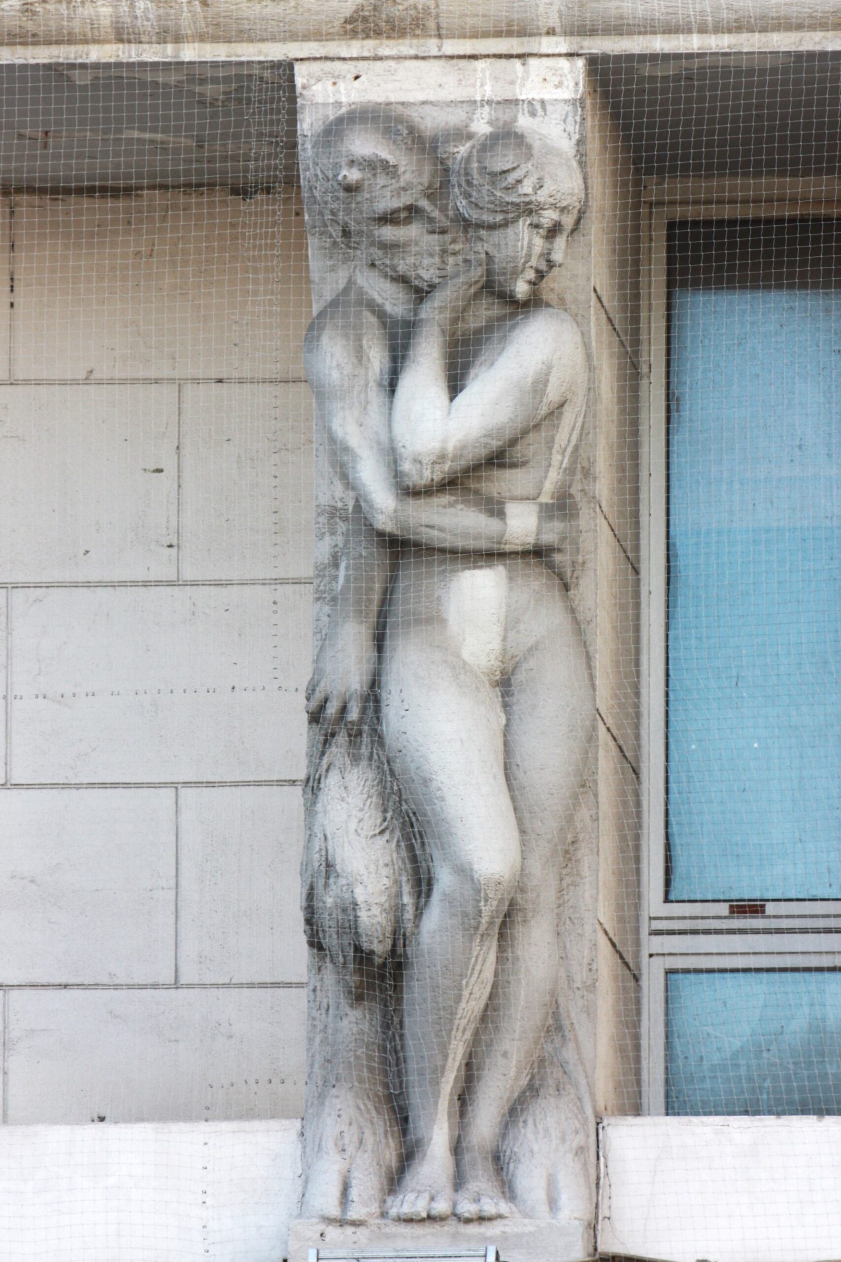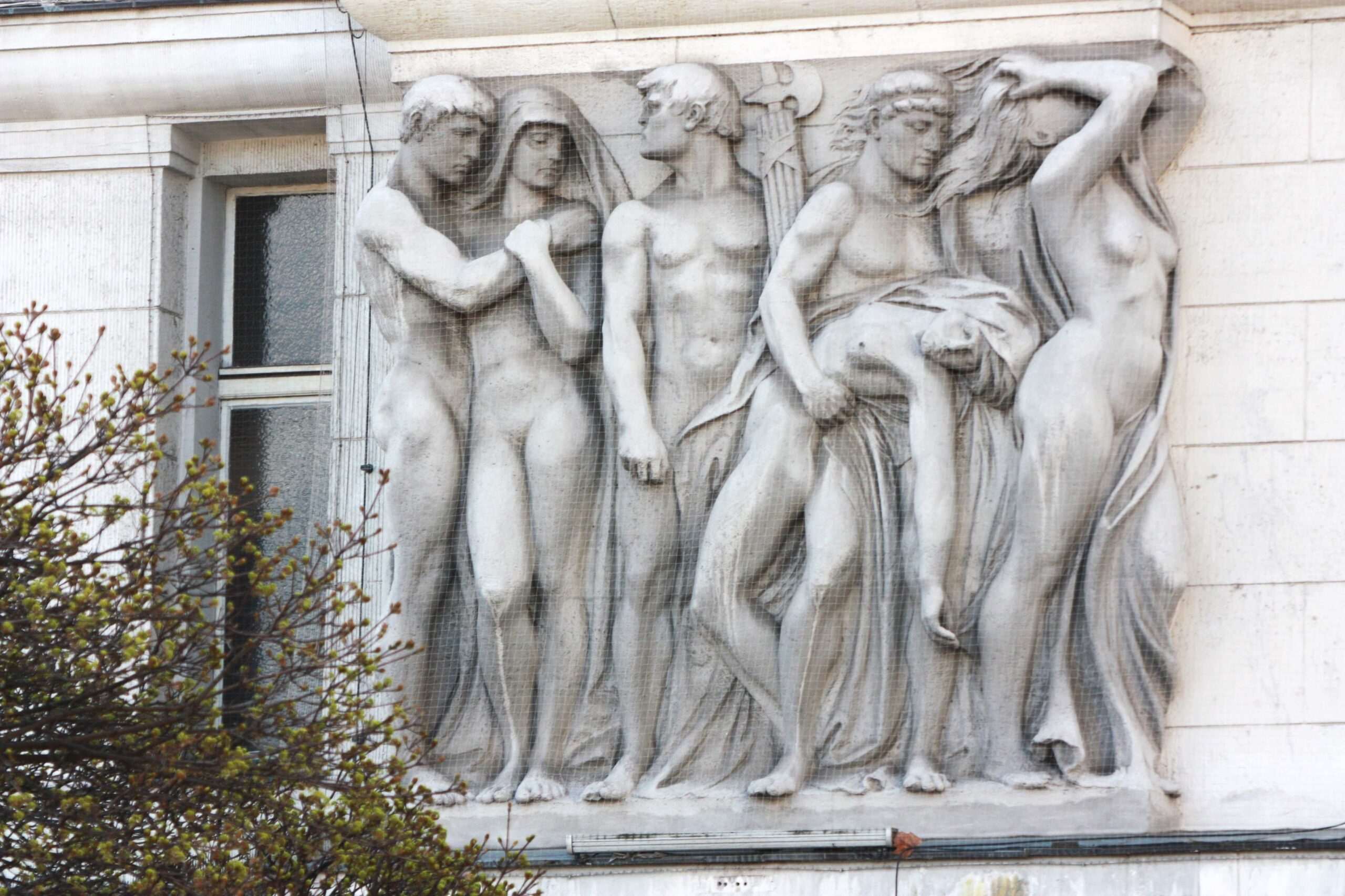 Die Reliefs hat Nikolaus Friedrich um 1905/06 entworfen. Ludwig Pietsch beschreibt die Darstellungen folgendermaßen: „Der Mittelteil des Hauptgebäudes wird von zwei starken glatten, etwas vortretenden Wandpilastern eingefasst, deren (...) Fuss von zwei meisterlichen symbolischen Reliefdarstellungen, „Freude“ und „Leid“, nach Modellen des Bildhauers Friedrich, umgeben wird …“. Die beiden mittleren Reliefs zeigen „zwei ebenfalls „Lust“ und „Schmerz“ versinnlichende, von Friedrich modellierte, hochrelief gemeisselte, nackte Gestaltenpaare“ (Nicola Vösgen).