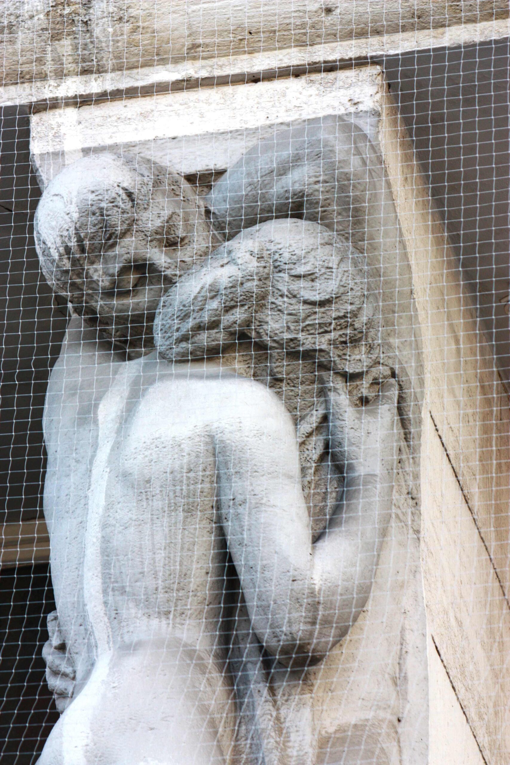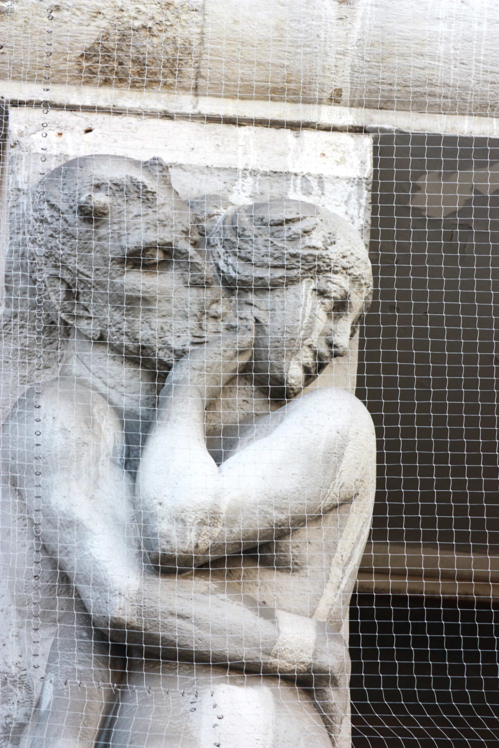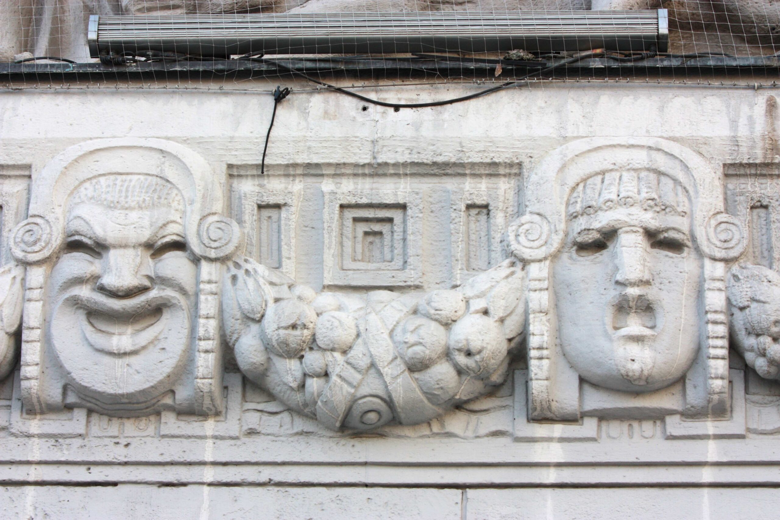 Unterhalb der beiden seitlichen Reliefs verlaufen Friese mit tragischen und komischen Masken zwischen Widderköpfen, die durch Fruchtfestons miteinander verbunden sind (Nicola Vösgen).