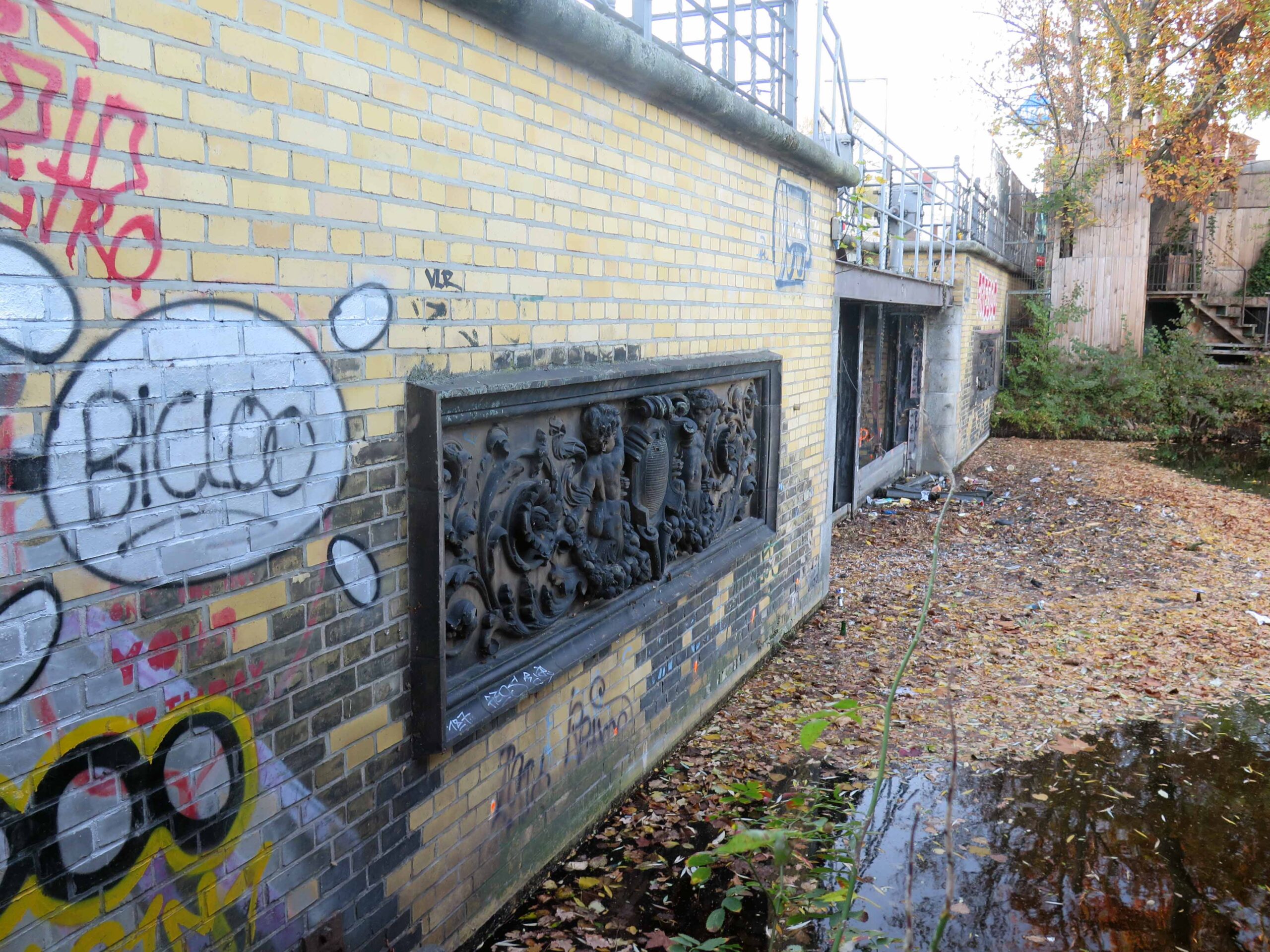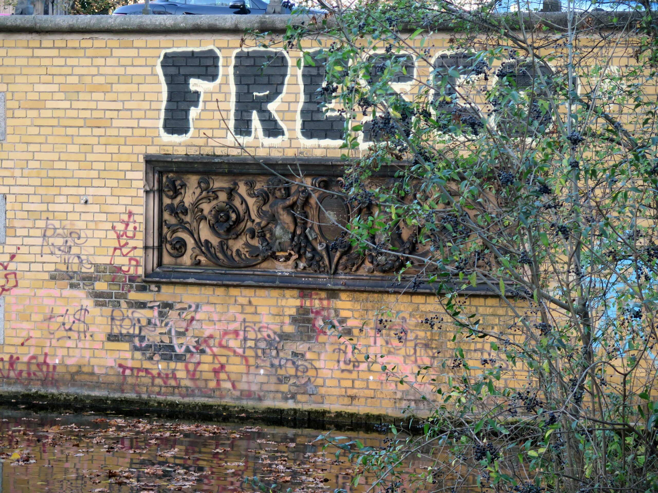 An den Auflager- Flächen der Oberen Freiarchenbrücke befinden sich je zwei querrechteckige Terrakotta-Reliefs mit identischen Darstellungen. In der Mitte der Tafeln eine von zwei Putten flankierte schraffierte Kartusche. Die Putti halten Fruchtgirlanden in den Händen, die seitlichen Felder sind mit Akanthusranken gefüllt (Nicola Vösgen).
