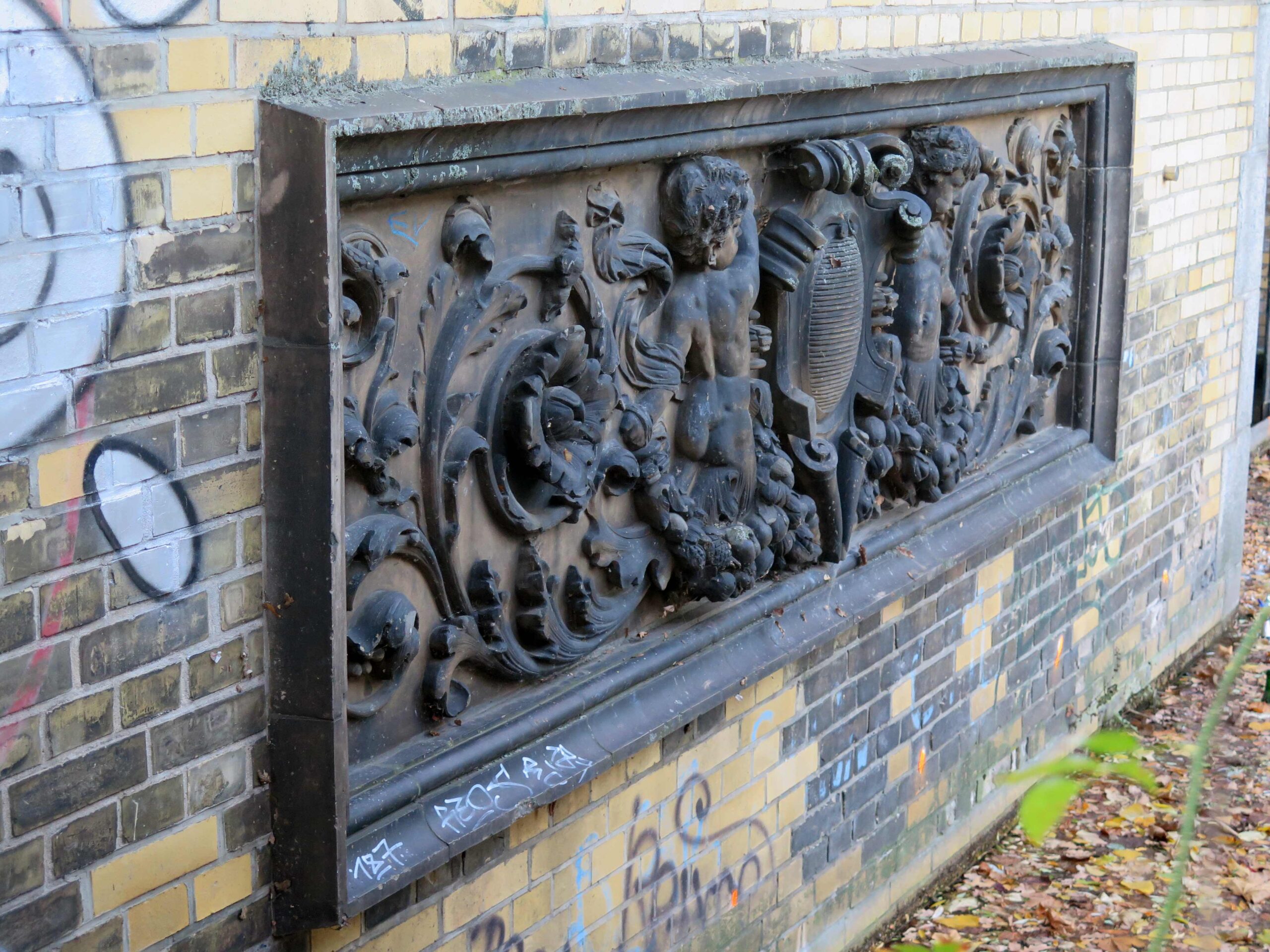 unvollständig, an dem südöstlichen Relief Teile der Girlande unterhalb des linken Putto abgebrochen