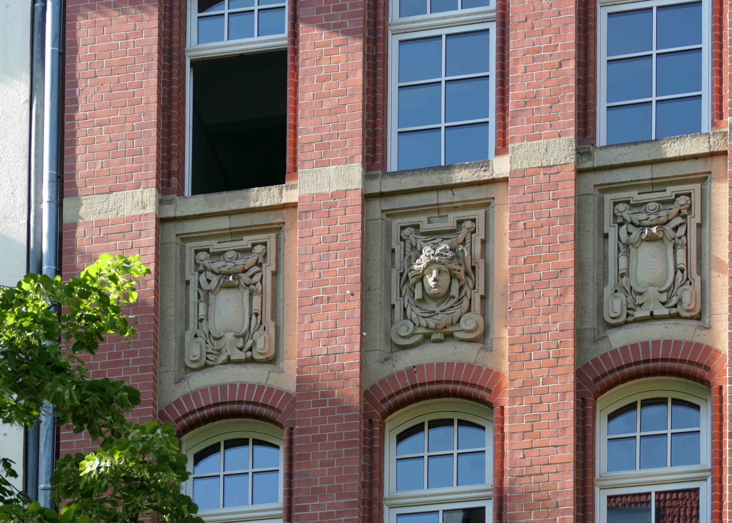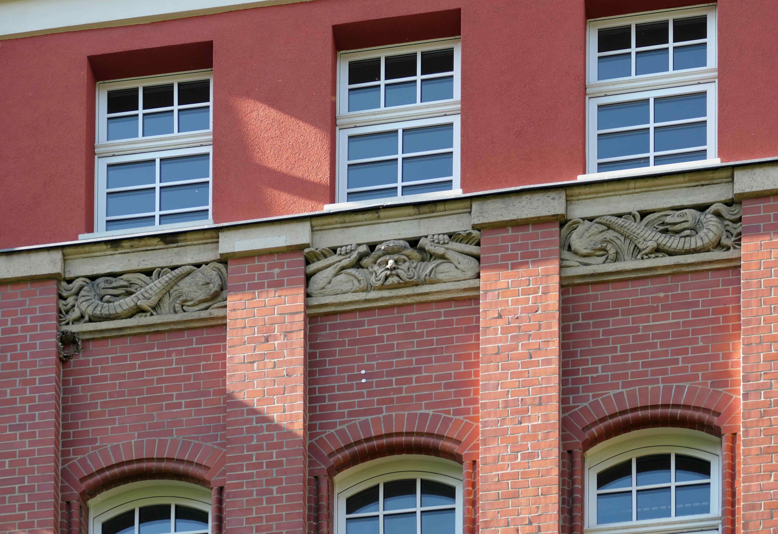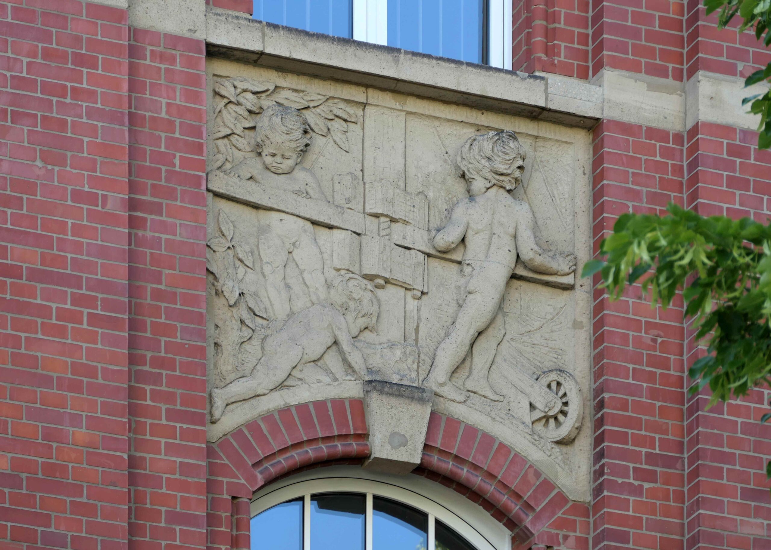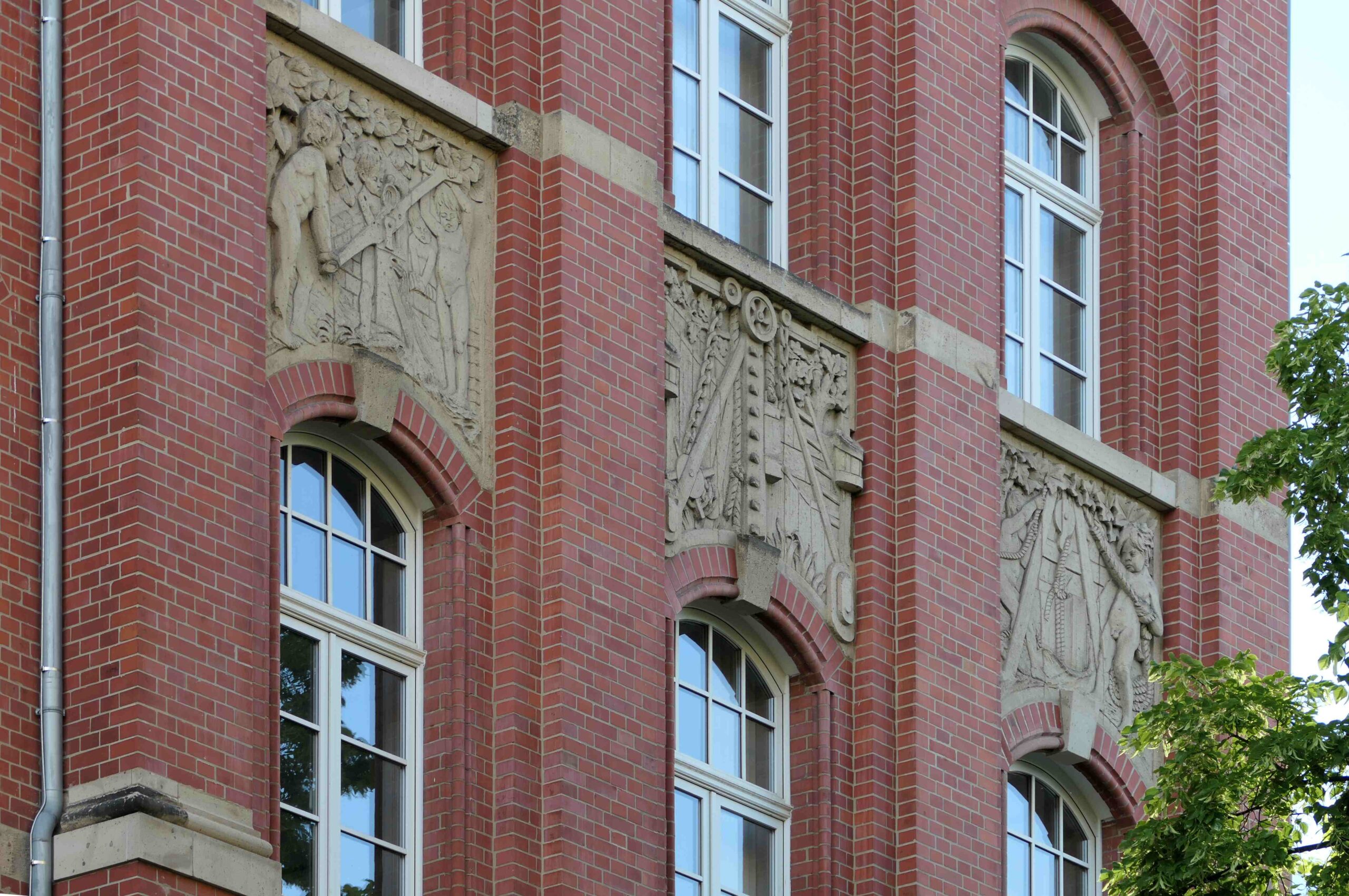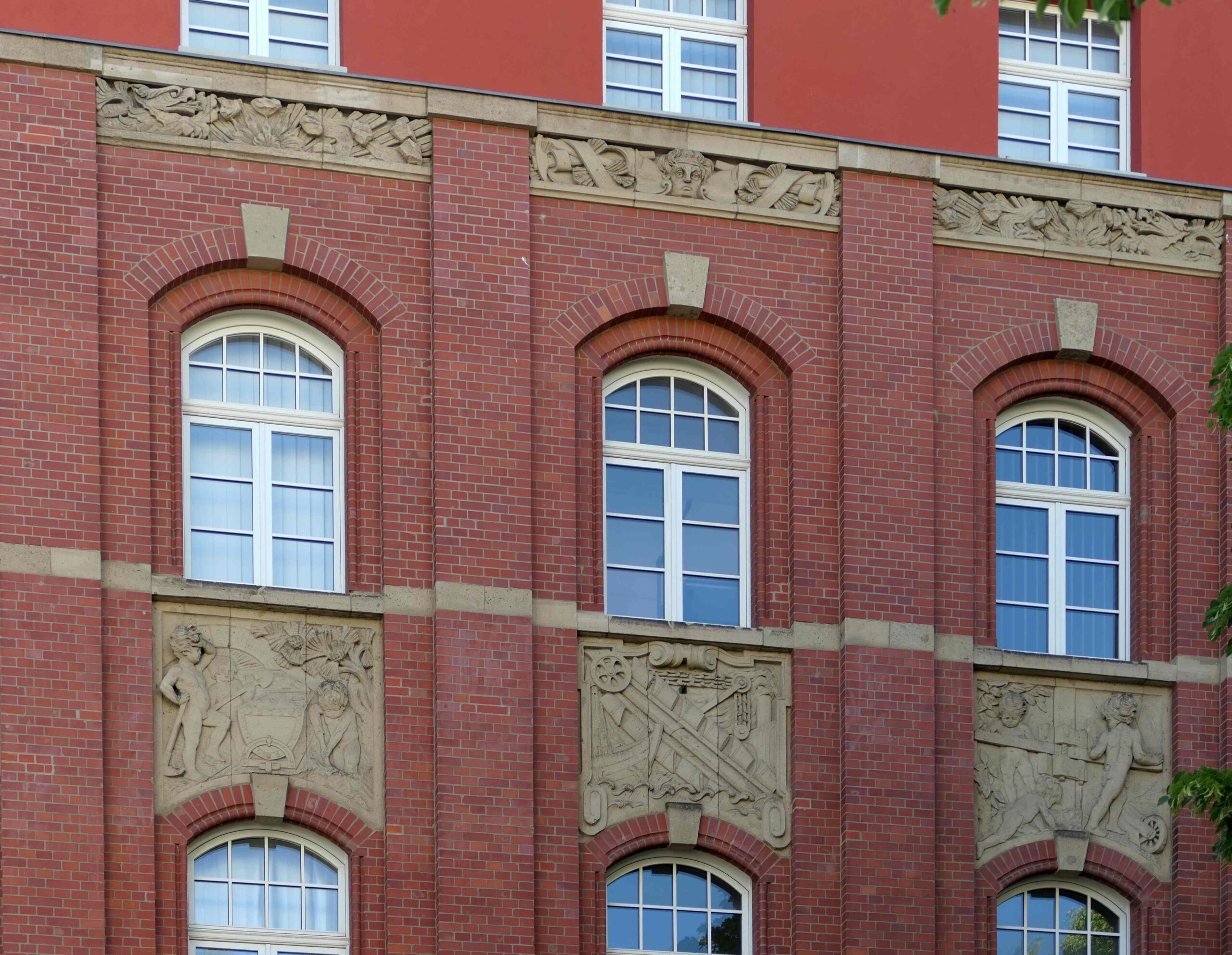 Oberhalb des zweiten Geschosses des ehemaligen Verwaltungsgebäudes der Deutschen Tiefbau-Gesellschaft befinden sich große Relieftafeln mit Kinderszenen und oberhalb des dritten Geschosses schmale Reliefs mit einzelnen figürlichen Darstellungen.
