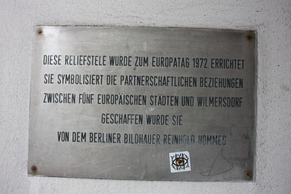 »DIE RELIEFSTELE WURDE ZUM EUROPATAG 1972 ERRICHTET / SIE SYMBOLISIERT DIE PARTNERSCHAFTLICHEN BEZIEHUNGEN / ZWISCHEN FÜNF EUROPÄISCHEN STÄDTEN UND WILMERSDORF / ERSCHAFFEN WURDE SIE / VON DEM BERLINER BILDHAUER REINHOLD HOMMES«