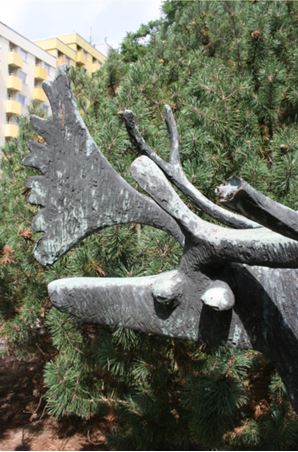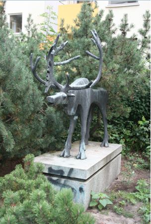 Auf einem Kunststeinsockel mit umlaufendem Rücksprung im oberen Bereich steht ohne Plinthe die abstrahierend formulierte Figur eines Rentieres mit abnorm geformten Geweih. Die Oberflächengestaltung, eine abstrahierende Fellzeichnung, entspricht der abstrakten Grundtendenz (Susanne Kähler).
