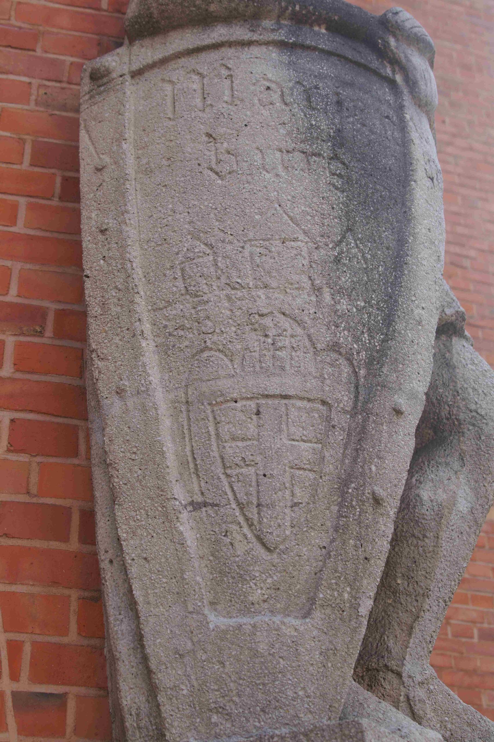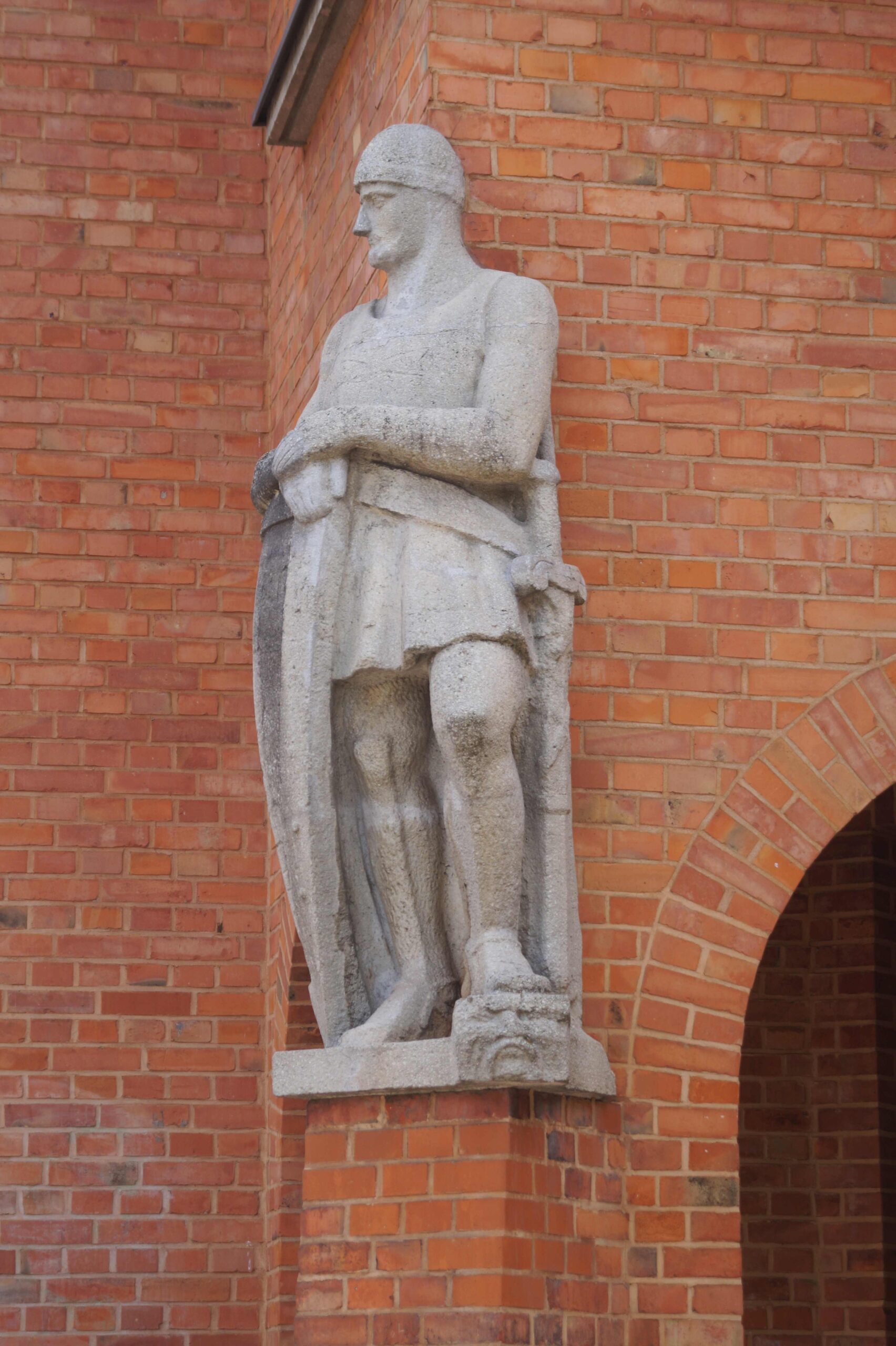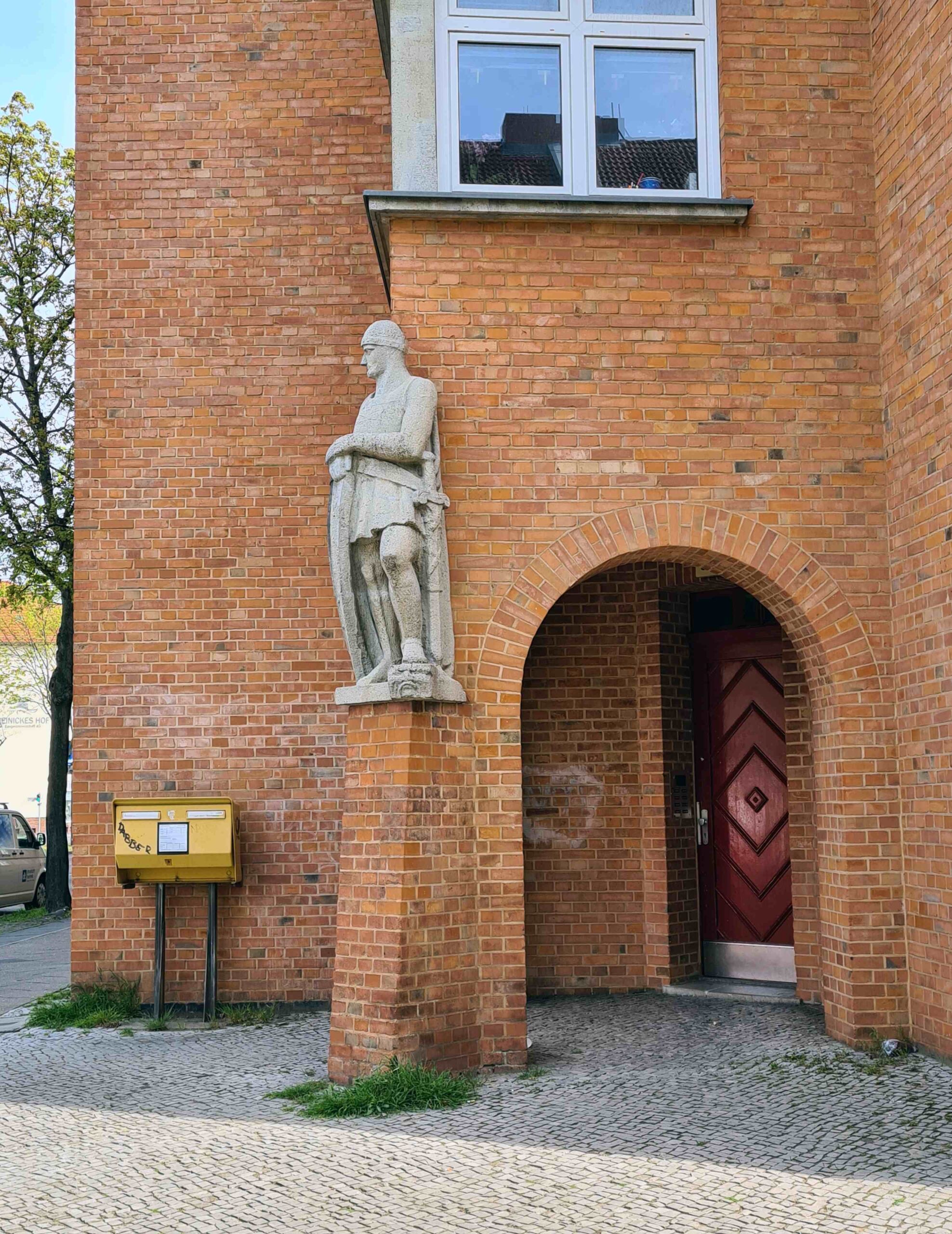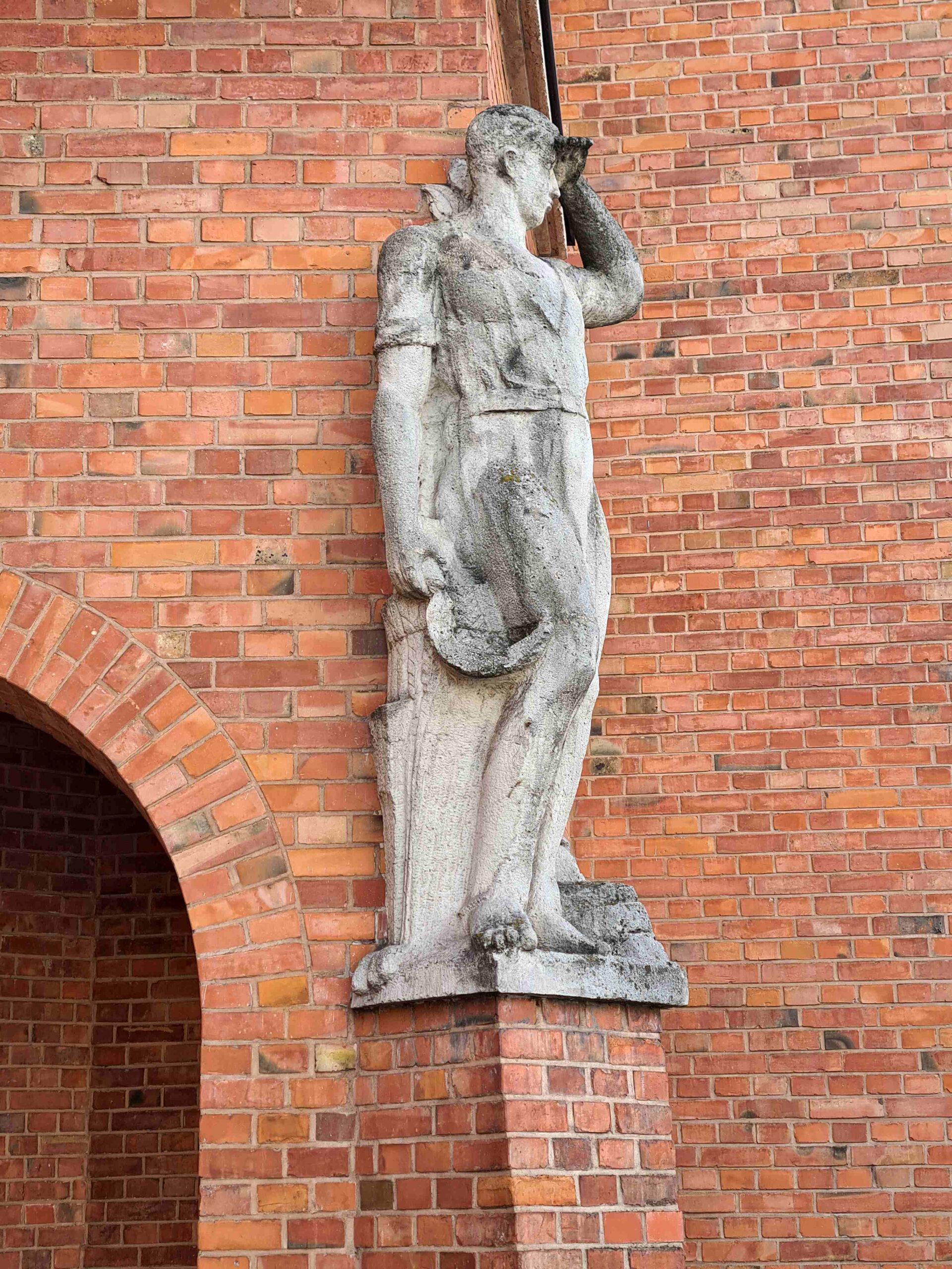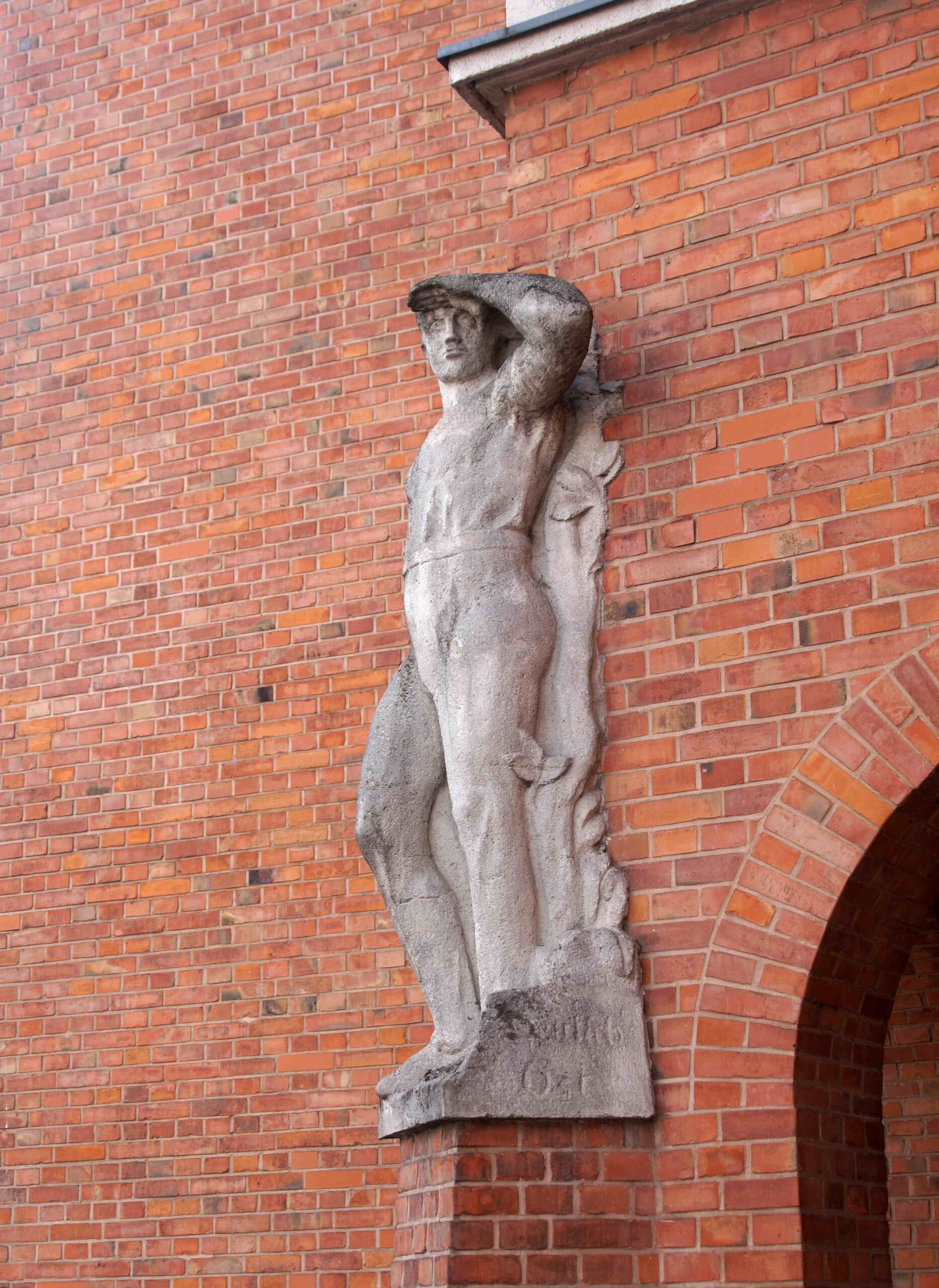 Die Statuen bestehen aus Kunststein und sind vermutlich mit der Fertigstellung des Wohnkomplexes um 1927 entstanden (Nicola Vösgen).