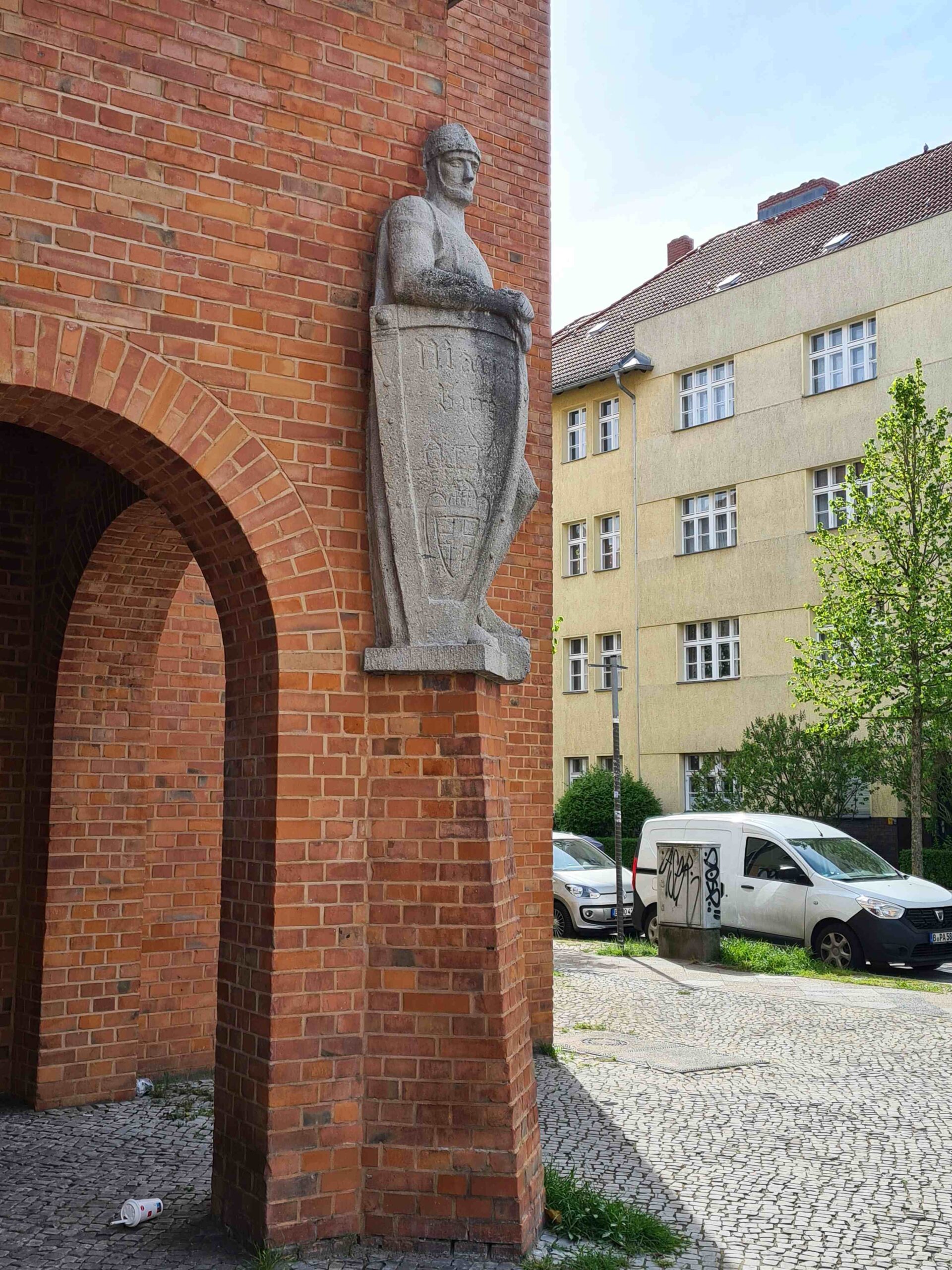 An den beiden Kreuzungen zur Ollenhauerstraße stehen auf gemauerten Sockeln Statuen, die vermutlich an die Herkunftsgebiete der Vertriebenen erinnern sollen: An der Ecke zur Lindauer Allee blickt ein Landarbeiter in die Ferne, an dem Sockel ist die Inschrift „Deutsch Ost“ eingemeißelt. An der Kreuzung zur Schulenburgstraße steht die Statue eines mittelalterlichen Ritters, auf seinem Schild ist der Schriftzug „Marienburg“ zu lesen (Nicola Vösgen).