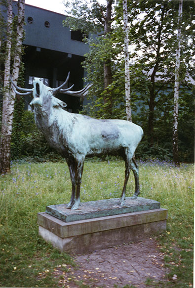 Die Bronzeplastik des gewaltigen Brunsthirsches steht auf einem rechteckigen Sockel aus rötlichem Sandstein in den Grünanlagen. Das stehende Tier hat die Vorderhufe parallel gestellt, der linke Hinterhuf ist nach vorne gesetzt. Der röhrende Zwölfender hält seinen Kopf erhoben und das Maul weit geöffnet. Der Hirsch wurde naturalistisch und mit feiner, die Fellstruktur wiedergebender Oberfläche wiedergegeben. Auf der Oberseite der rechteckigen Bronzeplinthe sind Hufspuren wiedergegeben (Susanne Kähler).
