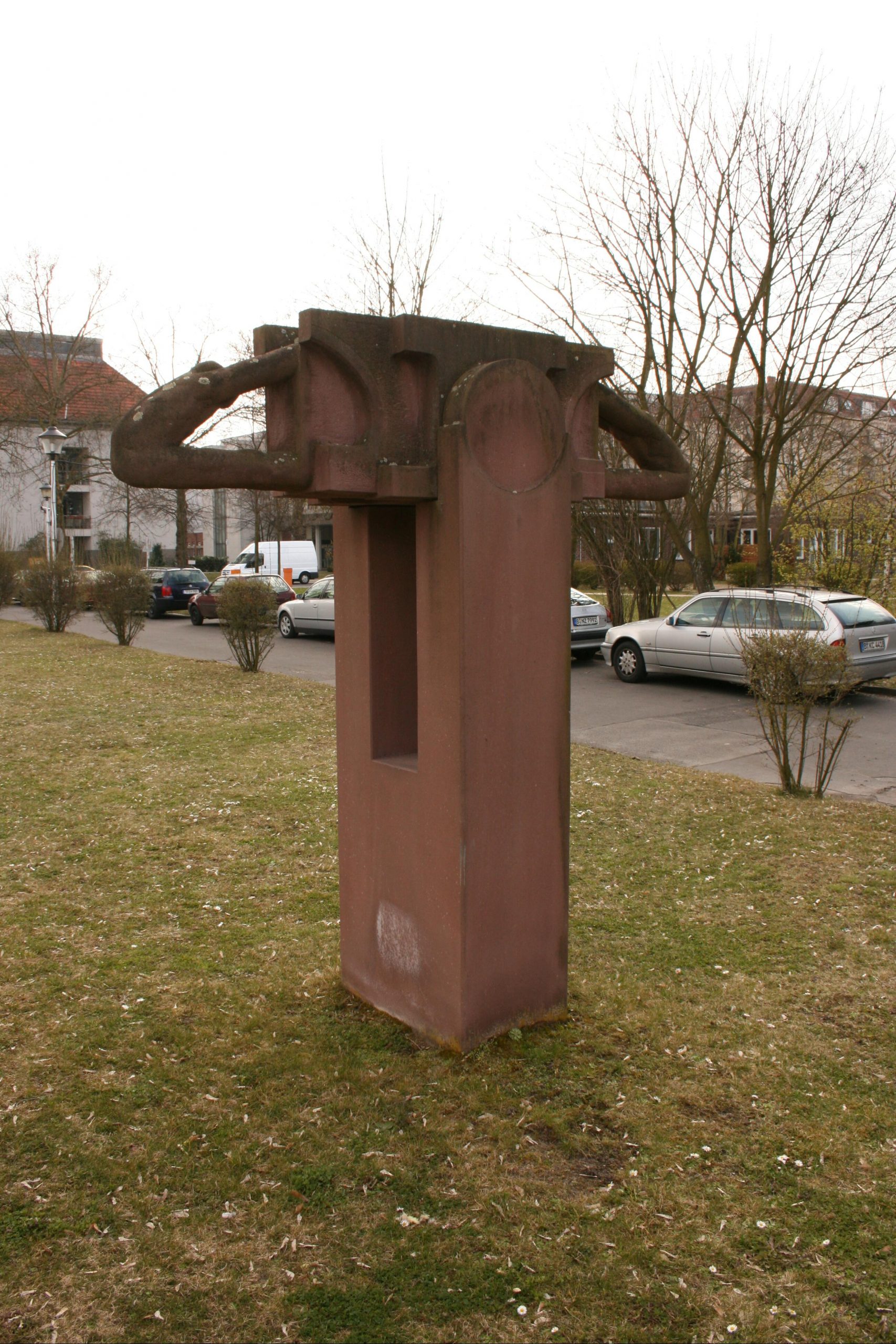 Die Skulptur steht auf der Rasenfläche, die links vom Hauptzugang zum Gelände an den Parkplatz grenzt. Das Material Sandstein ist in dem Skulpturenpark, dessen Objekte in den meisten Fällen eher aus Metall oder Beton gefertigt wurden, eher die Ausnahme. Trotzdem verweisen Thema und Formgebung von Pabels Beitrag auf moderne Technik und Stahlmaschinen. Zu erkennen ist ein Pfeiler in dessen oberen Bereich ein Gelenk eingearbeitet ist. Dargestellt ist an dem Gelenk ein waagerechter Balken, an dessen beiden Enden stilisierte Menschen mit ihren Händen und Füßen in die Apparatur eingehängt sind, Schwung zu holen scheinen, um ihren Balken zur Rotation zu bewegen. Der Aufbau der Skulptur ist streng symmetrisch, jedes persönliche Detail wird vermieden. Der Pfeiler mit dem wagerecht stehenden Querbalken, an dem zwei Menschen hängen, bietet auch Assoziationsmöglichkeiten zum christlichen