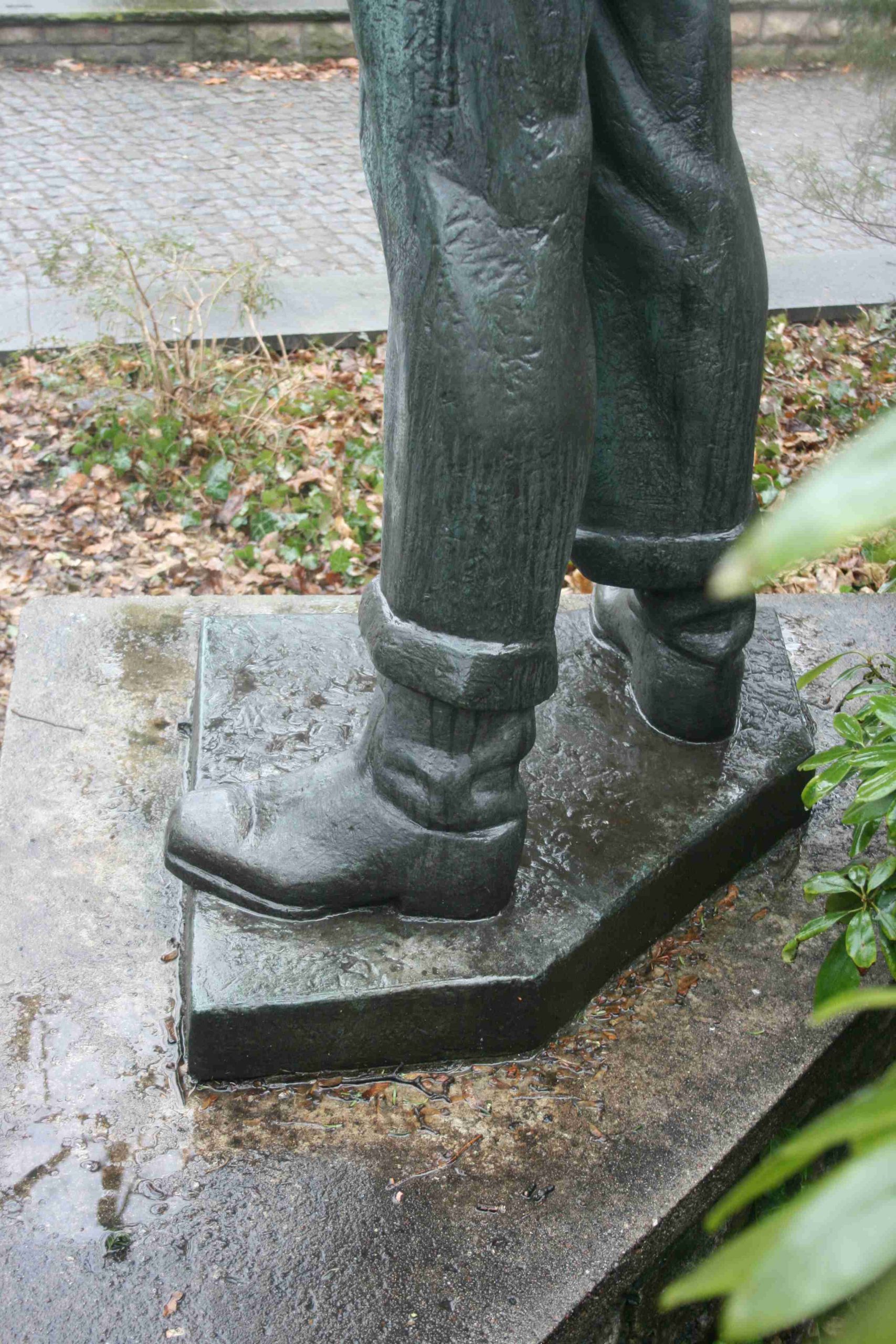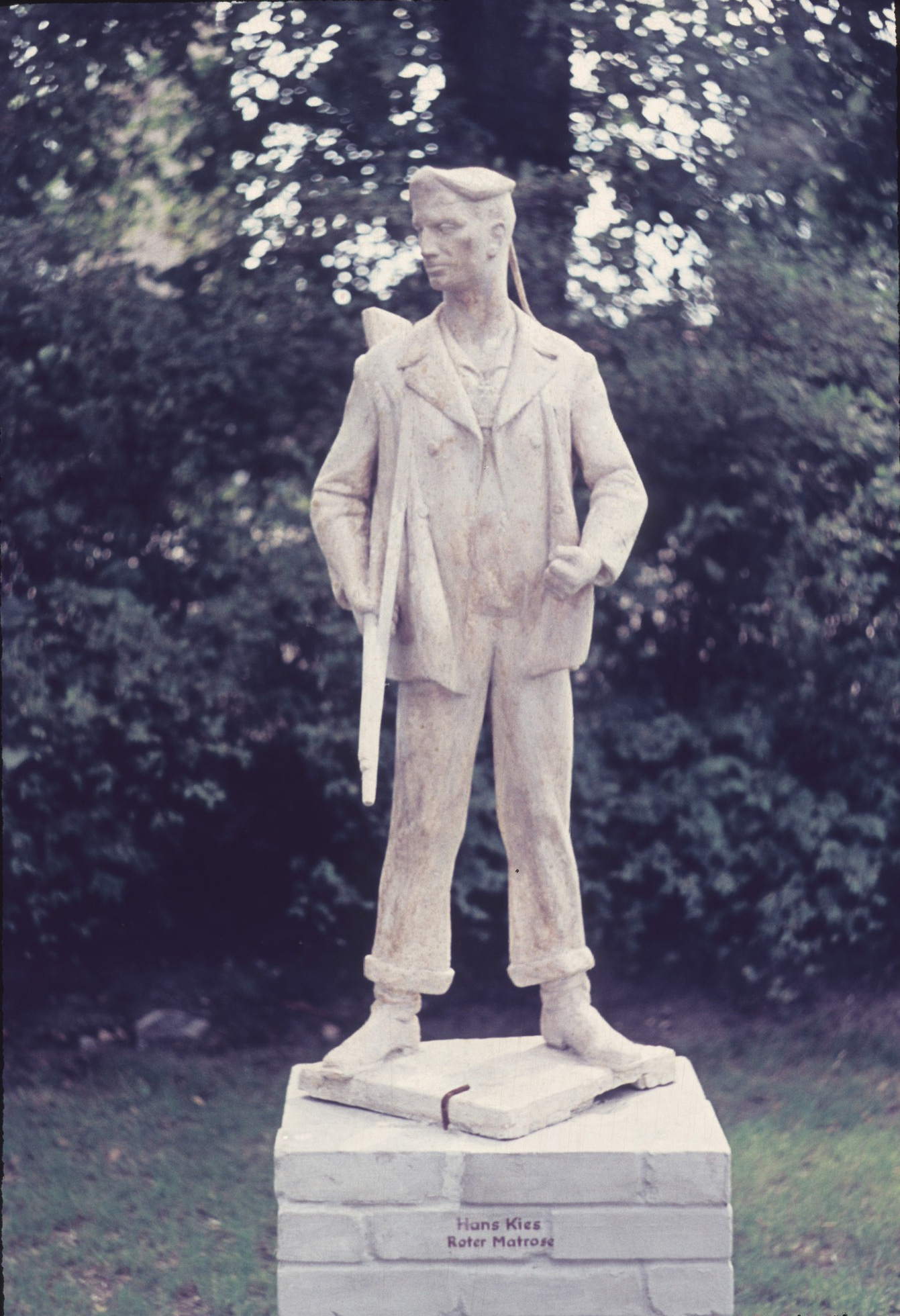 Überlebensgroße, im pointierten Realismus formulierte Bronzefigur eines berufsgemäß bekleideten, bewaffneten Matrosen. Die Plinthe ist hinten abgeschrägt.