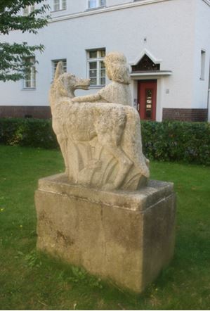 Auf einem rechteckigen Sockel steht auf rechteckiger Plinthe die aus Kunststein gegossene Gruppe „Rotkäppchen und der Wolf“. Der Wolfskörper ist durch eine Stütze mit der Plinthe verbunden. Die Stütze zeigt eine expressionistisch gestaltete Naturchiffre. Der Wolf wendet seinen Kopf zum neben ihm stehenden Rotkäppchen. Die Märchenmädchenfigur mit der namengebenden Kappe auf dem halblangen Haar ist mit einem Mantel mit einfacher Pelerine bekleidet. Am rechten Arm trägt das junge Mädchen den Korb mit Kuchen und Flasche, Gaben für die kranke Großmutter (Jörg Kuhn).