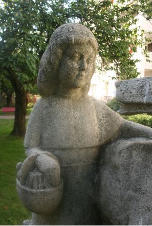 Auf einem rechteckigen Sockel steht auf rechteckiger Plinthe die aus Kunststein gegossene Gruppe „Rotkäppchen und der Wolf“. Der Wolfskörper ist durch eine Stütze mit der Plinthe verbunden. Die Stütze zeigt eine expressionistisch gestaltete Naturchiffre. Der Wolf wendet seinen Kopf zum neben ihm stehenden Rotkäppchen. Die Märchenmädchenfigur mit der namengebenden Kappe auf dem halblangen Haar ist mit einem Mantel mit einfacher Pelerine bekleidet. Am rechten Arm trägt das junge Mädchen den Korb mit Kuchen und Flasche, Gaben für die kranke Großmutter (Jörg Kuhn).