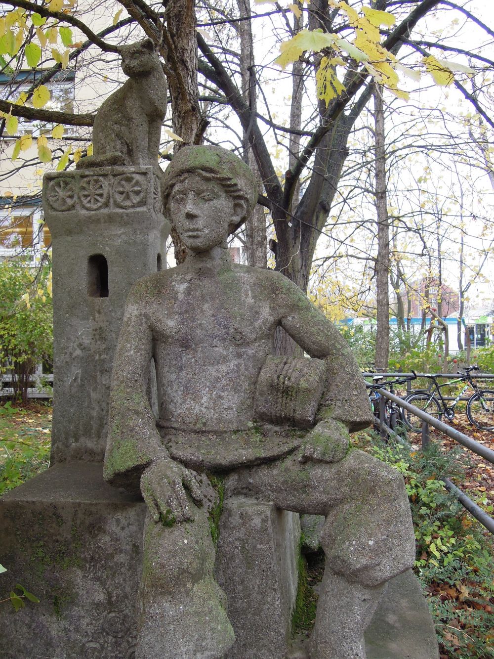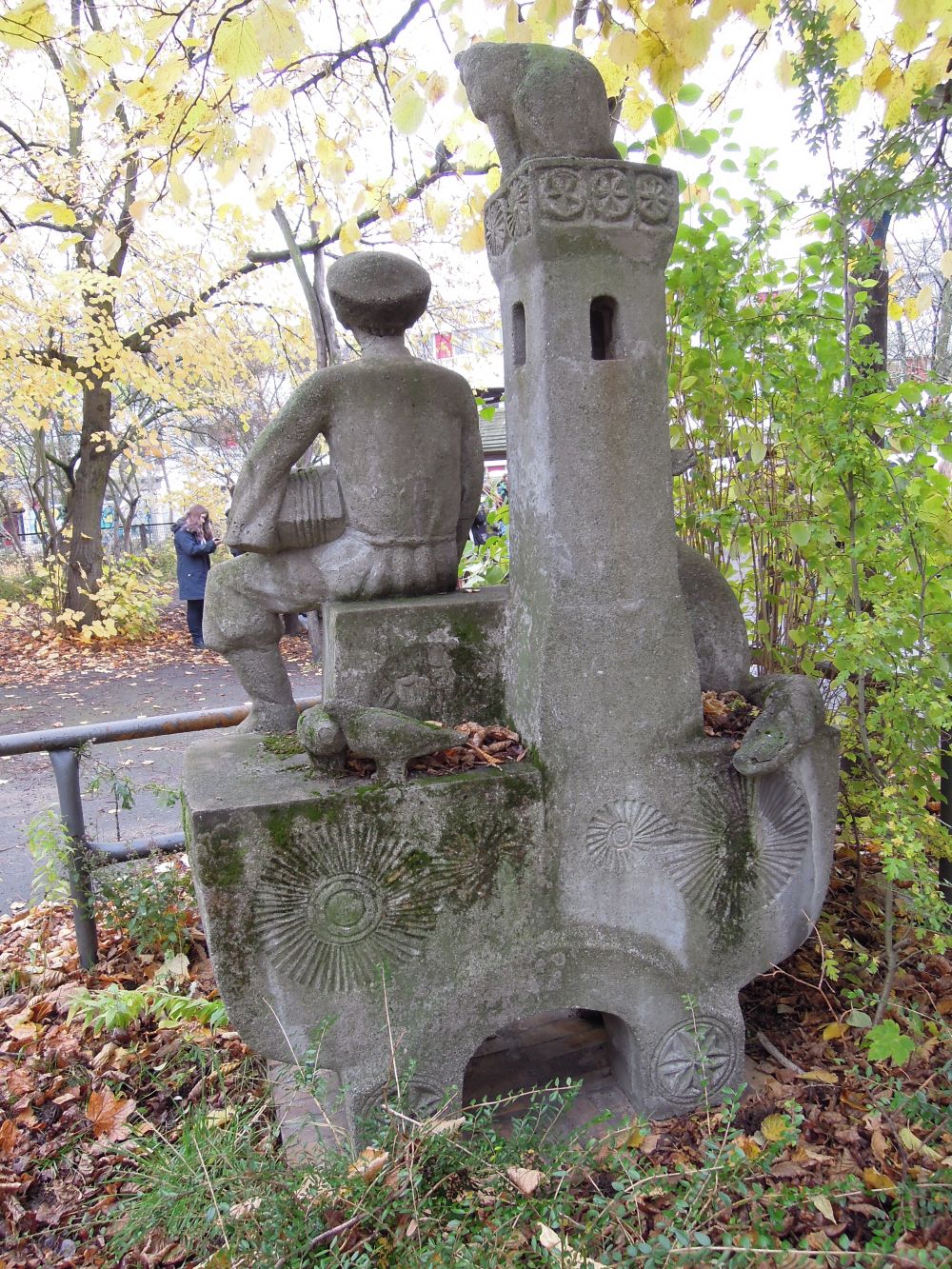 Die von Nikolaus Bode geschaffene Plastik ist eine inszenierte Figurengruppe in Betonguss. Sie stellt einen humorvoll gestalteten Russischen Ofen dar: auf den Abstufungen des Ofens sitzt ein junger Mann, ein Bauer in russischer Landestracht, mit einem Holzscheit (wohl eher ein Torfbrikett) unter dem linken Arm, um ihm herum und auf dem Rauchschlot sind Tiere – Hund, Katze, Taube – platziert. Der Kopf des Rauchschlots und die Ofenseiten sind mit alten russischen Ornamenten geschmückt (Rad, Sonne) (Jürgen Tomisch).