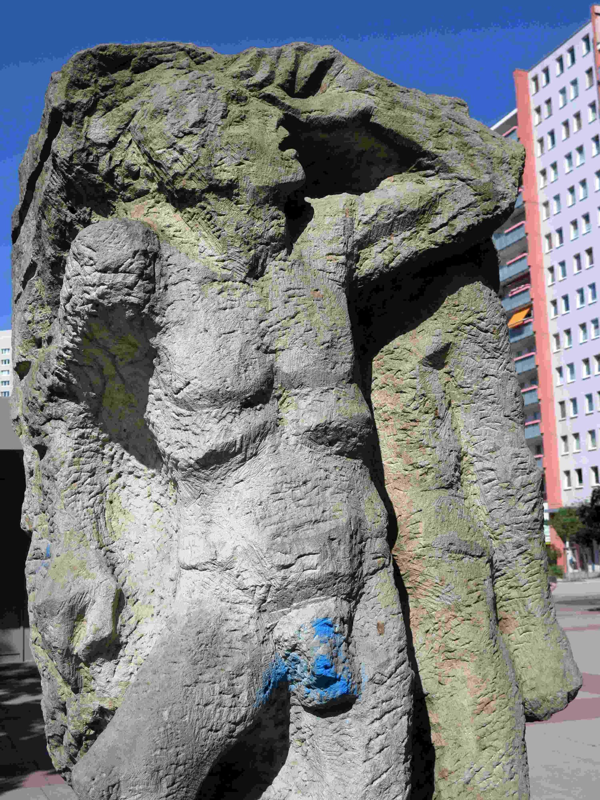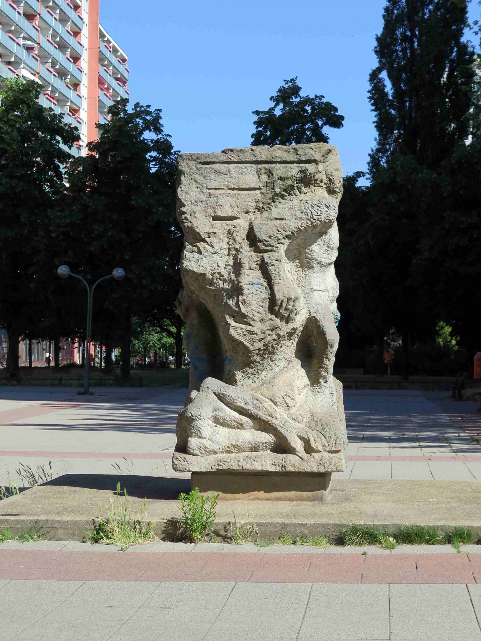 Auf dem Anton-Saefkow-Platz, am Ende des von Norden kommenden Boulevards, steht an der südöstlichen Platz-Ecke die Anton-Saefkow-Ehrung. Der monumentale weit überlebensgroße Steinblock auf quadratischem Grundriss zeigt mehrere plastisch aus dem Steinblock herausgearbeitete unbekleidete Männer, die sich vor dem Stein winden bzw. in den Stein gepresst werden. An der Vorderseite ist ein Mann von in Frontalansicht zu erkennen, den linken Arm an die Stirn erhoben, der rechte Arm scheint hinter ihm gefesselt zu sein, der Mund ist zu einem lautlosen Schrei geöffnet. An der Rückseite ist ein Mann in Rückenansicht dargestellt, beide Arme auf dem Rücken gefesselt, er wird von einer aus dem Stein erwachsenden Hand an den Stein gedrückt. An der linken Seite befindet sich im unteren Bereich kauernde Gestalten, an der rechten Seite eine weitere frontal dargestellte stehende Figur, die Arme schützend vor dem Körper verschränkt, mit den Händen eine Schale formend. Die dramatisch-expressiven Darstellungen symbolisieren vor allem Gewalt und Fesselung der Opfer, aber auch Auflehnung und Sehnsucht nach Freiheit. Ein Metallschild auf der südöstlichen Ecke der erhöhten Standfläche informiert über die Idee des Denkmals und den Bildhauer: Steinstele / ‚Deutscher Widerstand / gegen den Faschismus‘ / Idee und Ausführung (1986) : S. Krepp (Nicola Vösgen)