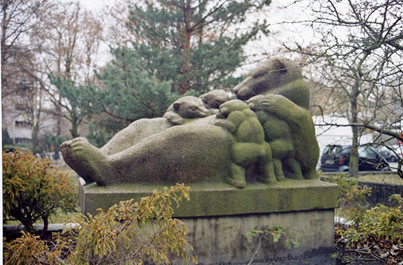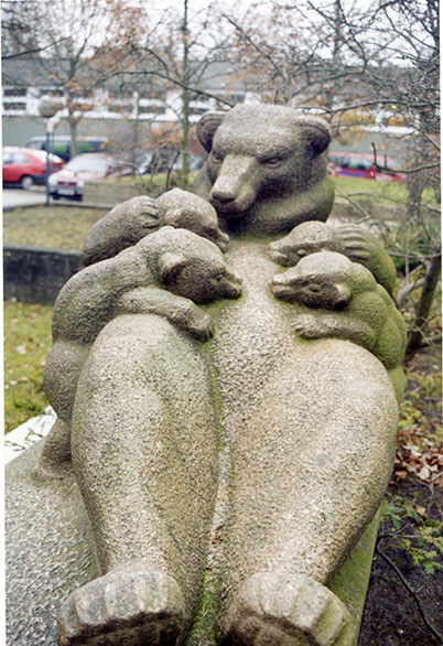 Links der Treppenanlage vor dem Finanzamt Zehlendorf wurde innerhalb des aus Betonelementen zusammengesetzten, gegenüber dem Straßenniveau erhöhten Pflanzbeetes auf einem rechteckigen Betonsockel die Granitskulptur der ihre vier Jungen säugenden Bärin aufgestellt. Die Bärin ist auf dem Rücken liegend mit angehobenen Kopf dargestellt. Die vier Jungen hocken, jeweils zwei an jeder Seite, an ihrer Brust. Die Skulptur ist annähernd achsensymmetrisch im Aufbau (Jörg Kuhn).