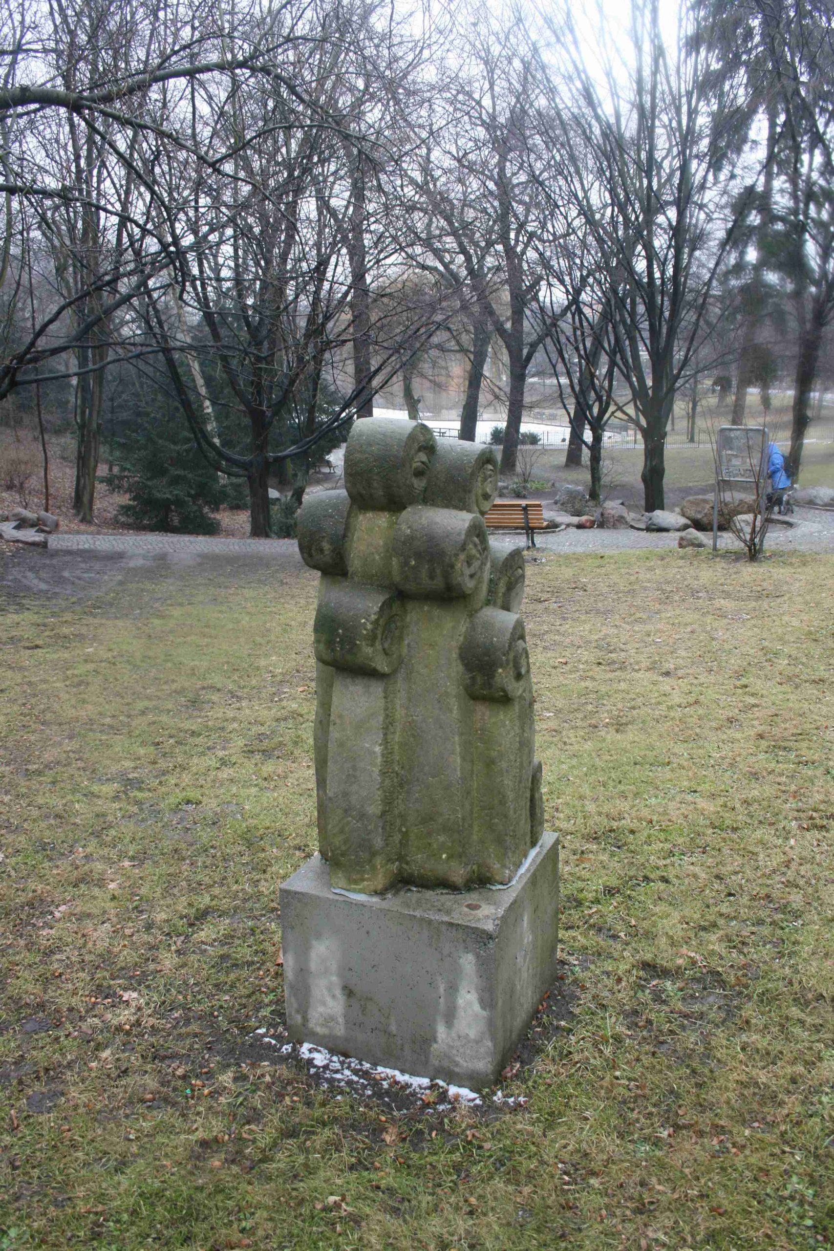 Die Sandsteinfigur stammt aus unbekanntem Kontext. Neben mehreren weiteren Spolien, Architekturteilen, die sich nach der Wende in den Depots des Grünflächenamts gefunden haben, hat der technische Leiter des Grünflächenamts, Adalbert-Maria Klees, die Aufstellung dieser Sandsteinfigur im Park veranlasst, um einen Blickpunkt zu schaffen. Die ursprüngliche Funktion dieses Elements ist schwer zu bestimmen, vermutlich war sie Teil einer größeren Sandsteinfigur (Jörg Kuhn).