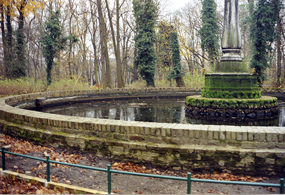 Aus Backstein gemauertes Rundreservoir mit einem modernen, grünlackierten aufgeständerten Eisenzaun. Auf einem polygonalen Sockel (Piedestal) im Zentrum mit drei Schichten von Steinen mit einer gotisierenden Gestaltung steht eine zweiteilige „Säulenschale“ aus Eisen