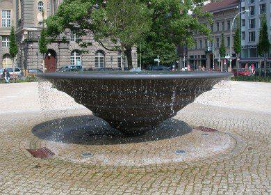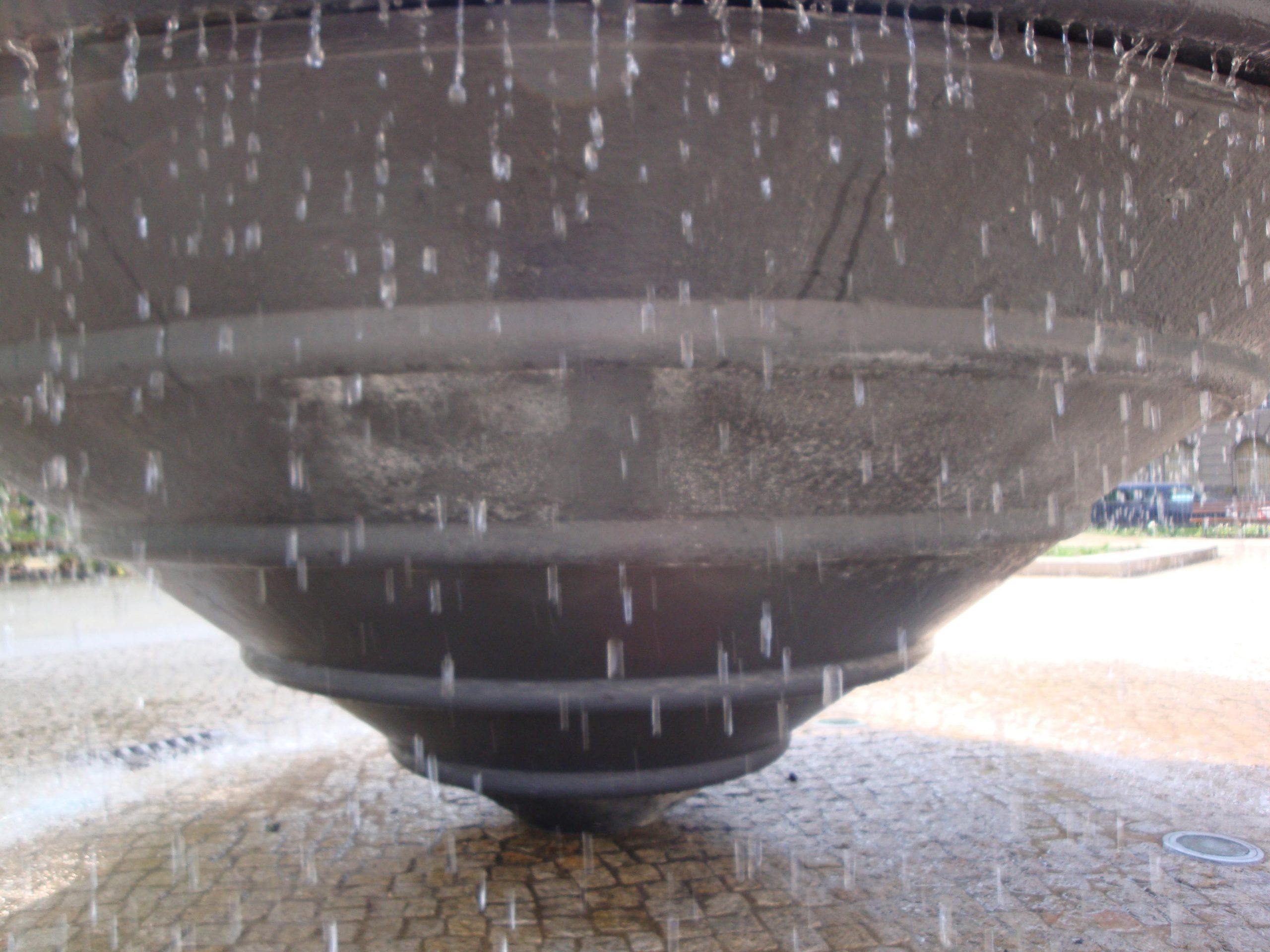 Gusseiserne Brunnenplastik in Gestalt einer auf der Spitze stehenden, monumentalen spielkreiselförmigen Schale auf einem runden, gepflasterten Platz. In der Mitte birgt das Schaleninnere eine Düse, aus der das Wasser in einer kleinen kompakten Fontäne austritt, sich in der Schalenmulde sammelt, um dann gleichmäßig als Tropfenvorhang über den Schalenrand hinab zu rinnen. Hier trifft das Wasser auf eine kreisförmig im umgebenden Granitkleinpflaster angelegte Rinne, die es zu den beiden mit Schutzgitter versehenen Ablaufschächten leitet. Sechs versenkte Scheinwerfer beleuchten den Brunnen nachts von unten. Zugeordnet ist eine eiserne, rechteckige Inschriftenplatte mit erhaben gegossenen Lettern mit der Widmung (Jörg Kuhn).