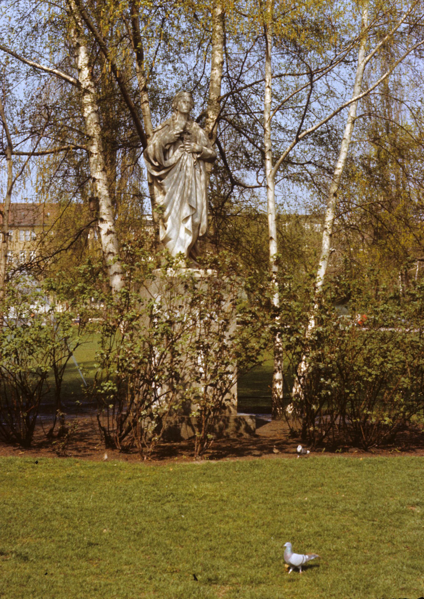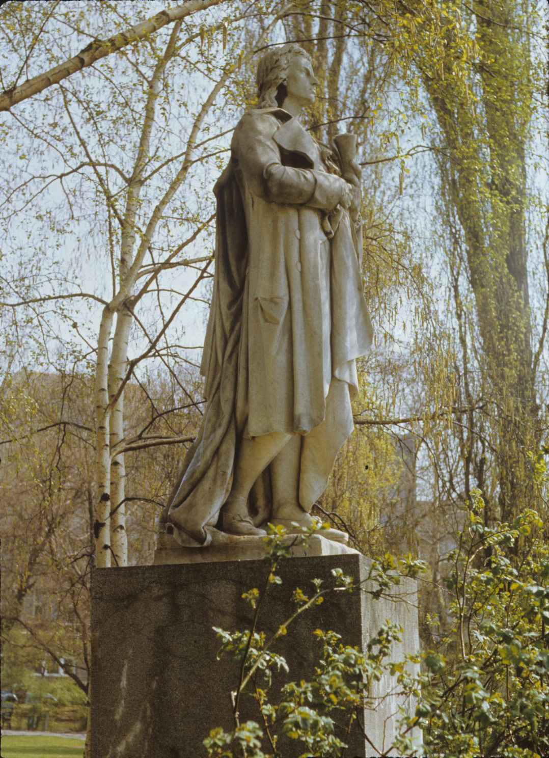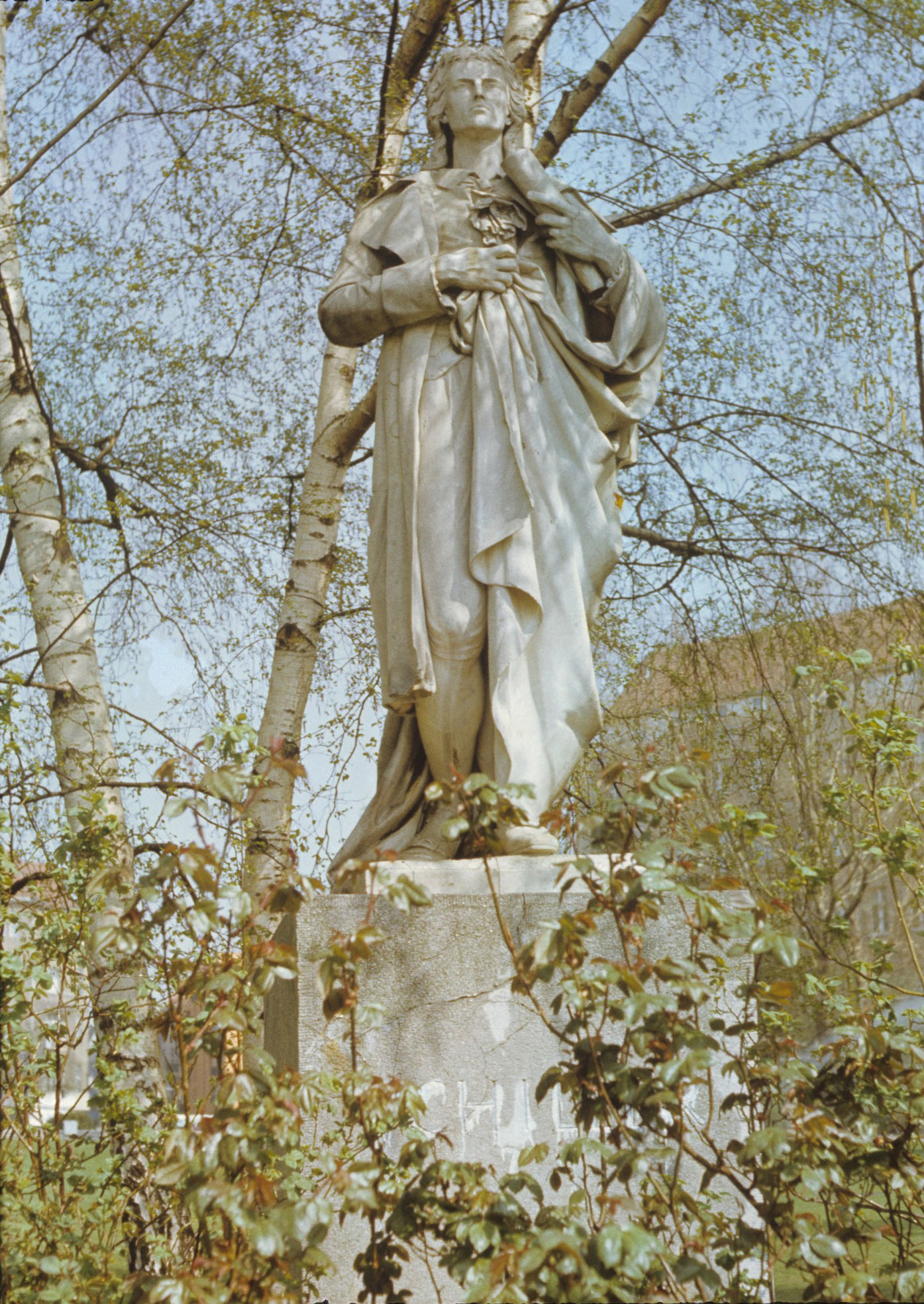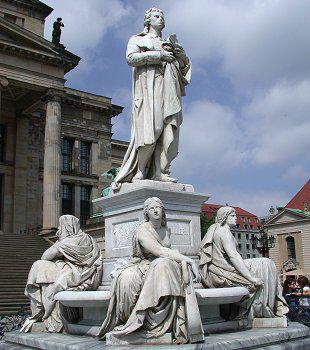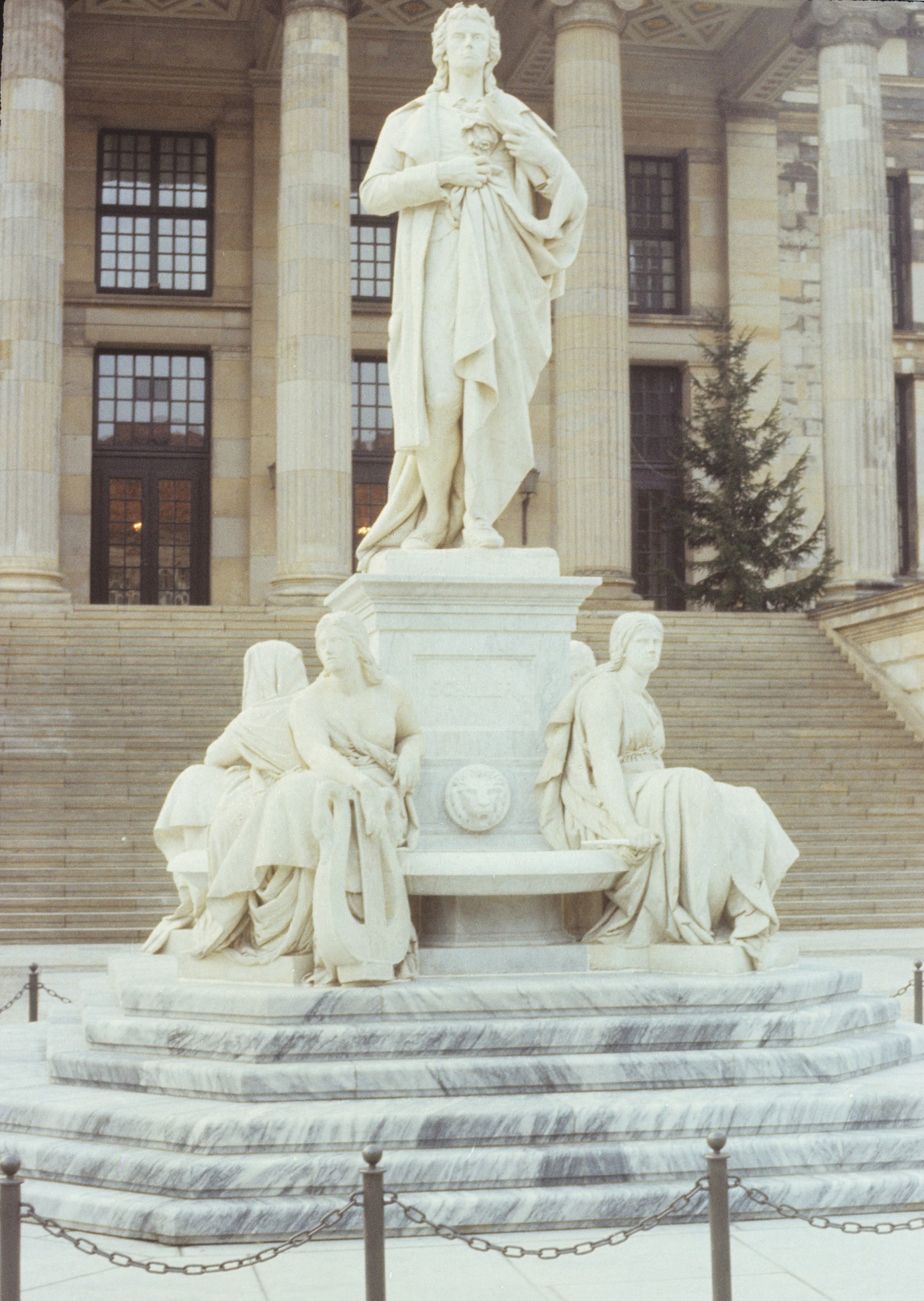 Die Planung zu einem Drei-Dichter-Denkmal - Goethe, Schiller, Lessing - begann schon früh im 19. Jahrhundert, scheiterte aber an den politischen Gegebenheiten und der nach Autonomie strebenden verschiedenen Denkmalkomitees. 1880 konnte das Goethedenkmal im Großen Tiergarten enthüllt werden, 1890 das Lessingdenkmal nicht allzu weit davon. Allein das Schillerdenkmal konnte in der (barocken) Innenstadt aufgestellt werden. Die Grundsteinlegung zum Denkmal erfolgte am 10.11.1859, dem 100. Geburtstag Schillers. Am 10.11.1861 lobte der Berliner Magistrat einen Wettbewerb aus. Beauftragt wurde dann Reinhold Begas (1831-1911). Die Ausführung erfolgte 1864-1869. Die Einweihung erfolgte am 10.11.1871. 1935/1936 wurde das Denkmal demontiert. 1951/52-1986 stand die Standfigur Schillers im Lietzenseepark im Berliner Westen. Im Rahmen eines Kulturgüteraustauschs gelangte die Skulptur wieder nach Berlin (Ost) und konnte Ende 1988 nach Restaurierung der stark in Mitleidenschaft gezogenen, im Depot in Friedrichsfelde gelagerten Sockelfiguren und nach Rekonstruktion des samt Löwenkopfwasserspeiern und Reliefs verlorenen Sockels wieder aufgestellt werden. Nach 1990 wurde das 1988 etwas übereilt aufgestellte Denkmal schon mehrfach restauriert und das zunächst nur in Gestalt einer einfachen Pfosten-Ketten-Konstruktion ersetzte, nach 1945 verloren gegangene Gitter rekonstruiert. Im Herbst 2006 erfolgte eine umfassende Sanierung mit Ergänzung verloren gegangener Details (etwa Dolch bei der Allegorie des Tragödie). Hinweis: Aus dem 1934 abgebauten und eingeschmolzenen Rathenau-Brunnen im Volkspark Rehberge wurde 1941 eine bronzene Kopie des Begasschen Schillerdenkmals gegossen und im Weddinger Schillerpark aufgestellt (Jörg Kuhn).