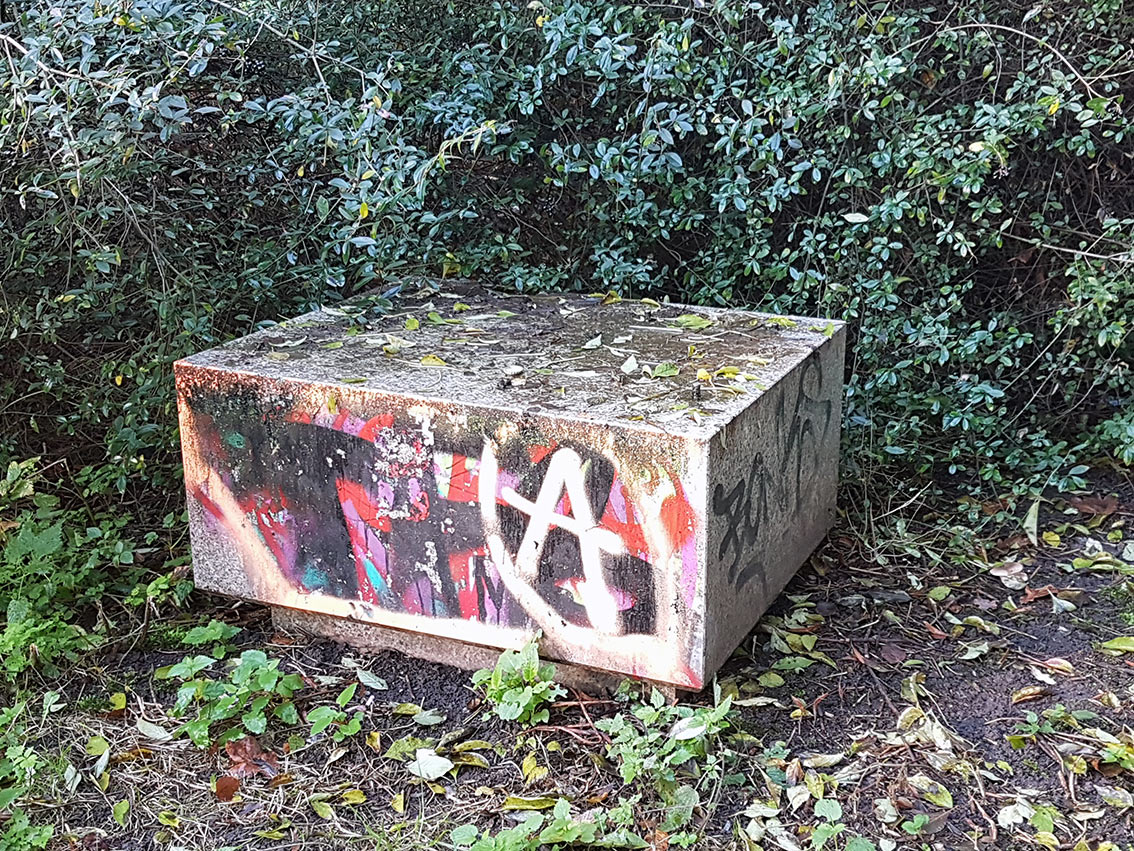 Auf einem quaderförmigen Sockel aus grauem Granit stehen zwei junge Schimpansen dicht nebeneinander. Der (vom Betrachter aus) rechte Schimpanse hat seine Hand auf den Rücken des anderen gelegt. Der rechte Schimpanse schaut freundlich, der linke ernst. Die beiden Tiere sind naturnah und leicht stilisiert formuliert (Susanne Kähler, Nicola Vösgen).