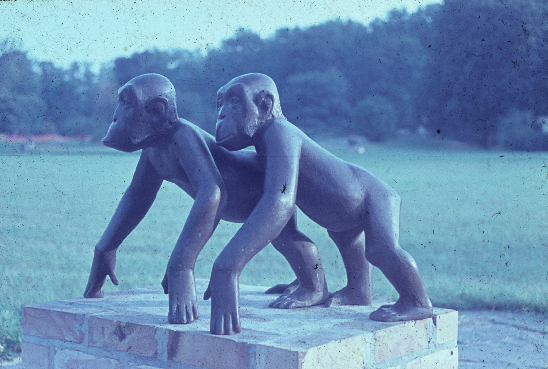 Auf einem quaderförmigen Sockel aus grauem Granit stehen zwei junge Schimpansen dicht nebeneinander. Der (vom Betrachter aus) rechte Schimpanse hat seine Hand auf den Rücken des anderen gelegt. Der rechte Schimpanse schaut freundlich, der linke ernst. Die beiden Tiere sind naturnah und leicht stilisiert formuliert (Susanne Kähler, Nicola Vösgen).