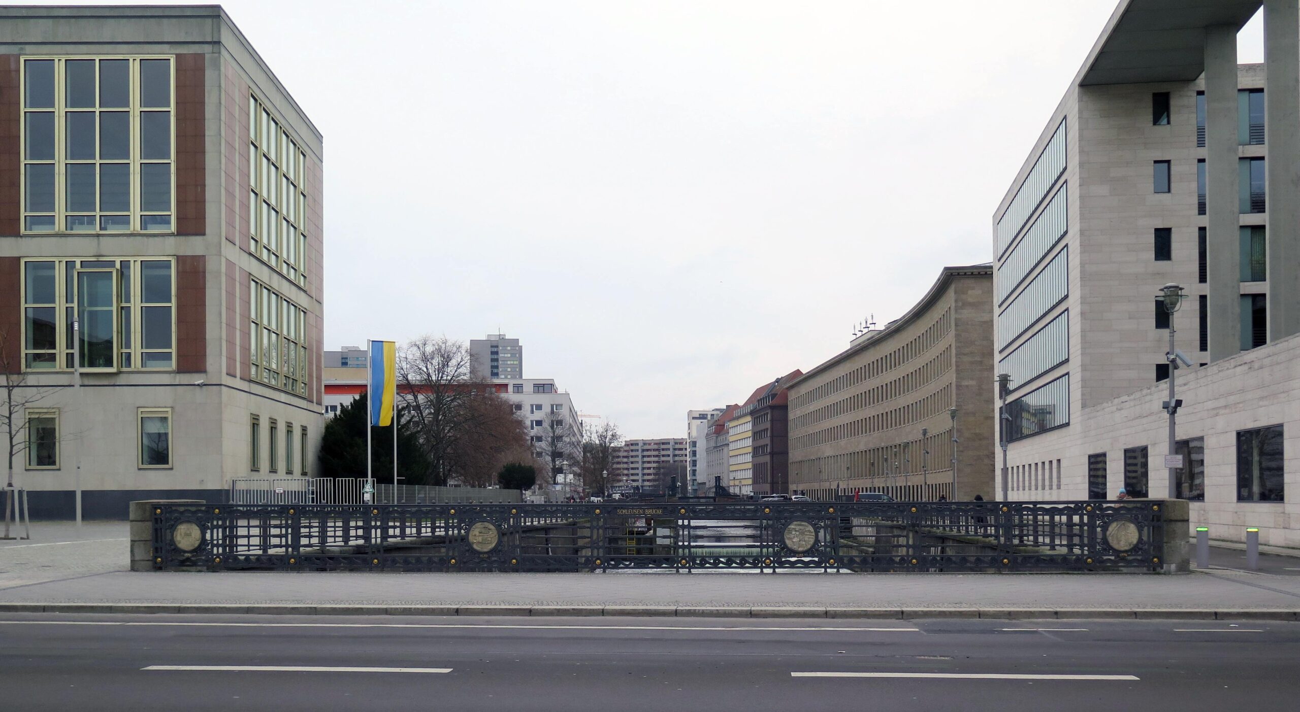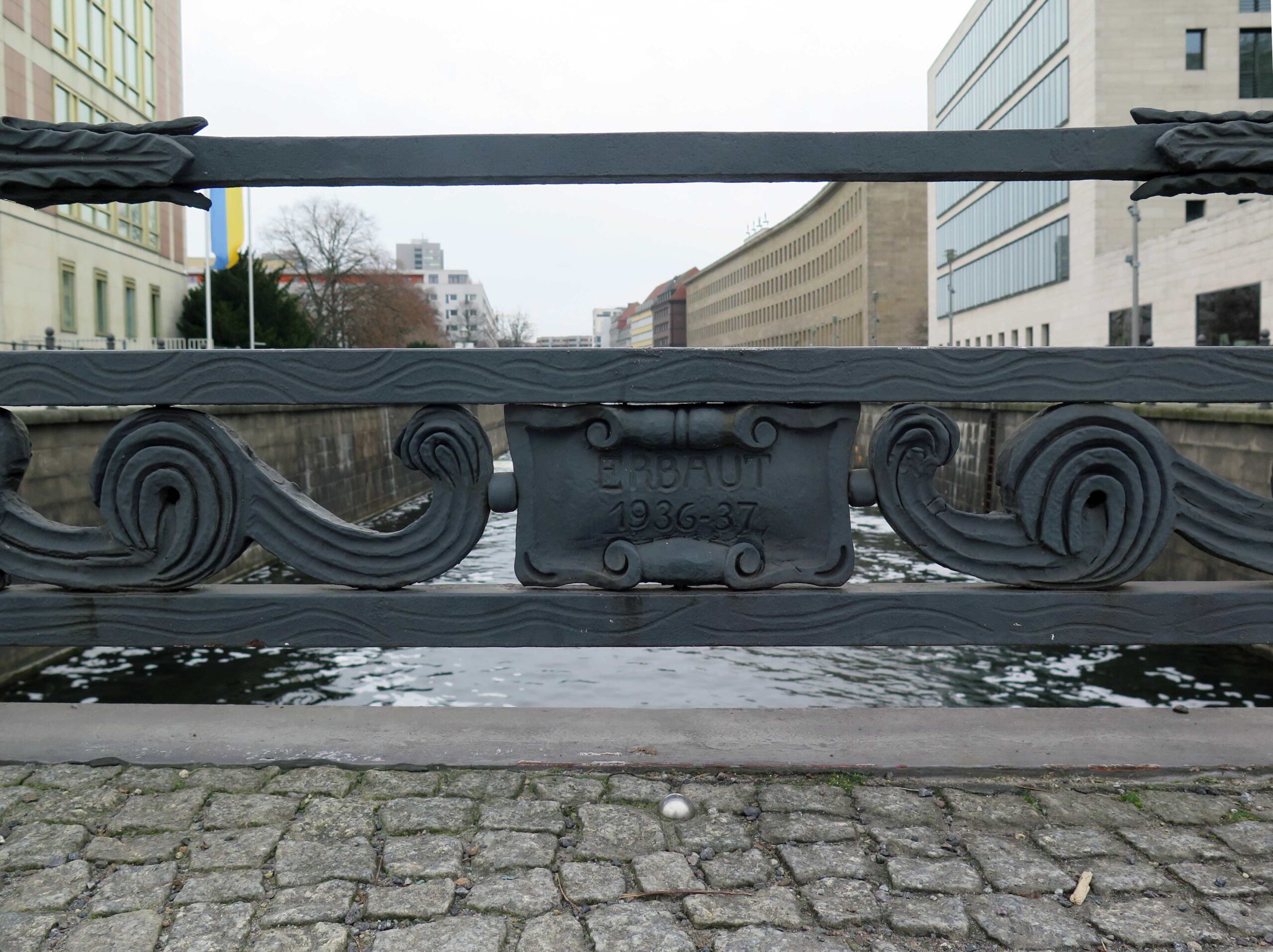 Die Schleusenbrücke verläuft über den westlichen Spreearm und verbindet die Straße Werderscher Markt mit dem Schloßplatz. Die seitlichen Geländer bestehen aus je 13 Feldern, die im oberen und unteren Bereich mit unterschiedlichen Wellenmotiven verziert sind. In die äußeren und mittleren Felder sind acht runde Medaillons mit Stadtansichten Berlins eingelassen, darunter erläutern kleine Plaketten mit vergoldeten Jahreszahlen das Jahr der Darstellung. Der Übergang zu den rechteckigen Geländerfeldern ist mit stilisierten Palmetten und Akanthusblättern gefüllt. Die Zwischenfelder sind mit waagerechten Bändern versehen. Die wasserseitigen Rückseiten der Medaillons sind mit großen stilisierten Blüten geschmückt (Nicola Vösgen).