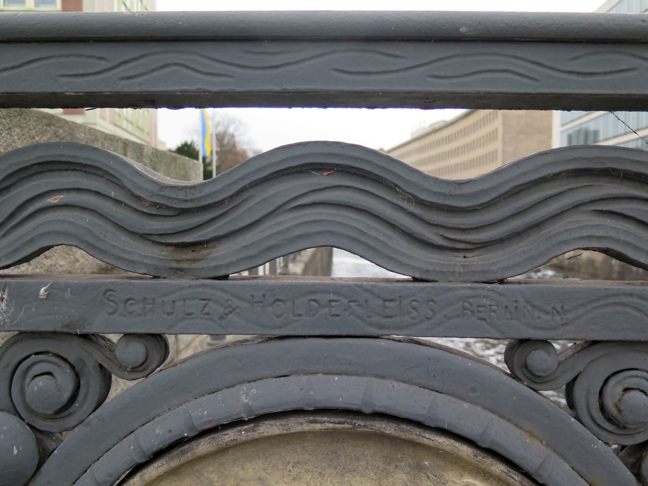 Die Schleusenbrücke verläuft über den westlichen Spreearm und verbindet die Straße Werderscher Markt mit dem Schloßplatz. Die seitlichen Geländer bestehen aus je 13 Feldern, die im oberen und unteren Bereich mit unterschiedlichen Wellenmotiven verziert sind. In die äußeren und mittleren Felder sind acht runde Medaillons mit Stadtansichten Berlins eingelassen, darunter erläutern kleine Plaketten mit vergoldeten Jahreszahlen das Jahr der Darstellung. Der Übergang zu den rechteckigen Geländerfeldern ist mit stilisierten Palmetten und Akanthusblättern gefüllt. Die Zwischenfelder sind mit waagerechten Bändern versehen. Die wasserseitigen Rückseiten der Medaillons sind mit großen stilisierten Blüten geschmückt (Nicola Vösgen).