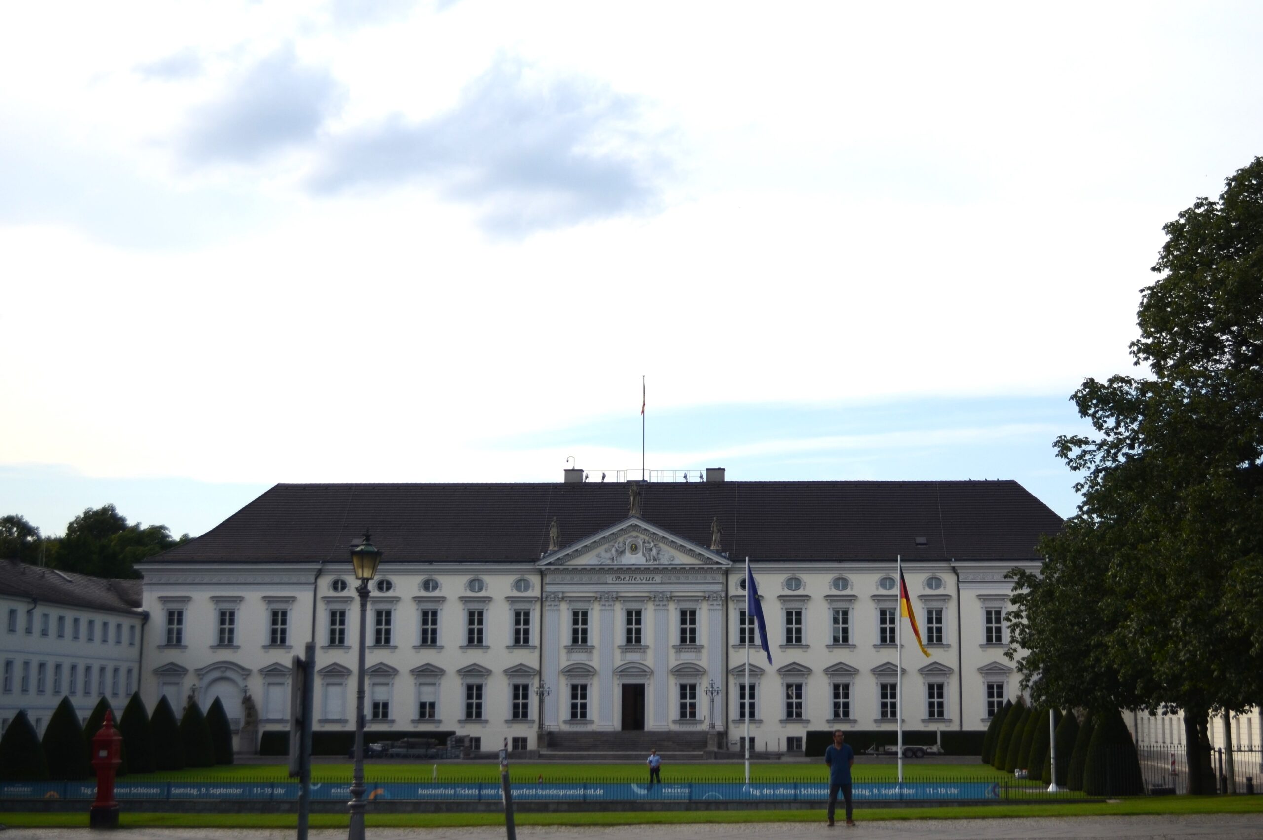 Im Auftrag Prinz August Ferdinands von Preußen errichtete der Architekt und Baumeister Michael Philipp Daniel Boumann 1785 das erste königlich-preußische Schloss in klassizistischem Stil (Vorbild: Schloss Wörlitz), wobei er sich an der Knobelsdorff-Meierei, dem Vorgängerbau von 1743, orientierte. König Friedrich Wilhelm VI. erwarb den zuvor als Sommerresidenz genutzten Bau als Krongut. 1844 wurde das Schloss als Gemäldegalerie genutzt, bevor die Kunstwerke an die Alte Nationalgalerie übergingen und die Nutzung mehrfach wechselte. 1893-1896 fanden Erneuerungsarbeiten im Außenbereich, ab 1935 auch im Innenbereich statt und das Museum für Deutsche Volkskunde wurde im Schlossbau eingerichtet. Um das Schloss als “Reichsgästehaus” zu nutzen, entstanden 1938 neben dem Walmdach (löst alte Mansarddächer ab) Erweiterungsbauten und weitere erhebliche Eingriffe unter Paul Baumgarten d. Ä.. Dieser verlegte den Haupteingang zum Mittelrisalit, wo er sich noch heute befindet (vgl. Dehio 2000, S. 424 f.) Im Zweiten Weltkrieg wurde der Hauptbau stark zerstört; die Seitenflügel waren weniger betroffen. Beim Wiederaufbau 1954-1959 unter Leitung von Carl Mertz wurde abermals versucht, repräsentative Innenräume zu gestalten, da das Schloss Bellevue der Berliner Amtssitz des Bundespräsidenten werden sollte. Mit Entwürfen von Carl-Heinz Schwennicke und ab 1987 durch Otto Meitingers Gestaltung im klassizistischen Stil erfolgten weitere Um- und Wiederherstellungsarbeiten (vgl. Denkmaldatenbank Berlin: https://denkmaldatenbank.berlin.de/daobj.php?obj_dok_nr=09050346) Seit 1998 erfüllt das Schloss Bellevue als Sitz des Bundespräsidenten seine heutige Funktion (Layla Fetzer).