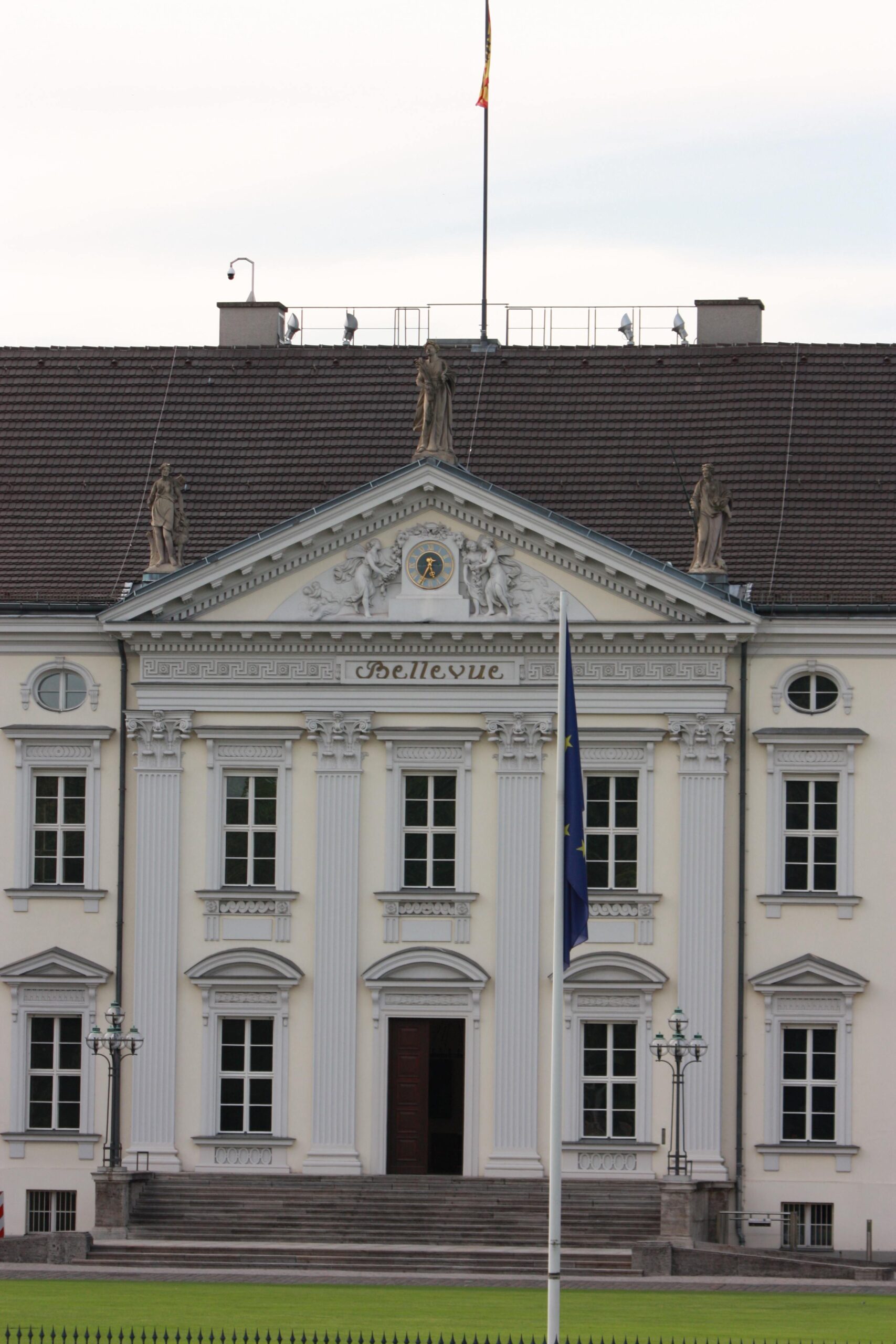 Das Schloss Bellevue befindet sich im nördlichen Teil des Tiergartens auf dem Gelände der ehemaligen Knobelsdorff-Meierei (1743). Es handelt sich um eine Dreiflügelanlage im klassizistischen Baustil mit verputzten Fassaden und Walmdach (urspr. Mansarddach). Der Mittelbau hat zwei Voll- und zwei Halbgeschosse und ist durch drei schwache Risalite vertikal gegliedert. Der Mittelrisalit ist dreiachsig und von drei korinthischen Pilastern gegliedert. Im Giebeldreieck über der Mittelachse befindet sich eine Uhr, geschmückt von einem figürlichen Relief. Auf dem Giebel befinden sich drei Standfiguren aus Sandstein, Personifikationen der Jagd, des Ackerbaus und der Fischzucht (v.l.n.r.). Die seitlichen Risalite haben keine Schmuckelemente, ausgenommen der ornamental mit griechischen Fries gestalteten Gebälkzone. Über dem Gebälk des Mittelrisalit ist in goldenen Lettern der Namenszug “Bellevue” zu lesen. Dieser wird von einem Stuckrahmen hervorgehoben.