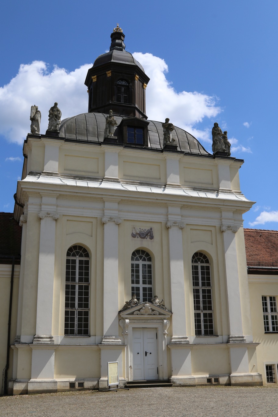 Auf der Schlossinsel Köpenick steht östlich gegenüber vom Schloss Köpenick die Schlosskirche. Über einem annähernd quadratischen Grundriss erhebt sich der barocke Zentralbau mit dreiseitigem Chor. Zu beiden Seiten erstrecken sich die ehemaligen eingeschossigen Wirtschaftsgebäude. Die gliedernden Elemente des verputzten Mauerwerksbau bestehen aus Sandstein. Die symmetrische dreiachsige Fassade ist durch vier ionische Pilaster auf hohen Sockeln gegliedert. Das geschwungene Pyramidendach trägt eine achteckige hölzerne Laterne, die mit Schweifhaube, Kinne und Kreuz abgeschlossen ist (Nicola Vösgen).
